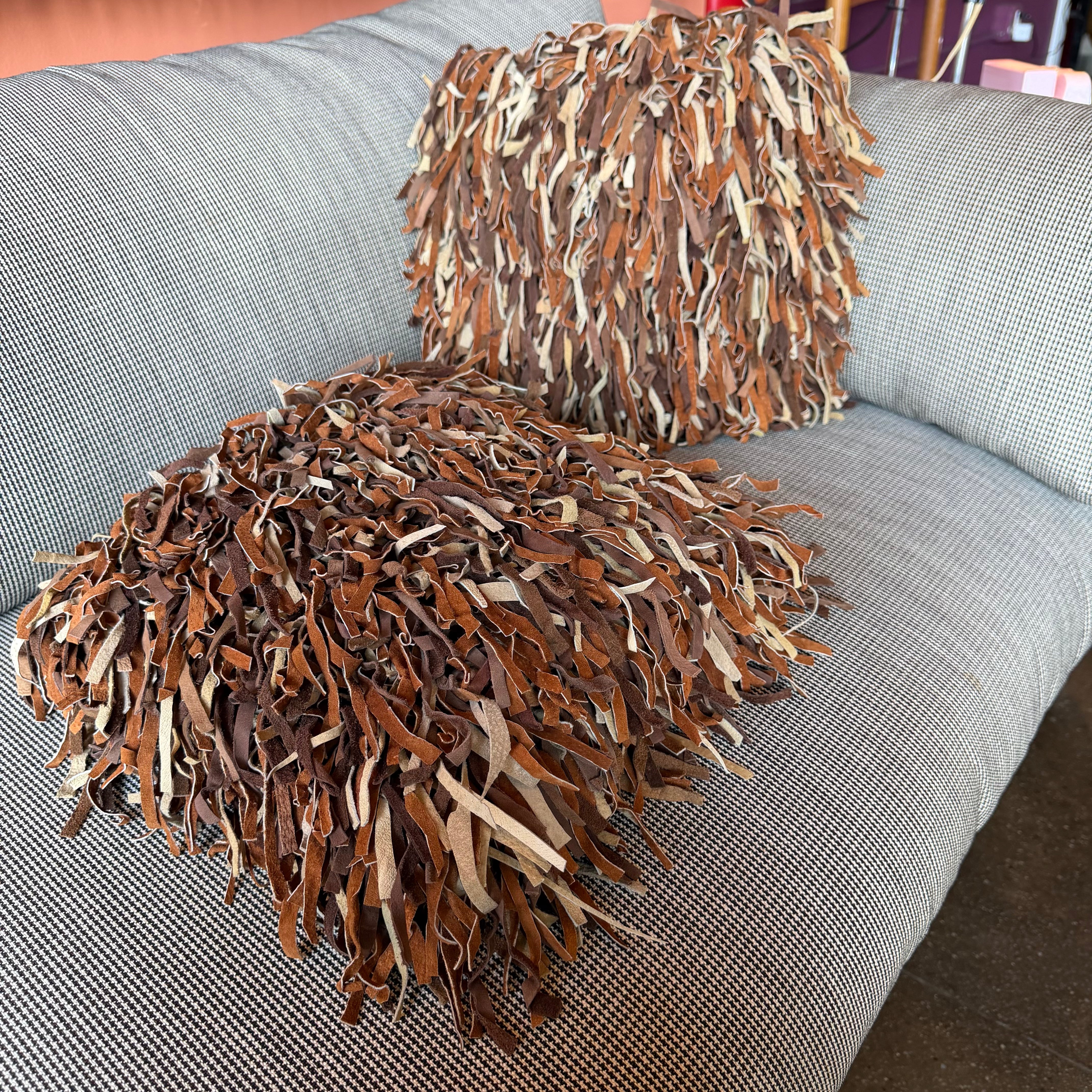 Vintage small square pillow with leather strip shag in different shades of brown/tan. Back in solid suede fabric with hidden zipper. Adds interest and texture to any space.