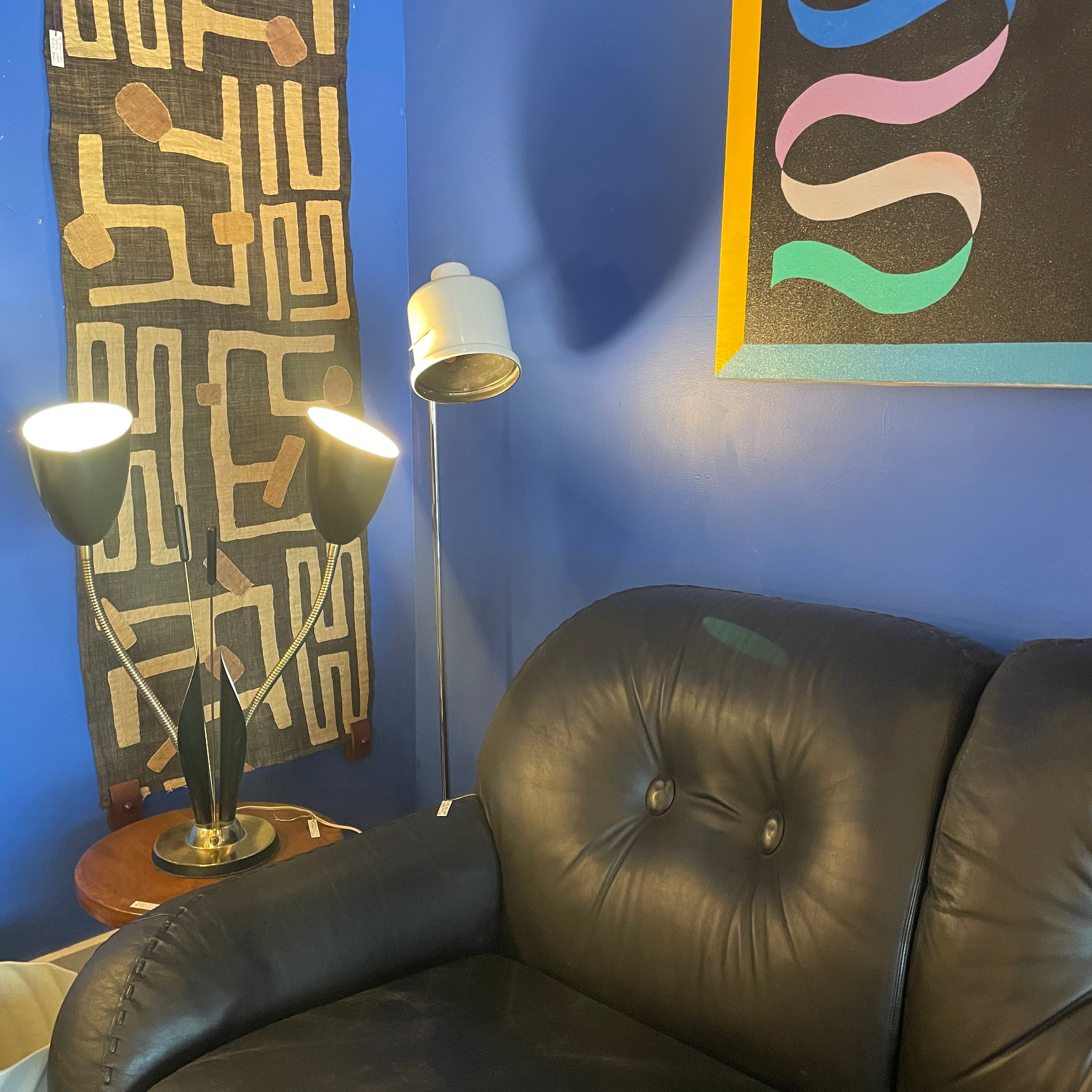 Beautiful MCM Brass + Enamel Calla Lily Lamp with 2 shades on adjustable brass necks. Each side switches on individually, for varied lighting.