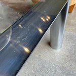 Condition is great, with some slight scuffing, primarily in one spot. Also one cup mark on top steel border...all shown in closeups. Glass has one minor chip to corner, which is fully hidden underneath table.