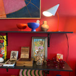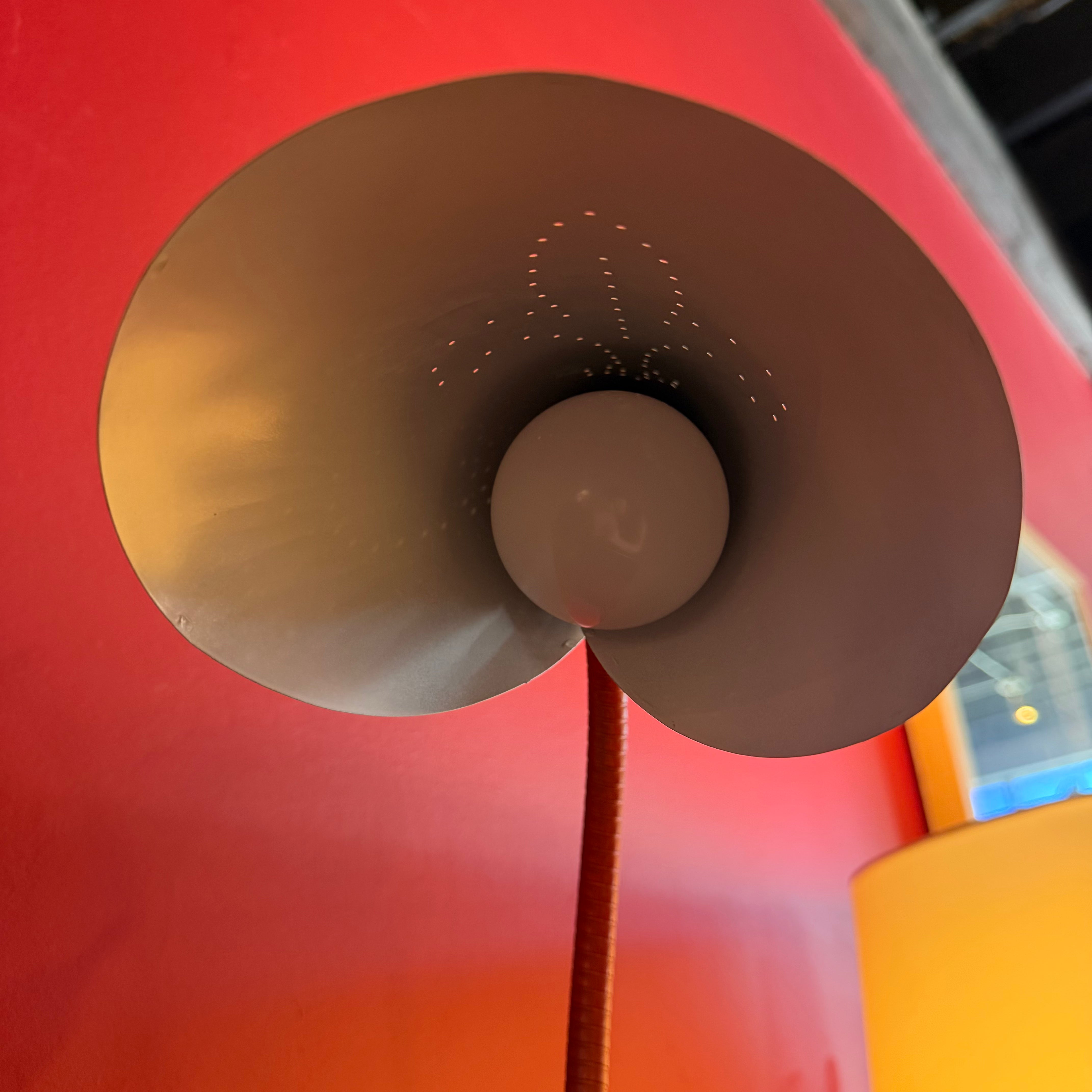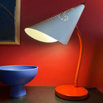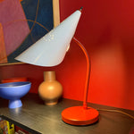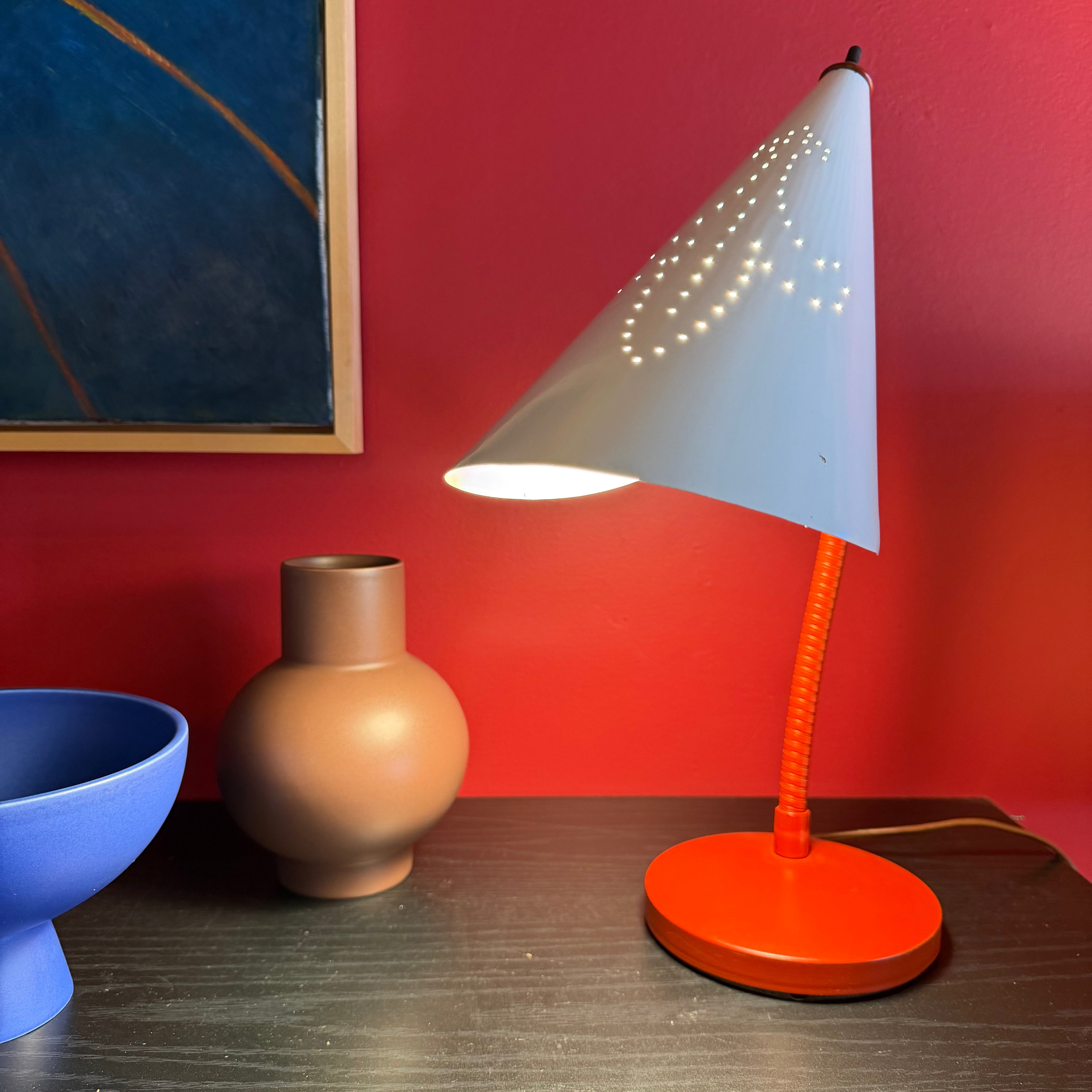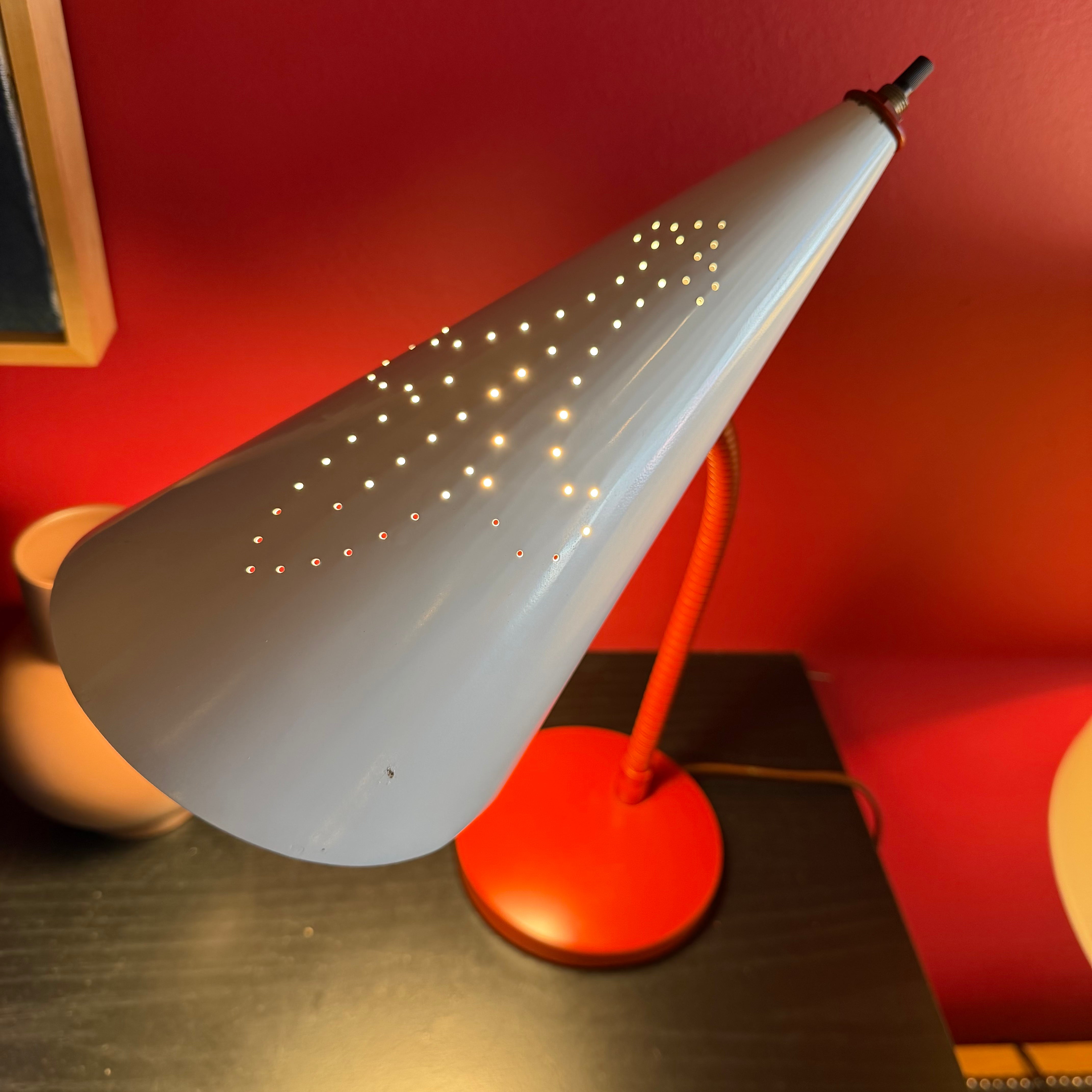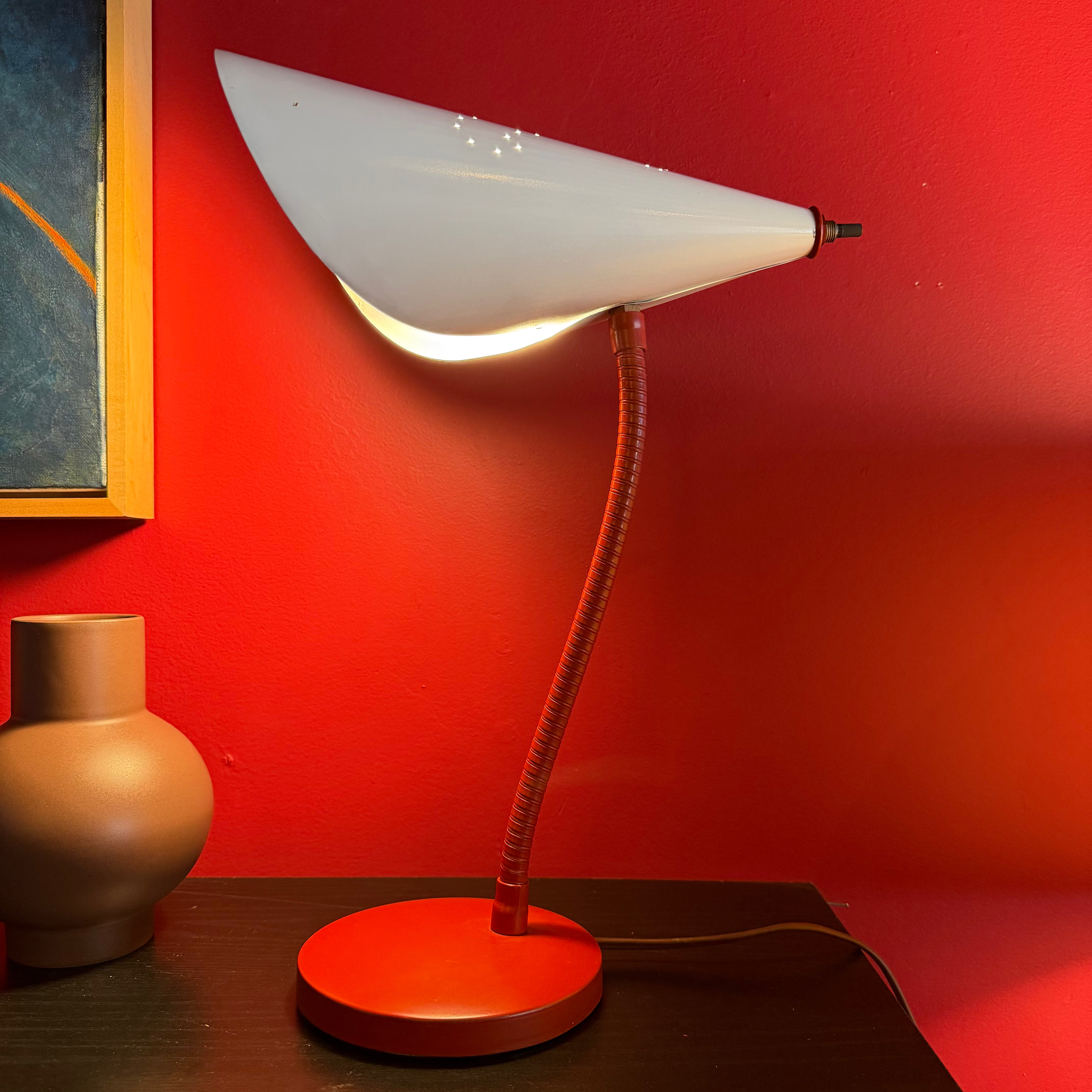 Charming red + white mid-century "nun" desk lamp with perforated shade and articulating goose neck. Great for a workspace or as shelving accent lighting.