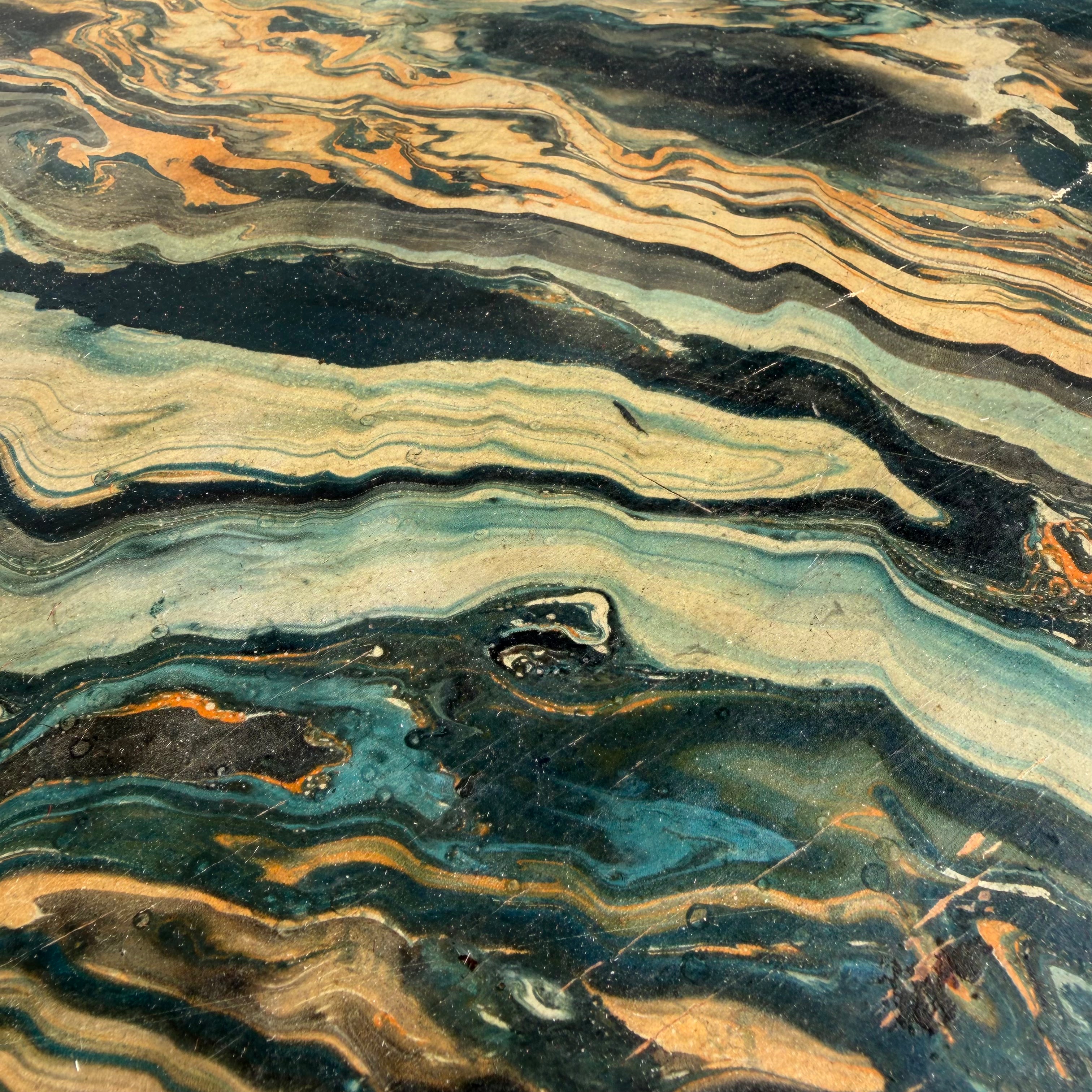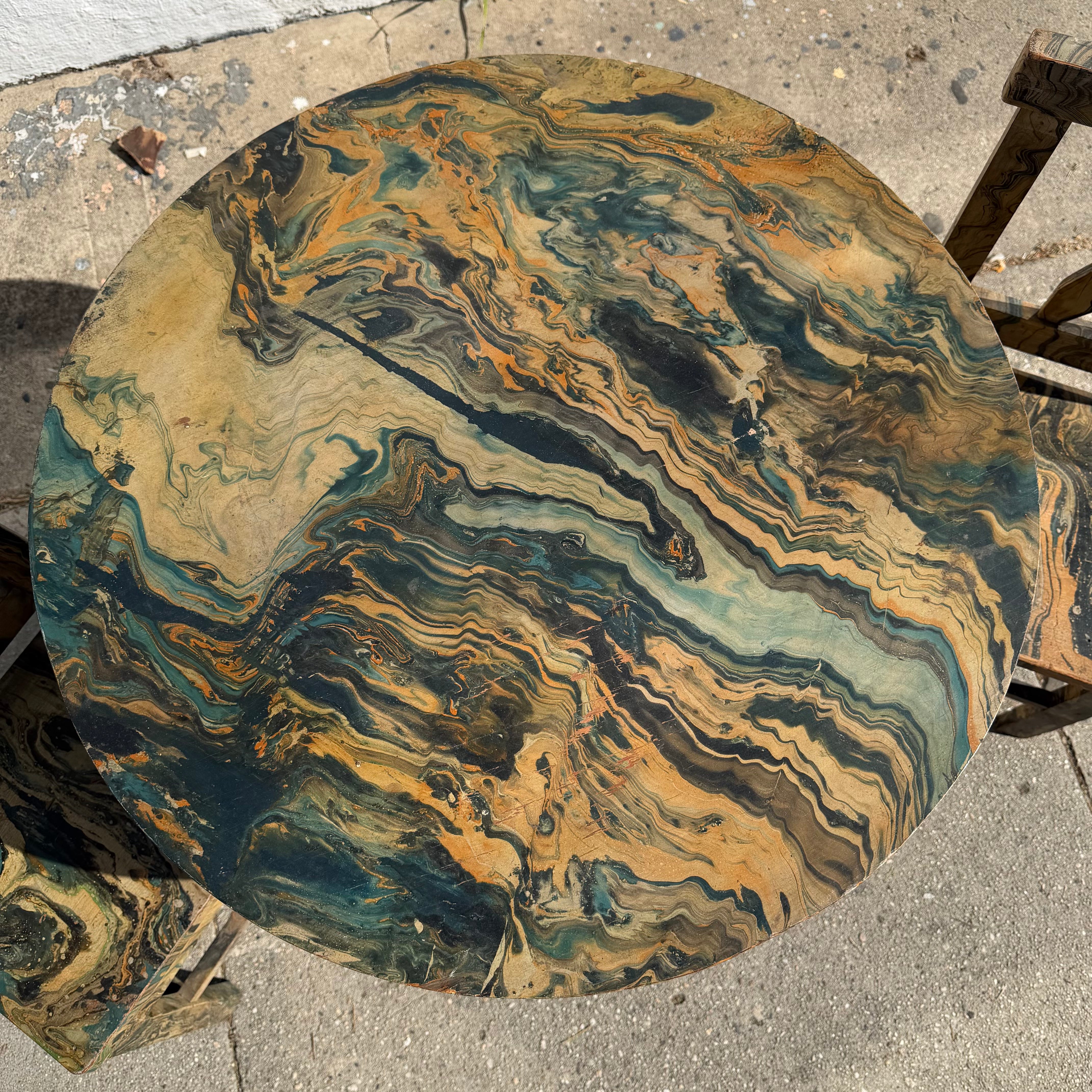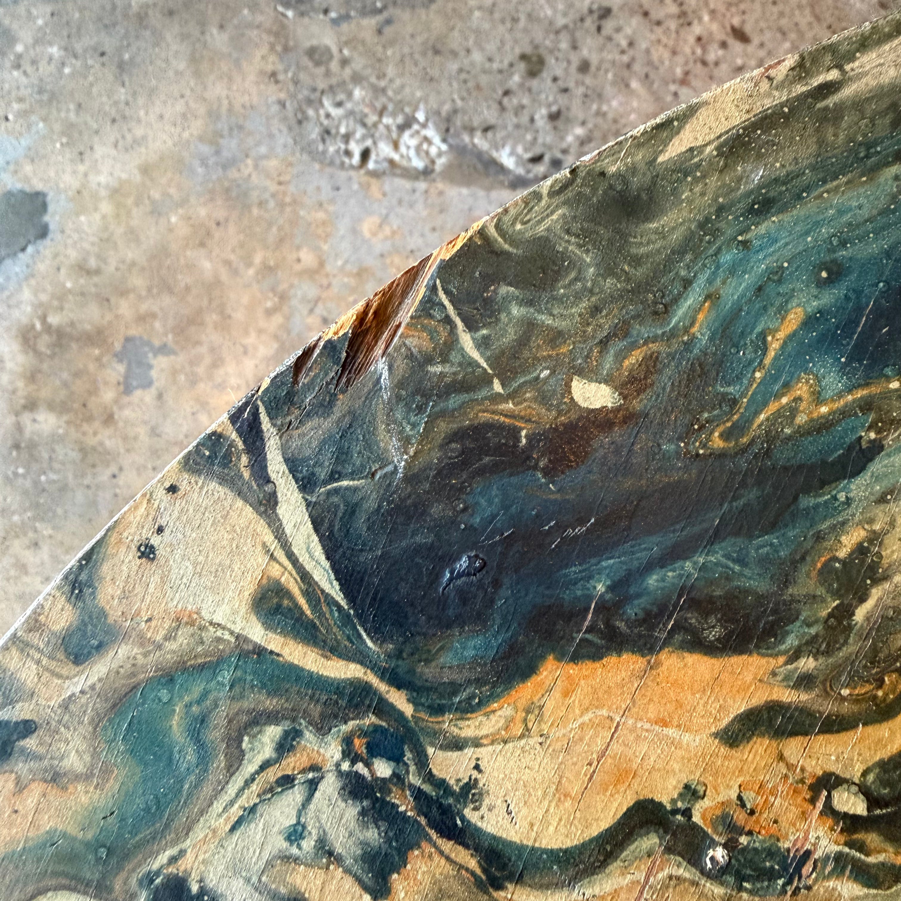 Wooden kids dining table + 2 chair set with beautiful marbled paper overlay in black, green, blue + orange. Extremely sturdy construction... can take a beating :) Unknown maker, likely a one off...very special!!