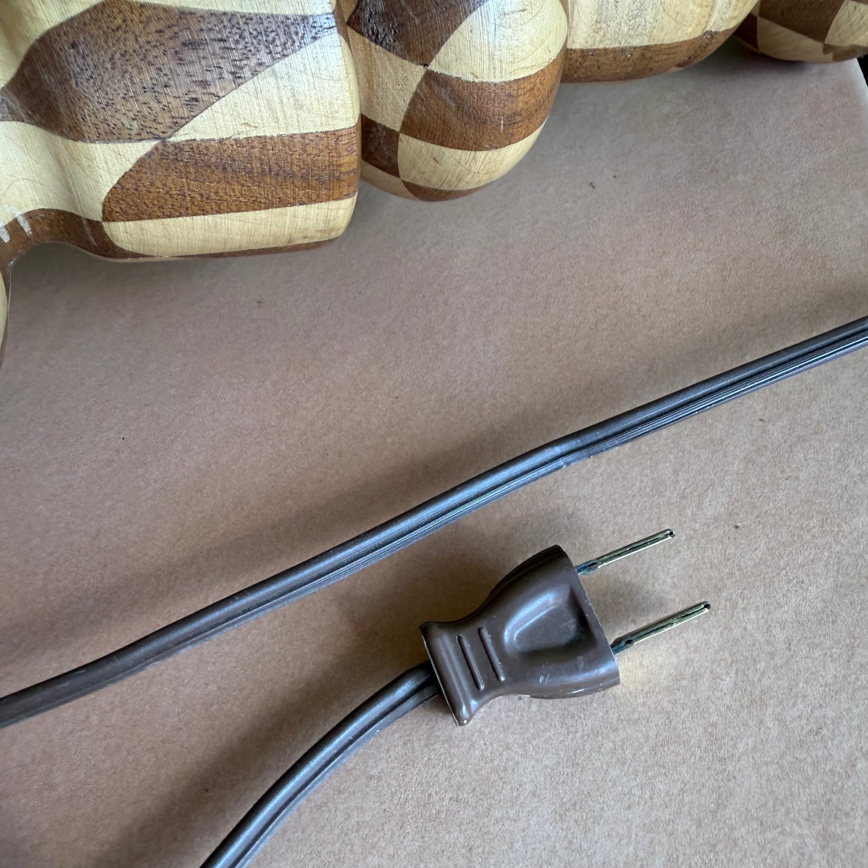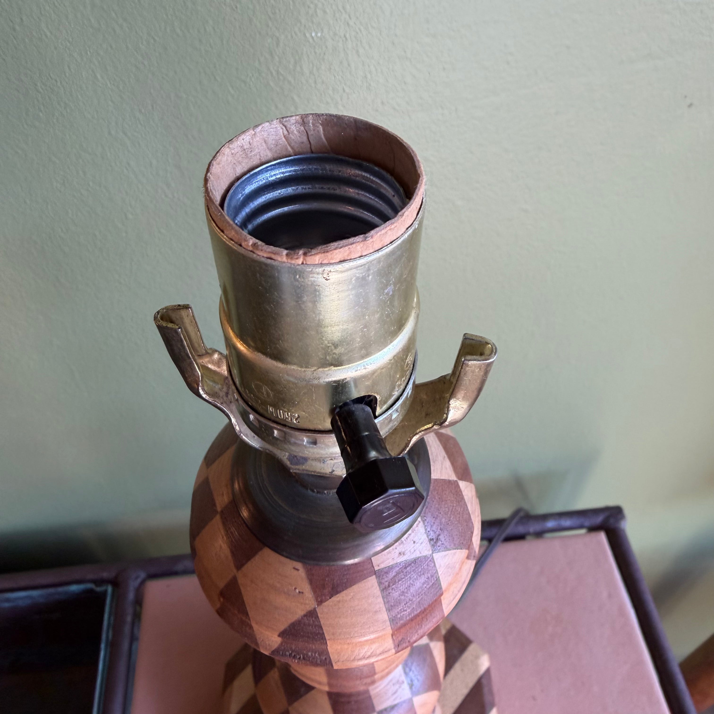 Stunning wooden table lamp featuring in-laid marquetry with geometric checked pattern.