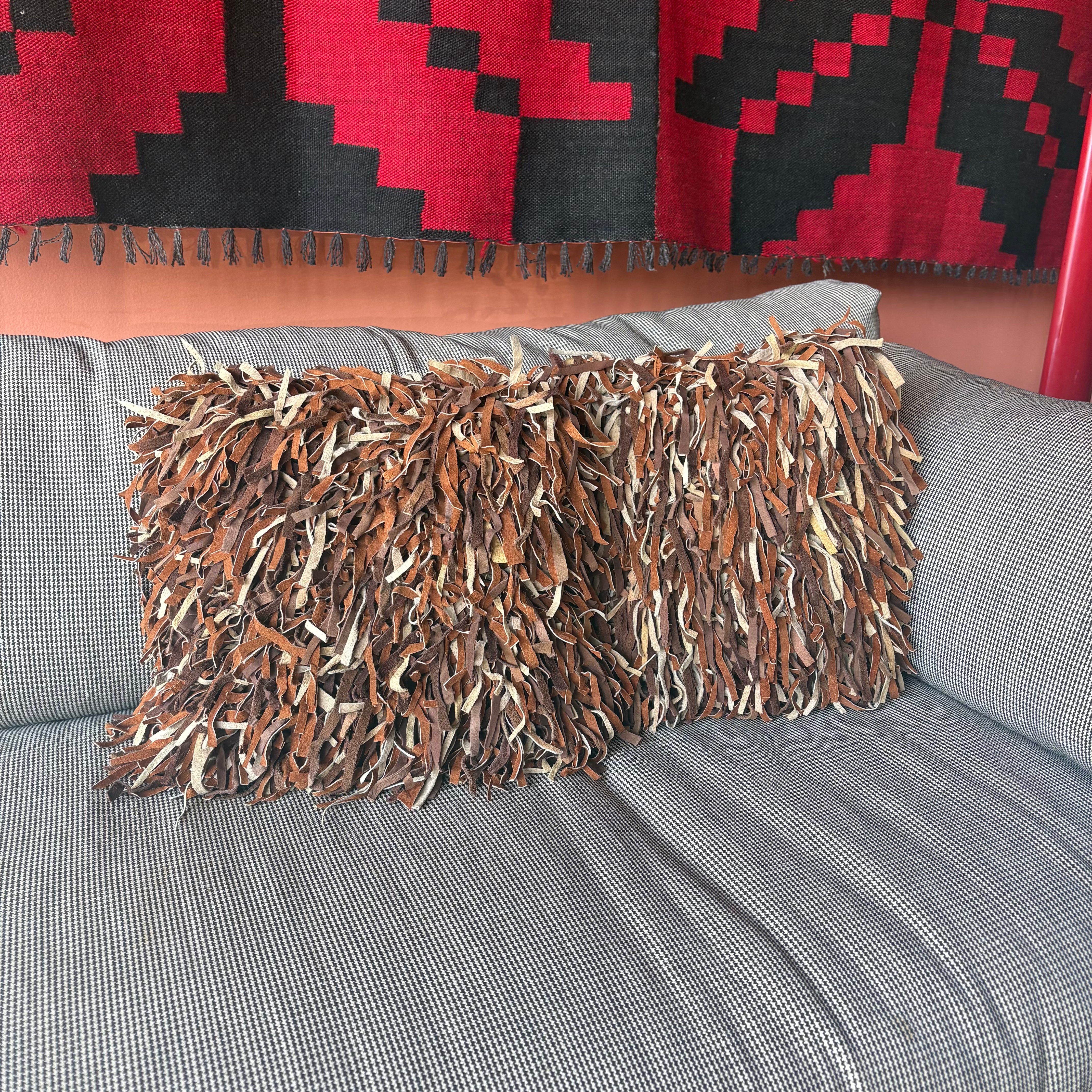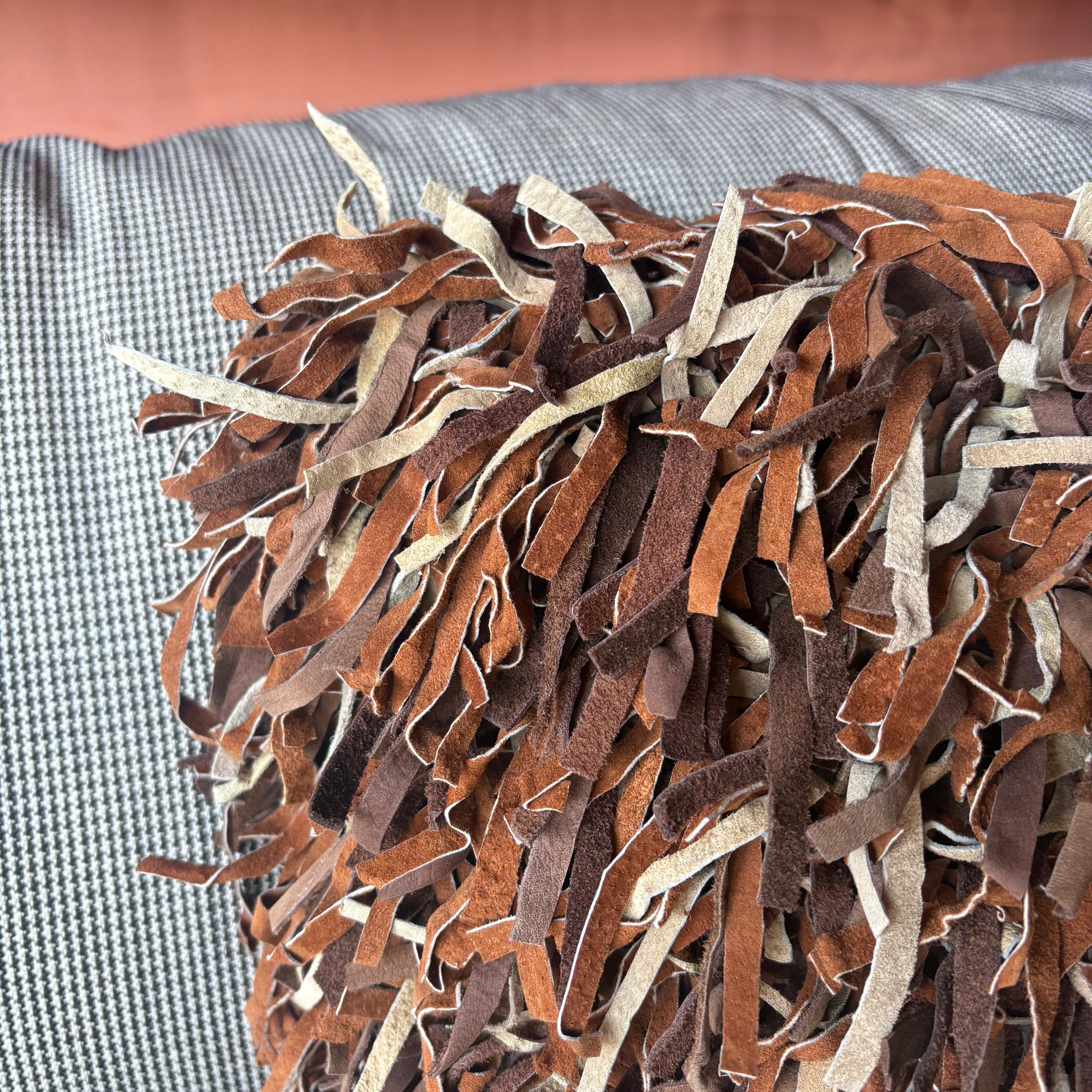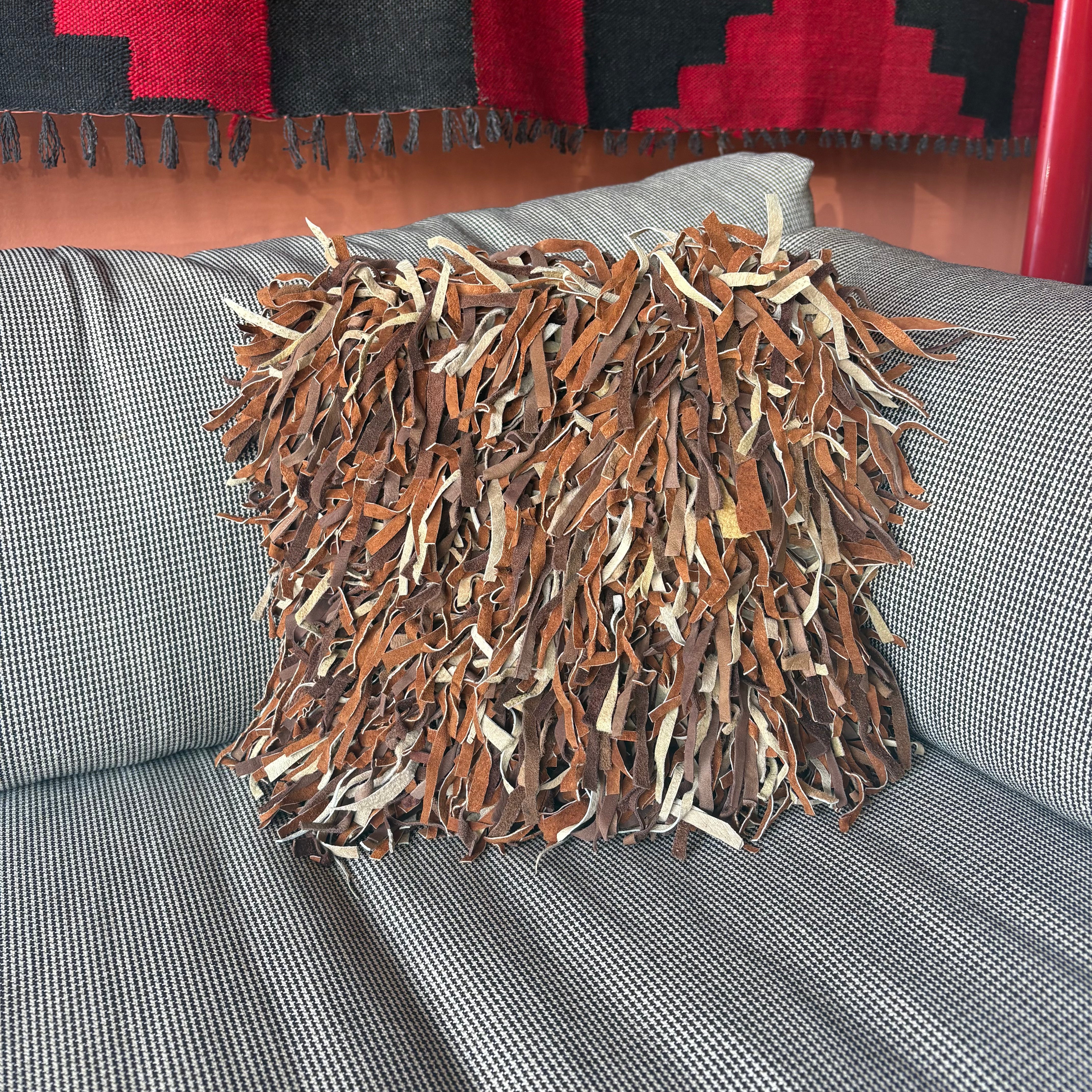 Vintage small square pillow with leather shag in different shades of brown/tan. Back has solid beige fabric with hidden zipper. Adds interest and texture to any space.