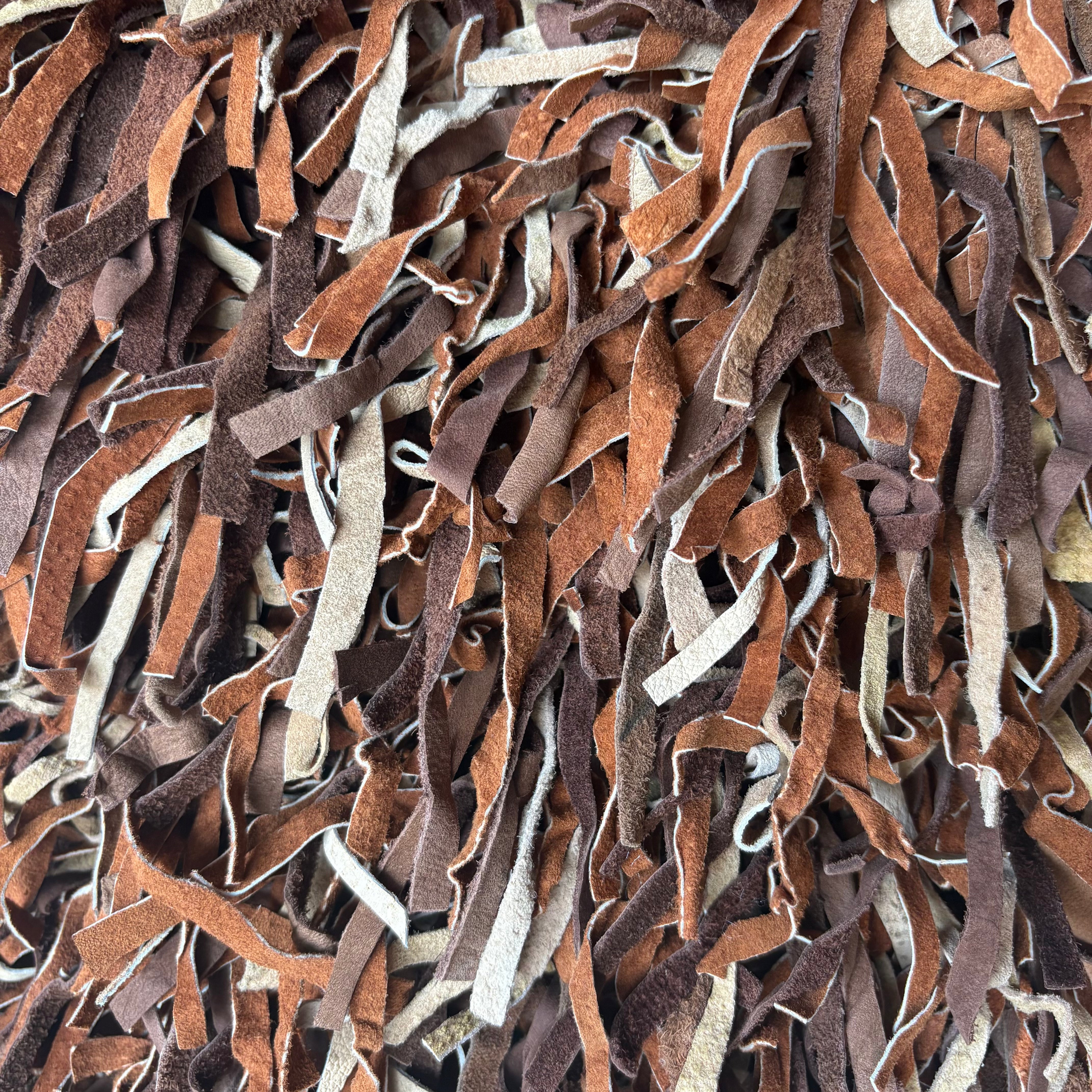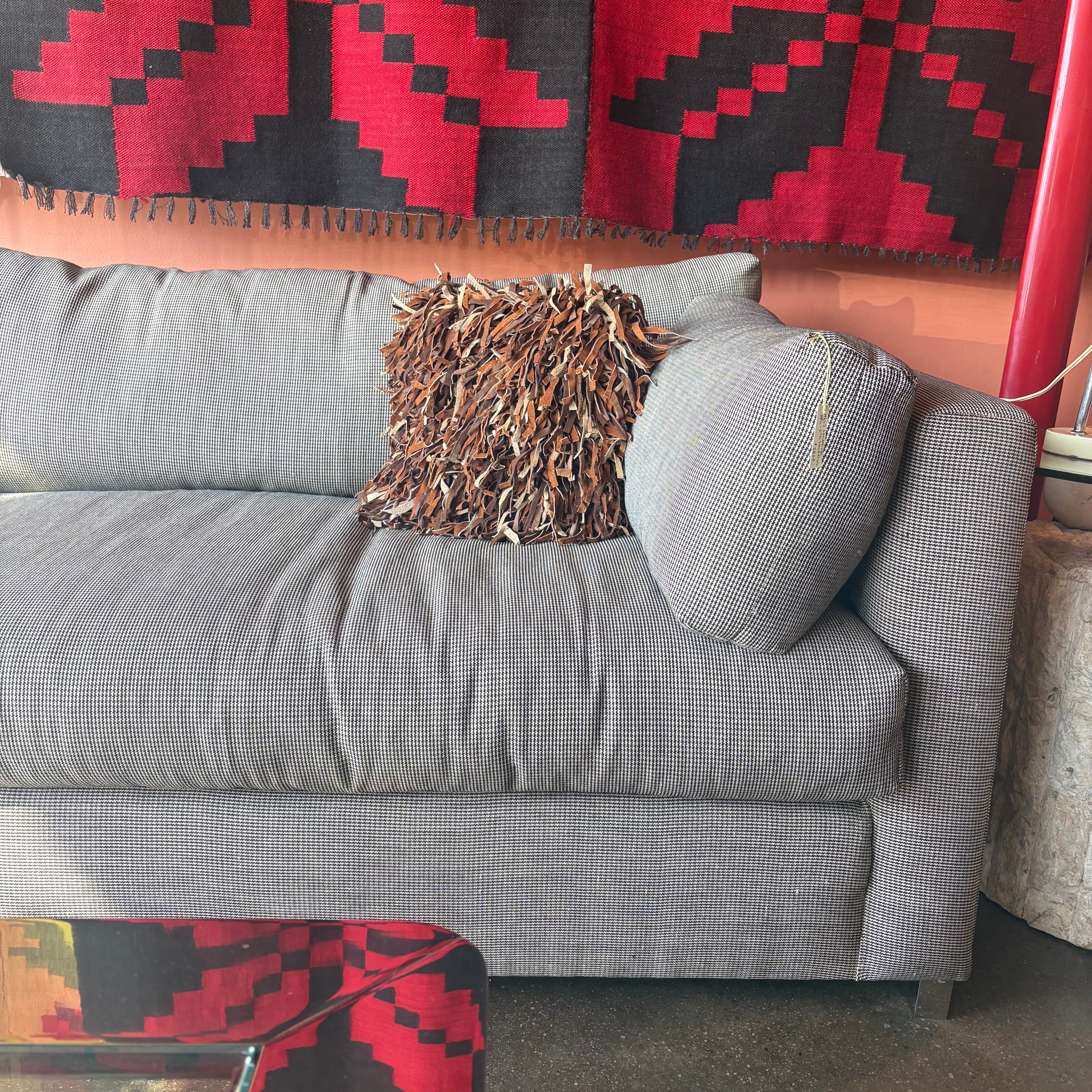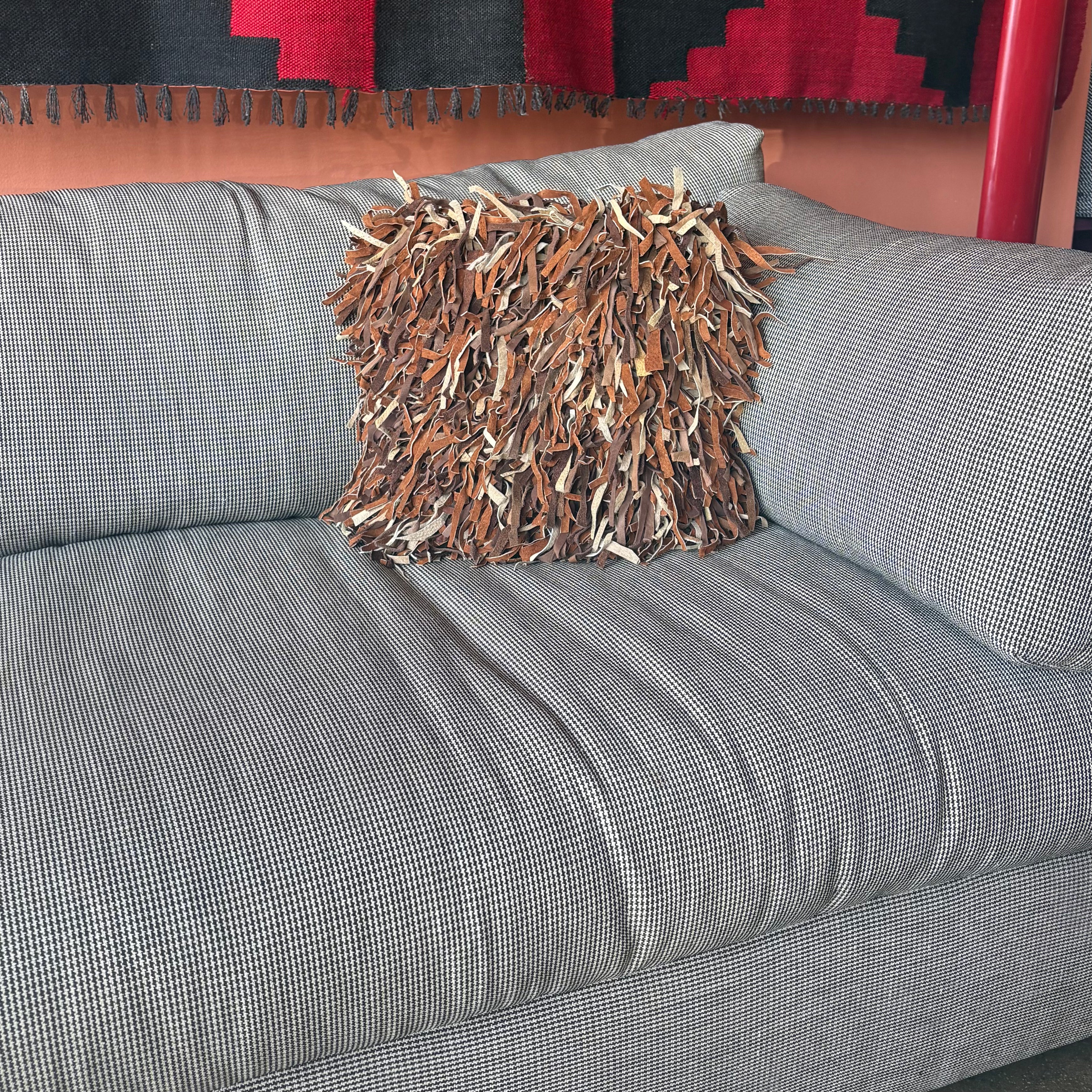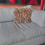 Vintage small square pillow with leather shag in different shades of brown/tan. Back has solid beige fabric with hidden zipper. Adds interest and texture to any space.