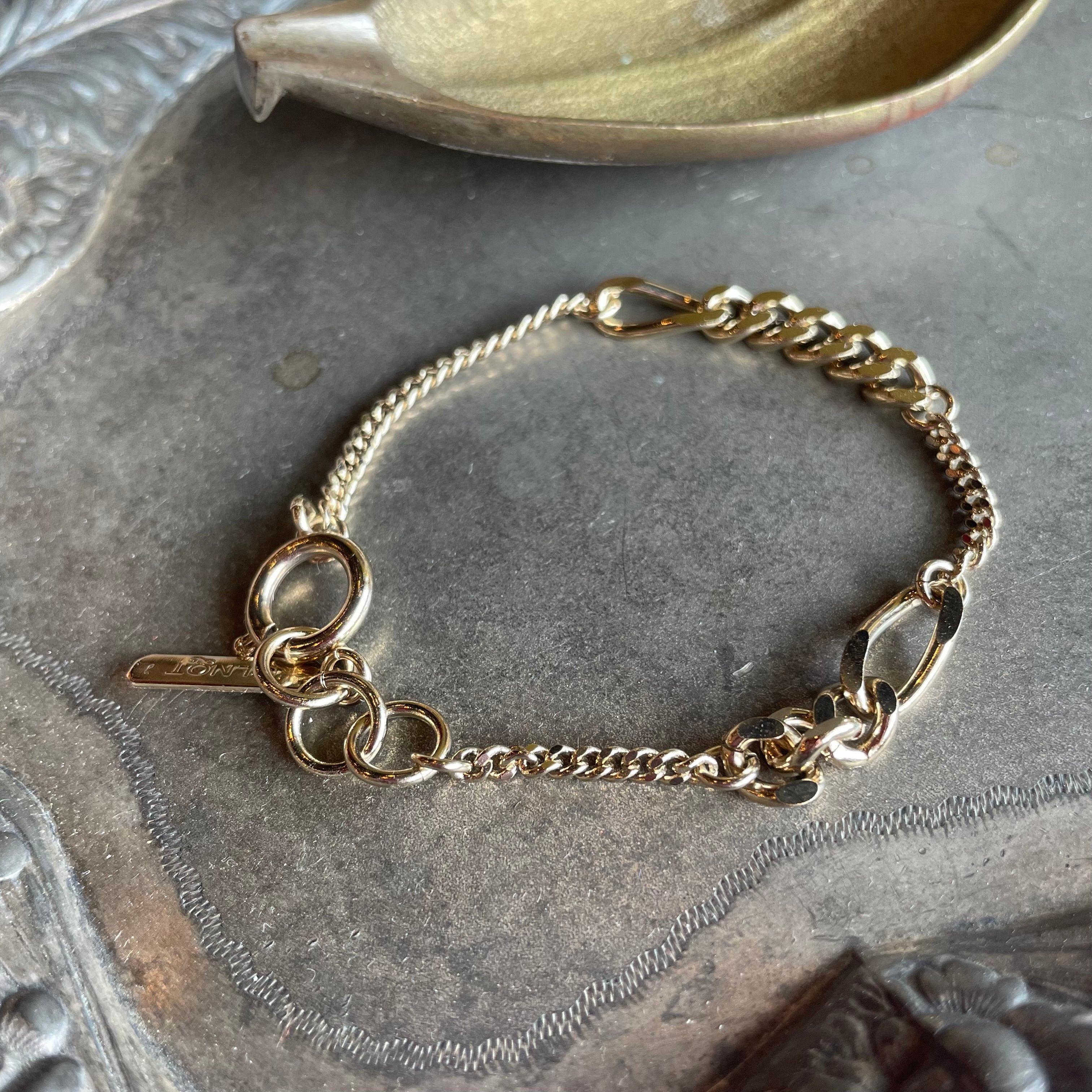 A minimal linked bracelet featuring contrasting chain styles. A subtle yet distinctive statement piece. Spring-ring clasp. Genderless design.