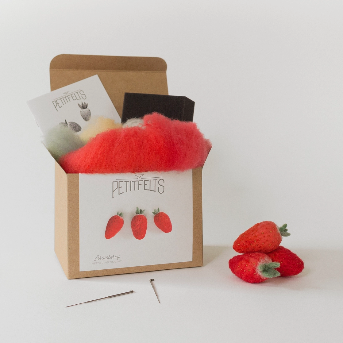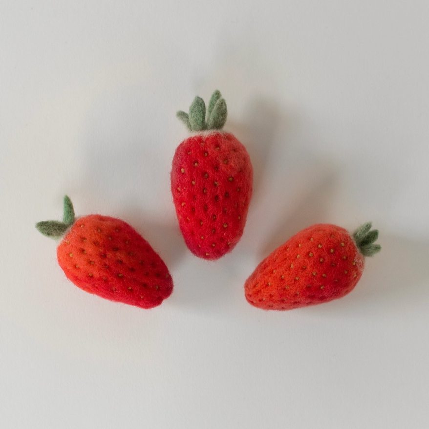 Each kit includes enough wool to make 3 strawberries, each approximately 2 1/2 inches tall.