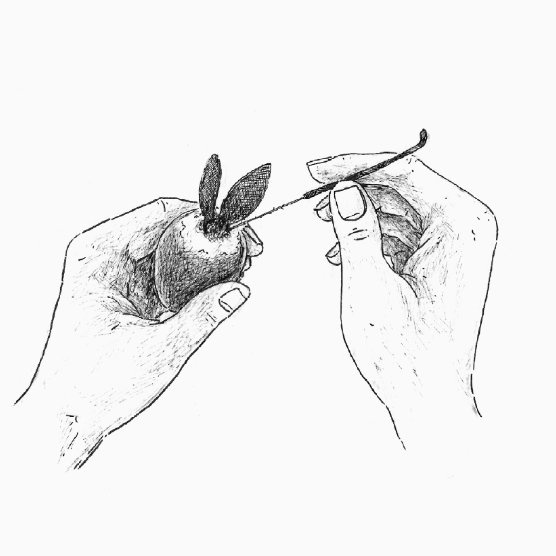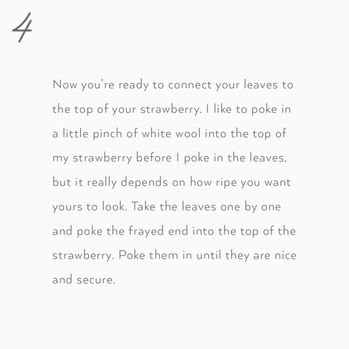Needle felting is a process in which barbed needles are used to sculpt wool fiber into various forms. There is absolutely no sewing and no use of wires or armatures of any kind in this kit. The completed strawberries will be solid wool.