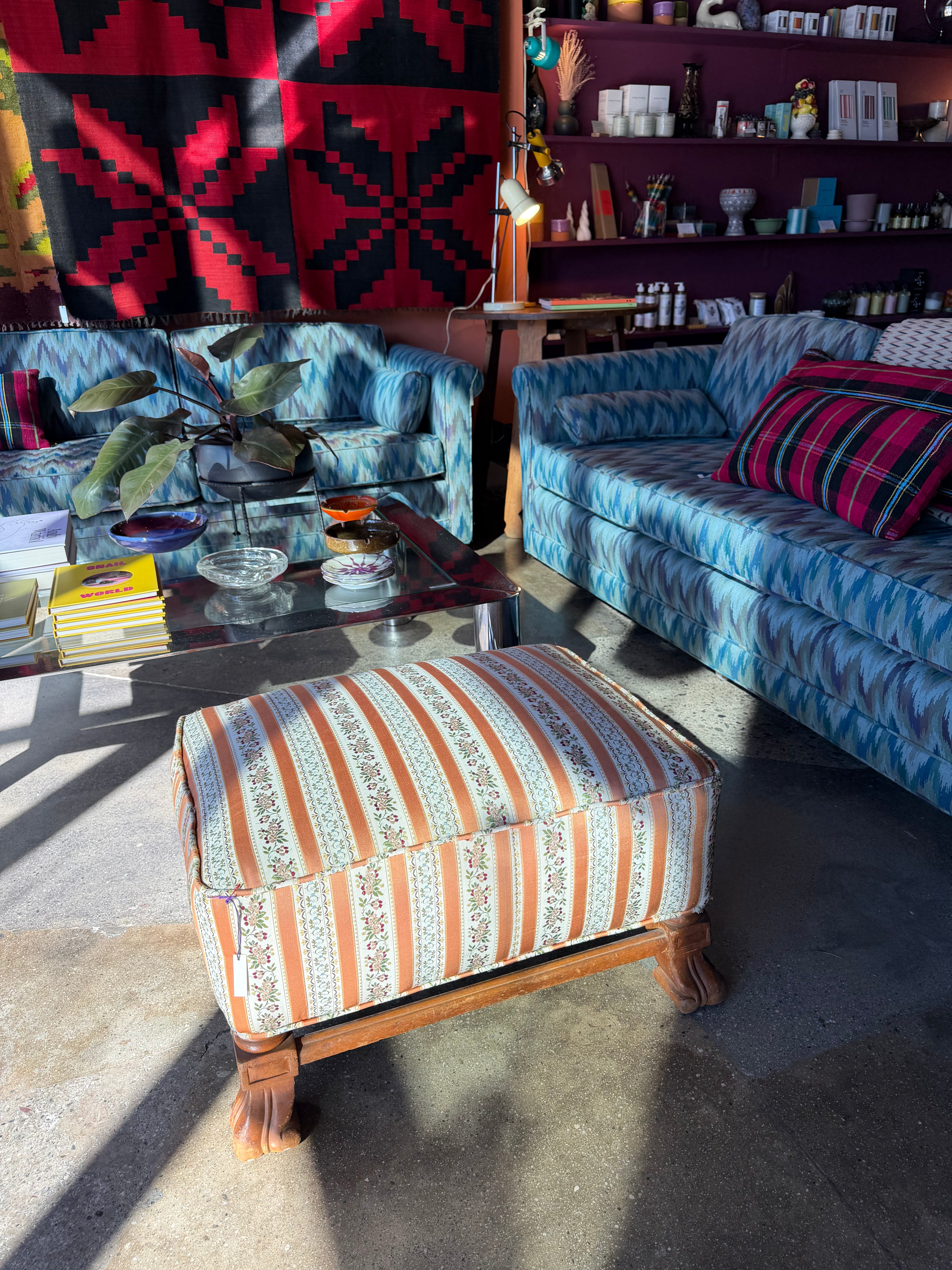 Beautiful silk striped floral upholstered ottoman with claw foot detail from the early 1900's. Sourced from an estate in Altadena.