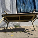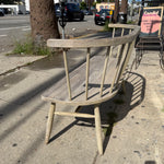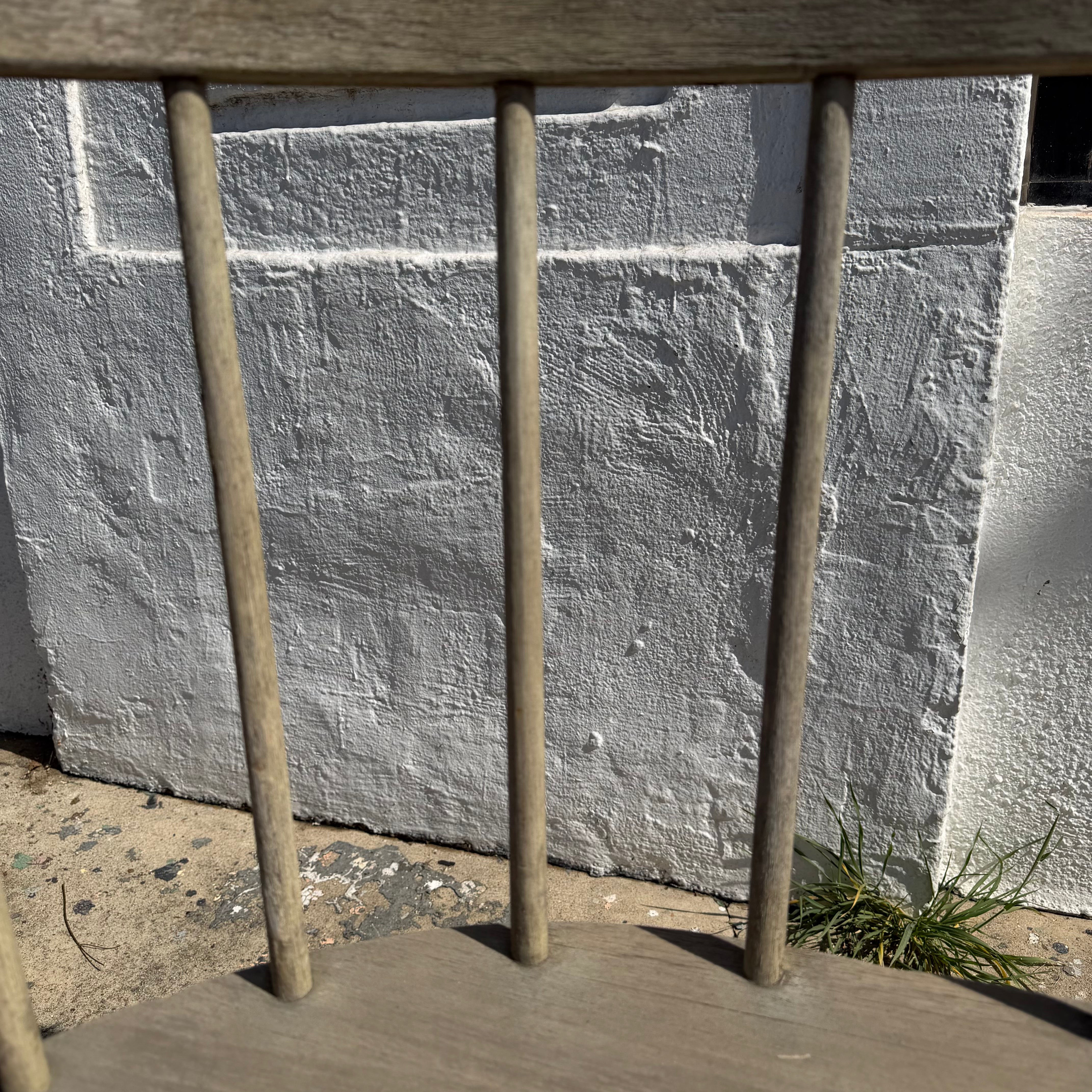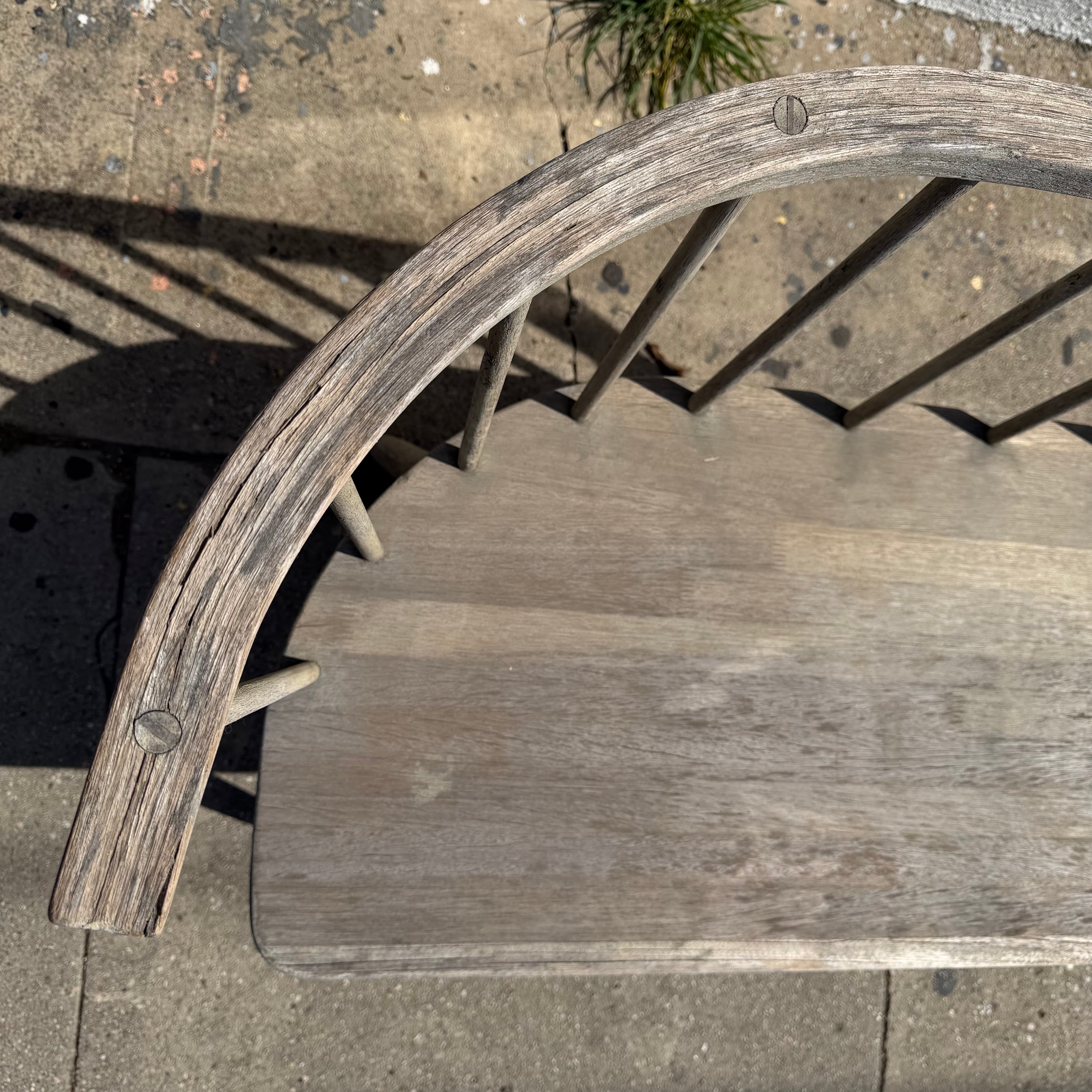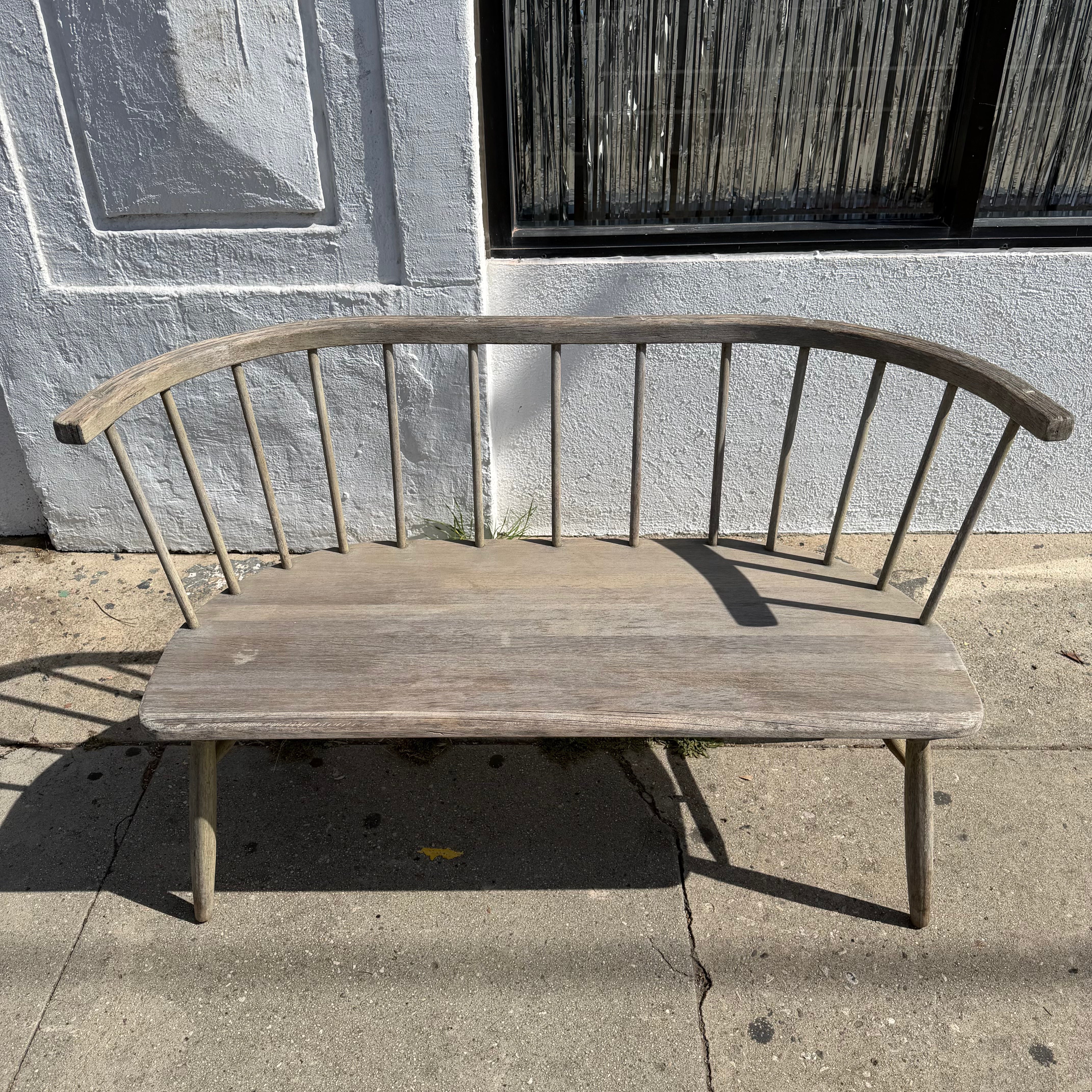 Curved Spindle Back Windsor Bench in solid wood, great for indoor or covered outdoor. Very sturdy and well made, with some slight chips/marks throughout but overall in great condition and ready to take home!