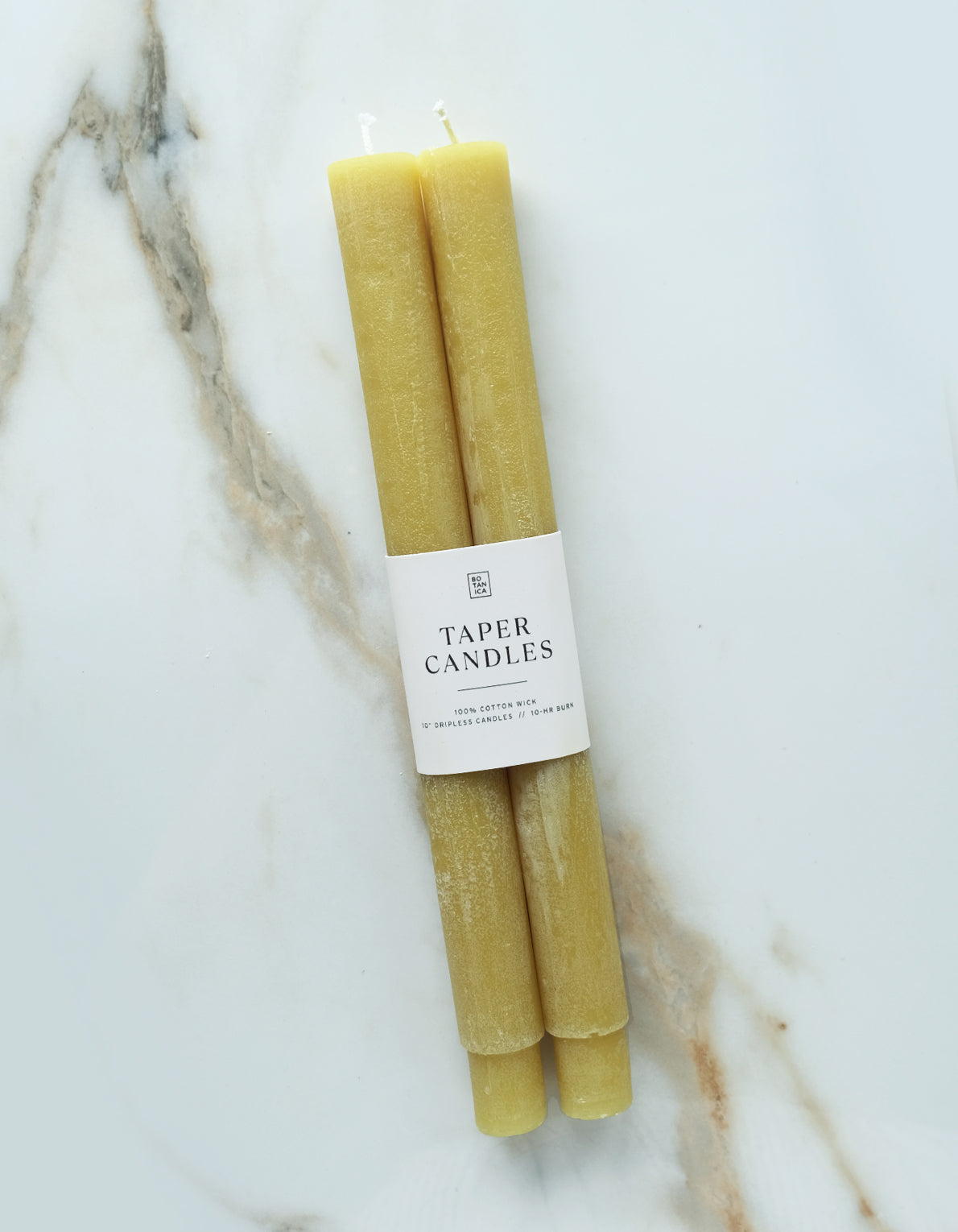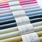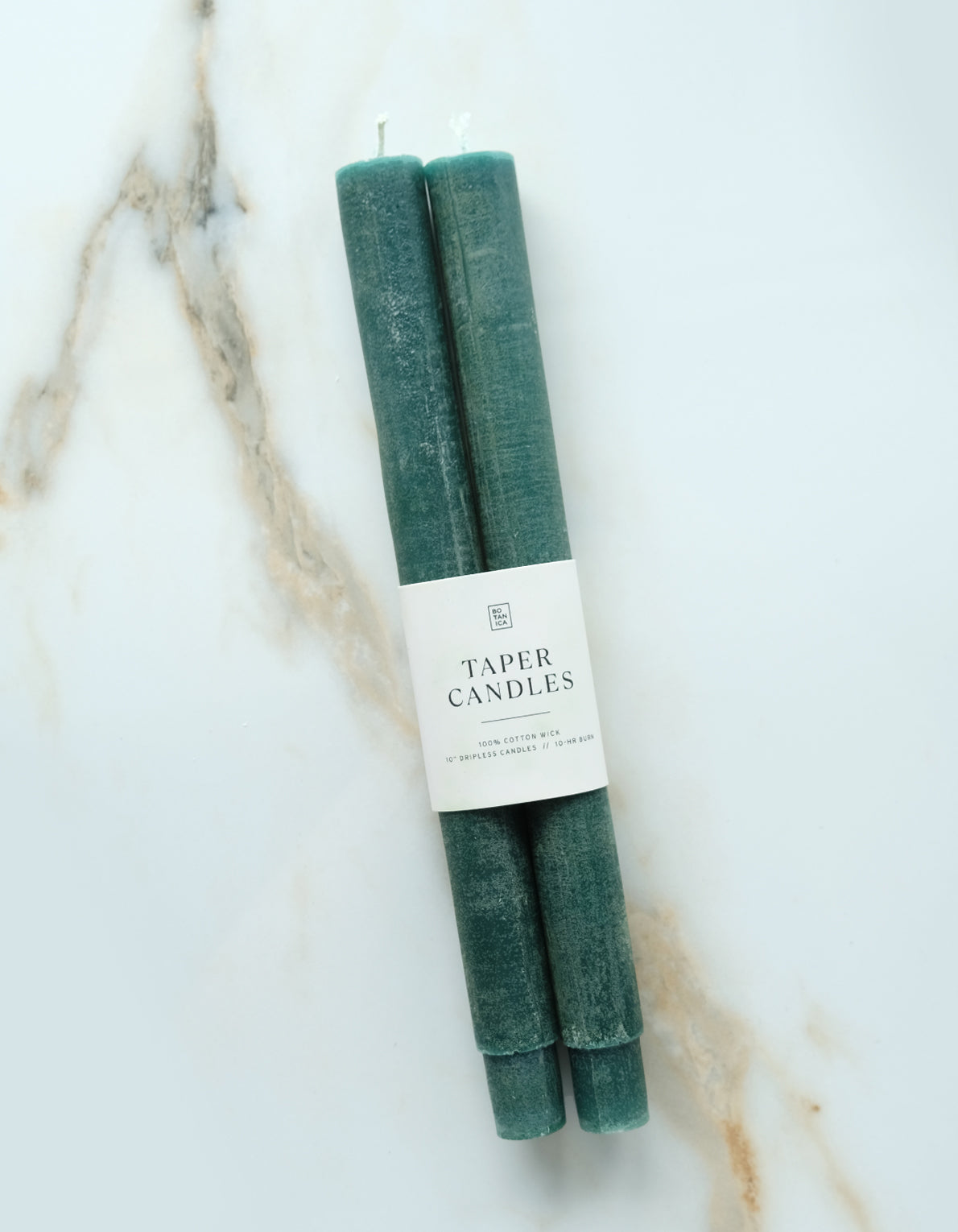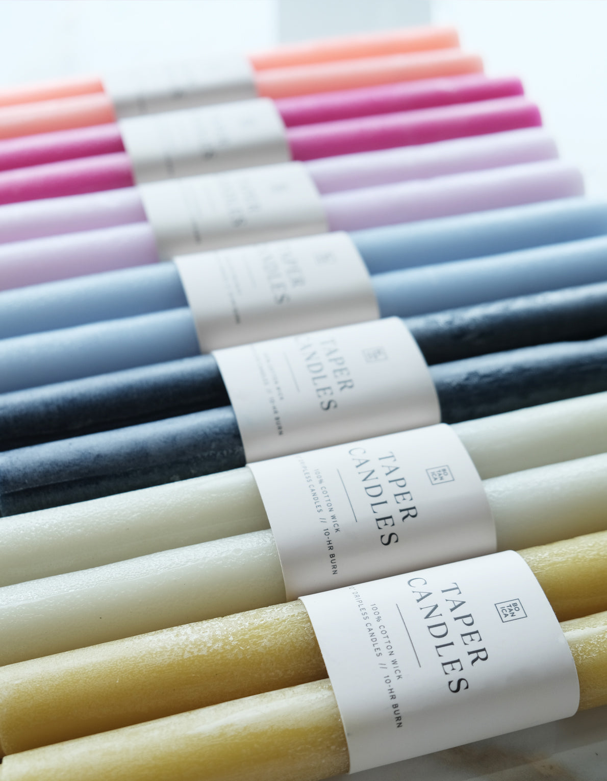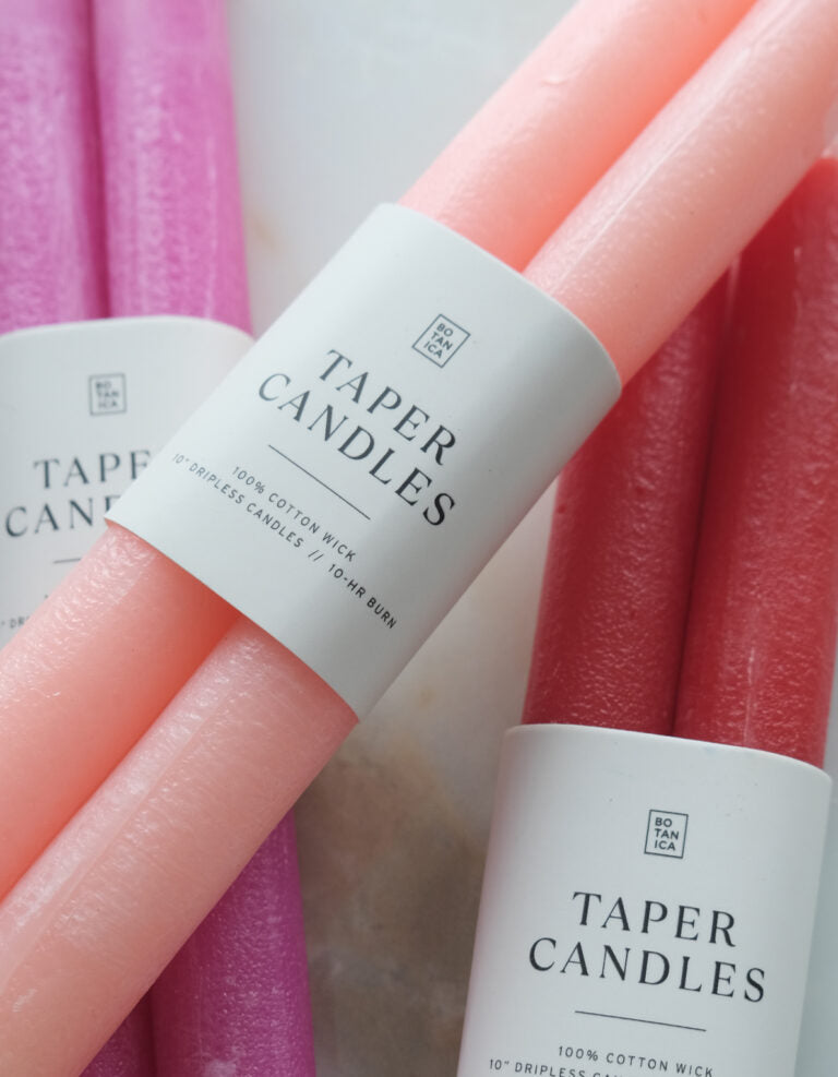 Botanica taper candles pairs are hand-dyed in an array of classic and sophisticated shades. Each candle is 7/8″ diameter, and burns for approximately 10 hours.