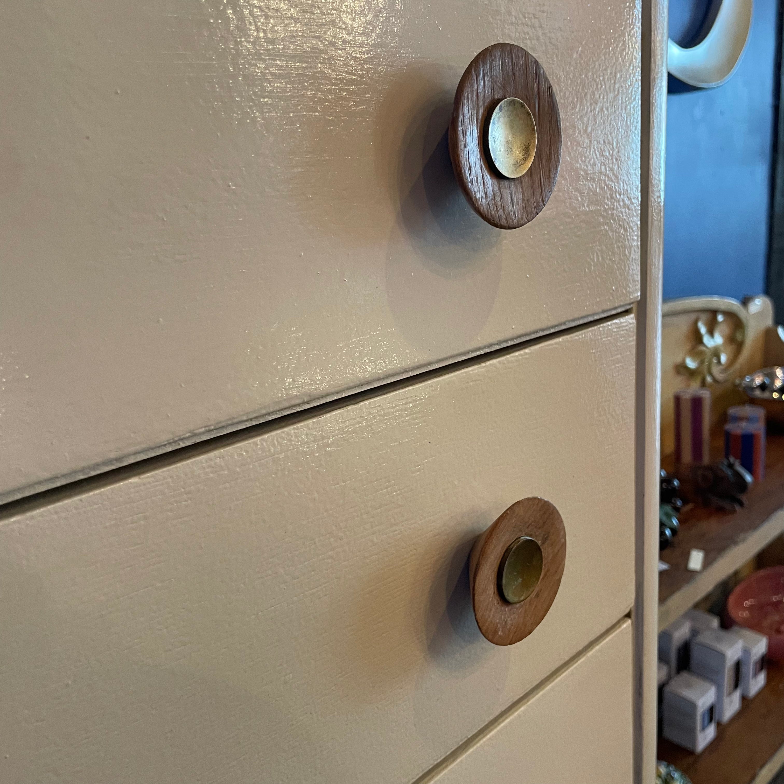 Beautiful tallboy 6 drawer dresser, designed in the 1940's by Morris Sanders for his "Module" line produced by Mengel. Oak wood painted in off-white lacquer for a subtle shine. Original wood and brass knobs...a stunning piece In incredible condition.