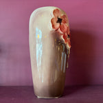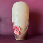 Charming brown + cream vase with pink wraparound dogwood tree flower detail handmade in the US circa 1940's.