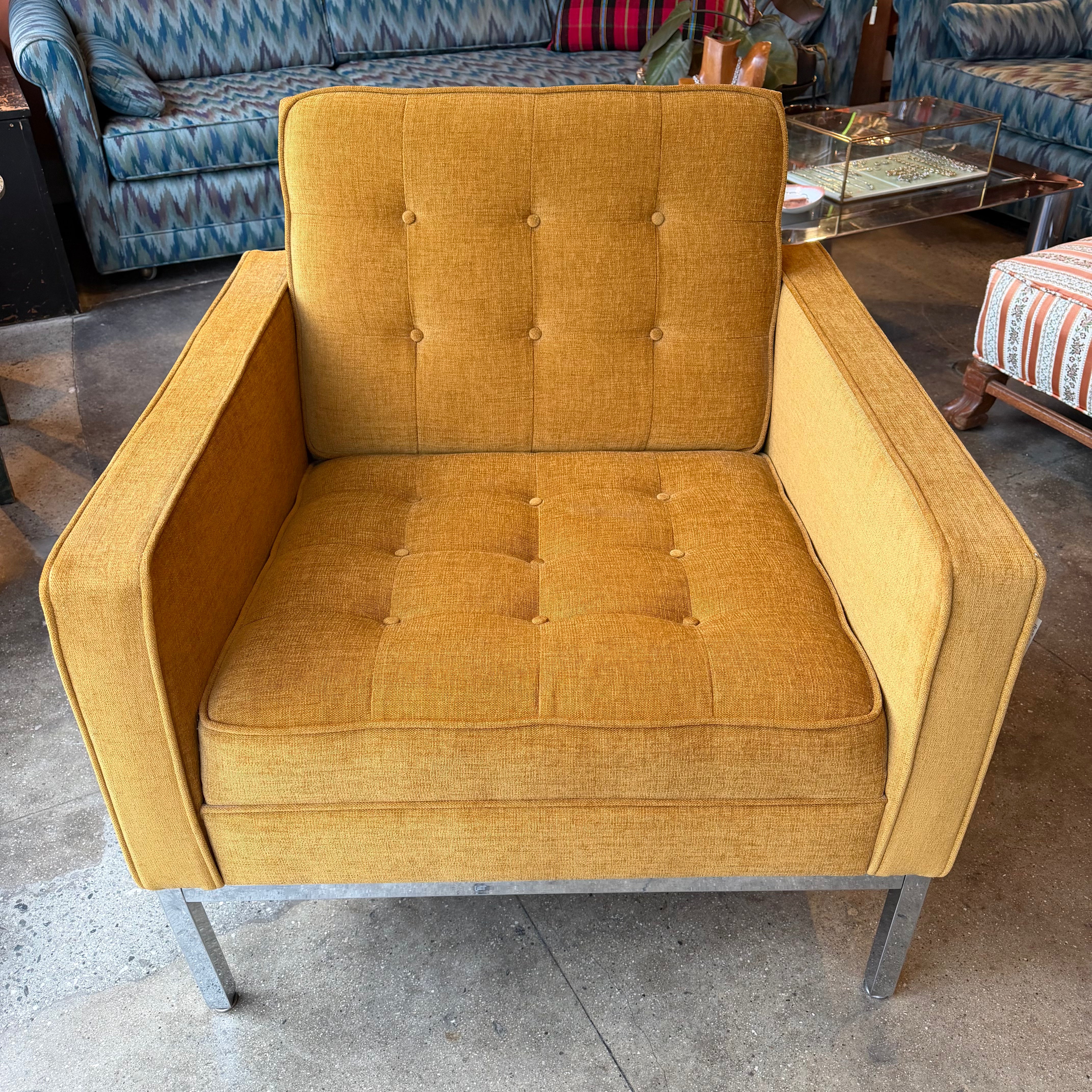 MCM Vintage Chair designed by Florence Knoll and produced by Steelcase in the 1960's. makers mark on underside. Fabric is mustard chenille. Base is chrome with adjustable feet. Firm seat, not very plush, but great for sitting!