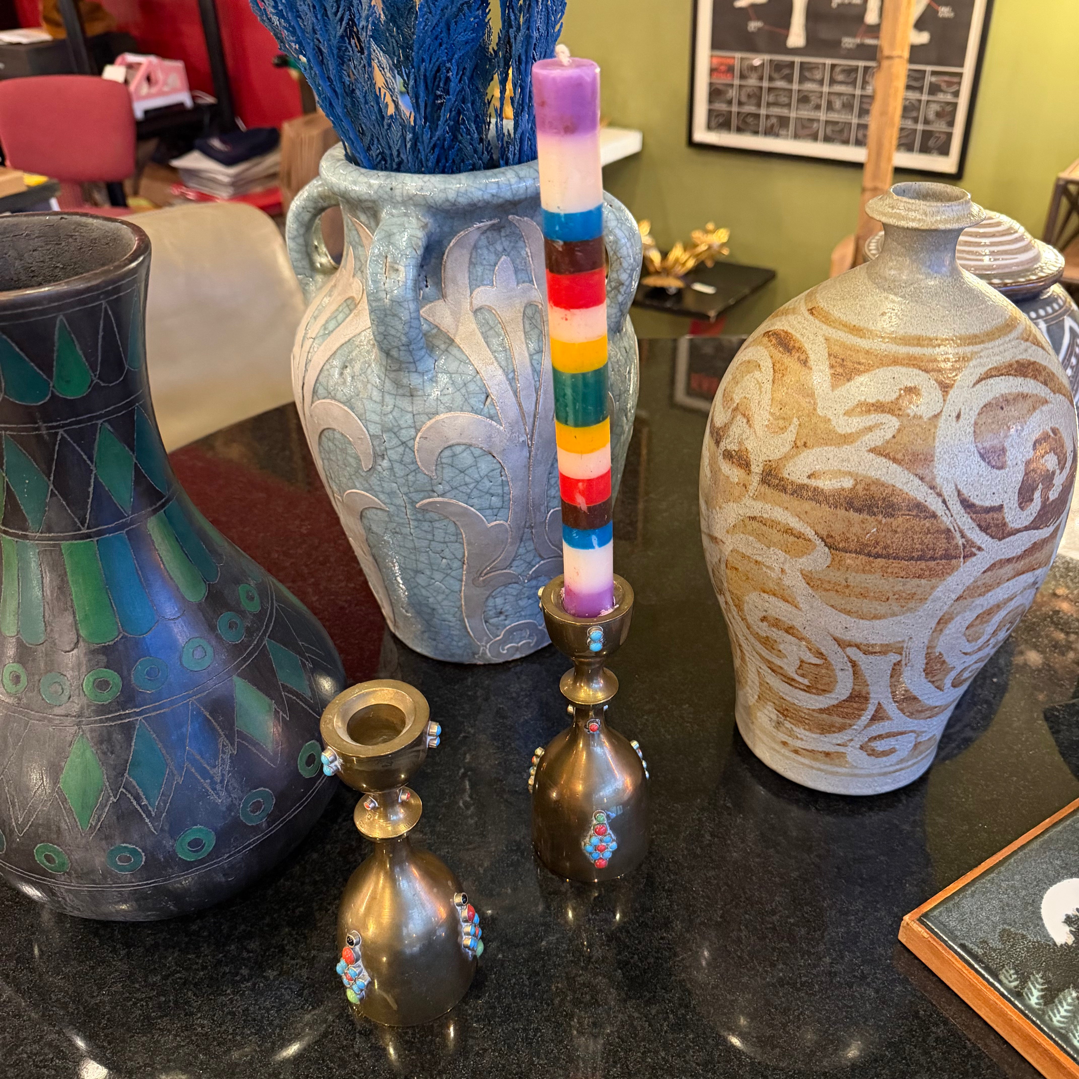 Beautiful set of candlesticks in brass with beaded details, made in India with stamp on underside.