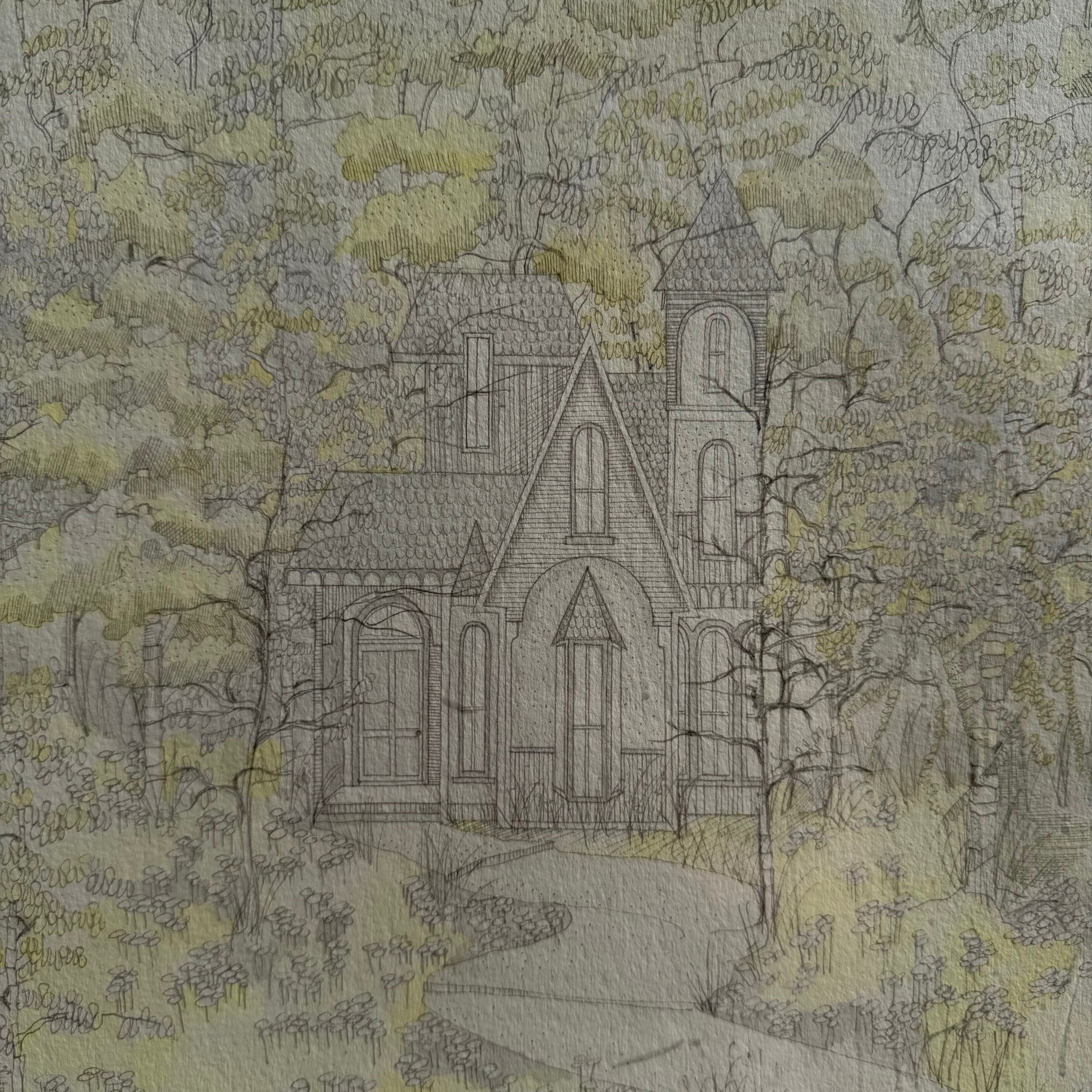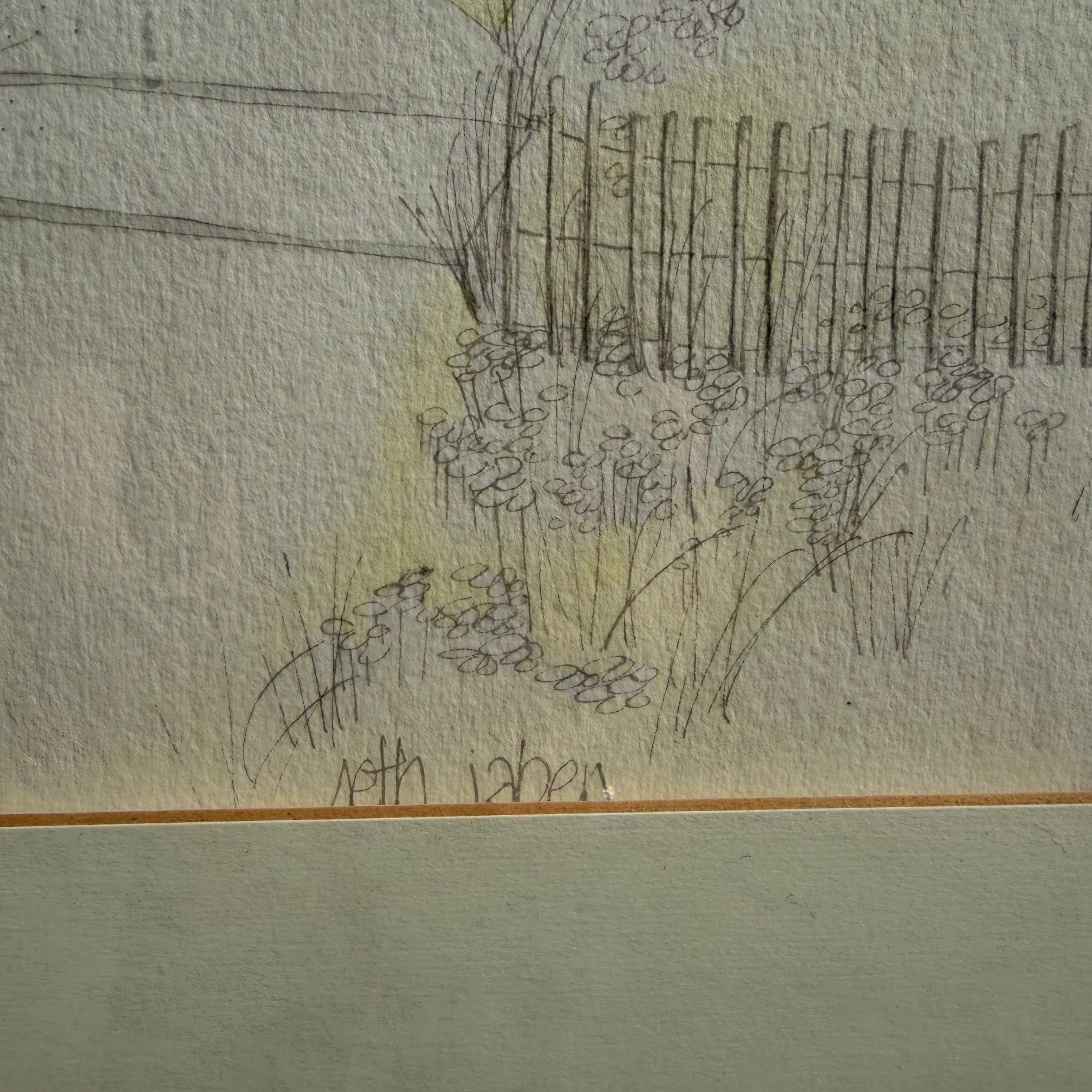 Beautiful + delicately drawn art piece in ink with watercolor embellishment showing a home nestled in the wood..."Invitation" was created in the 1970's by Kansas based artist, Seth Jabin. Artist signature in front and stamp on back showing original 1970's price...$80!