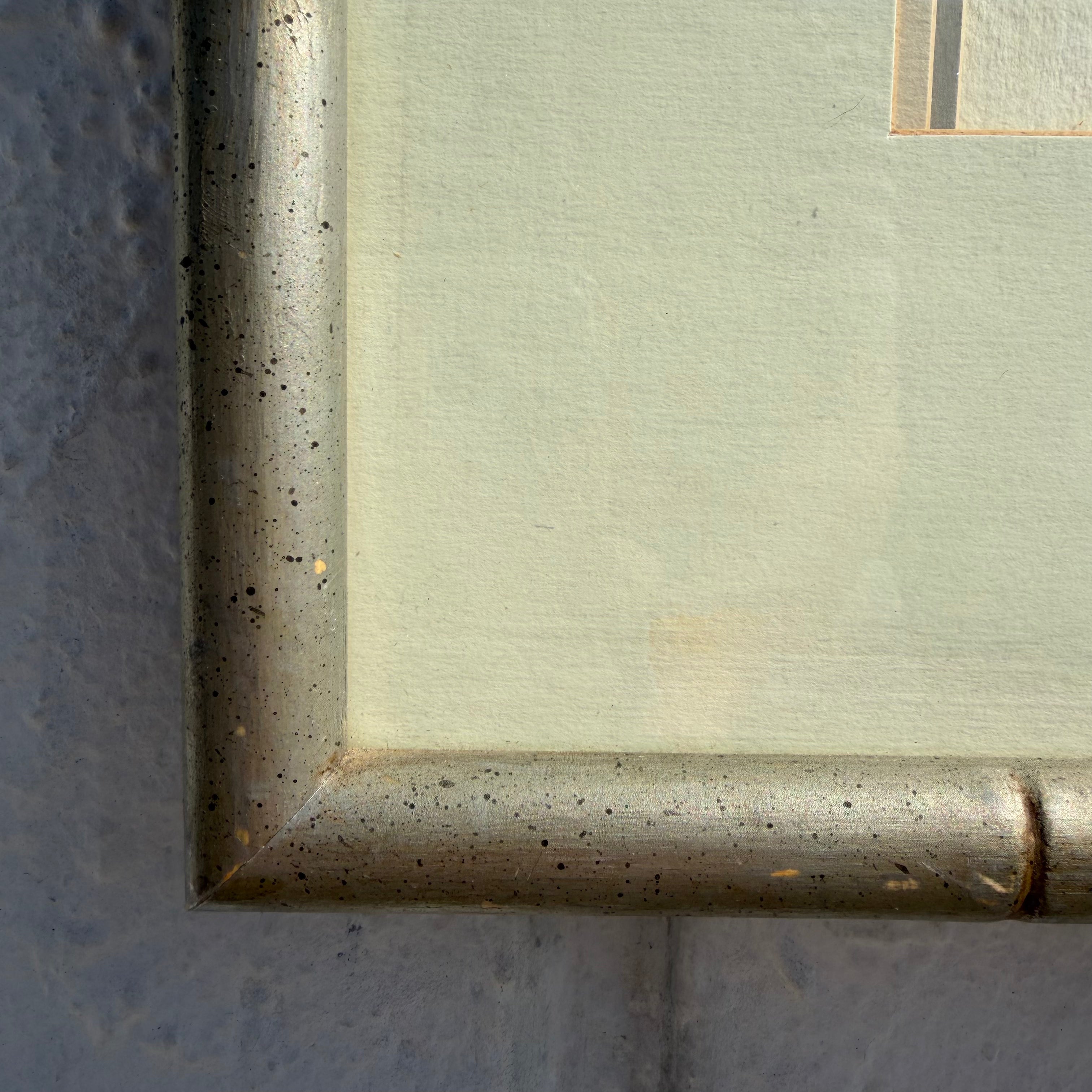 Framed in original faux - bamboo detail wood painted silver, glass and hanging wire in back.