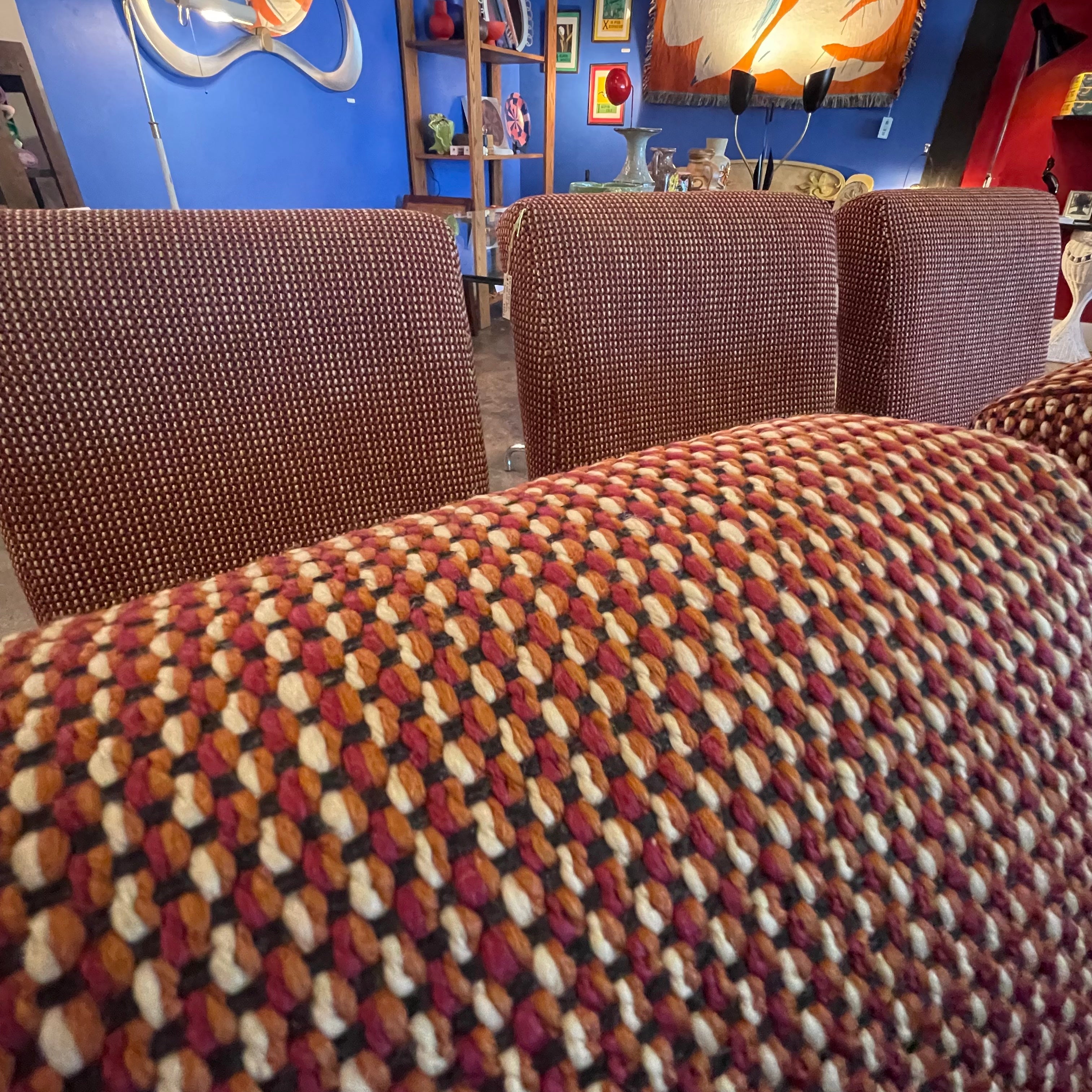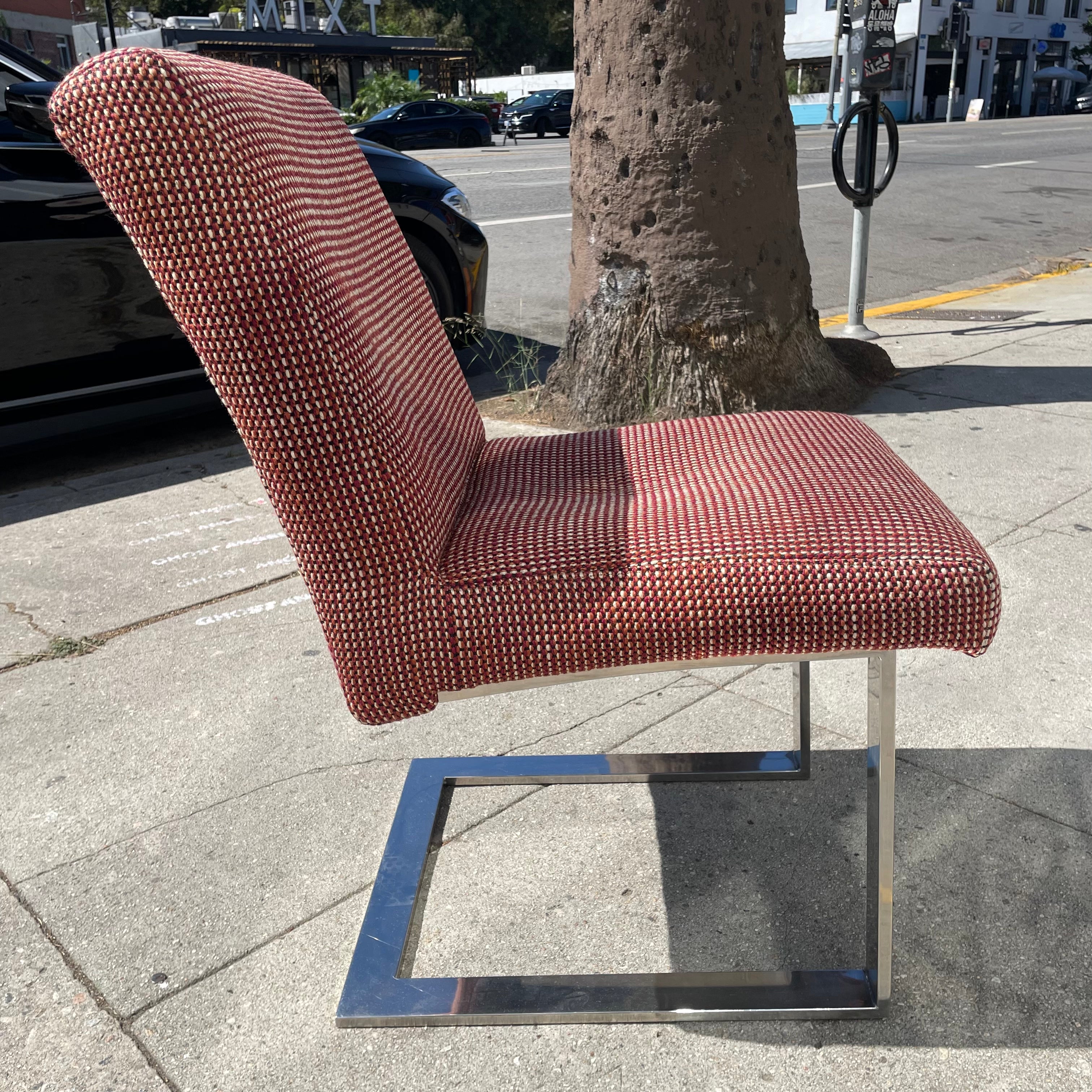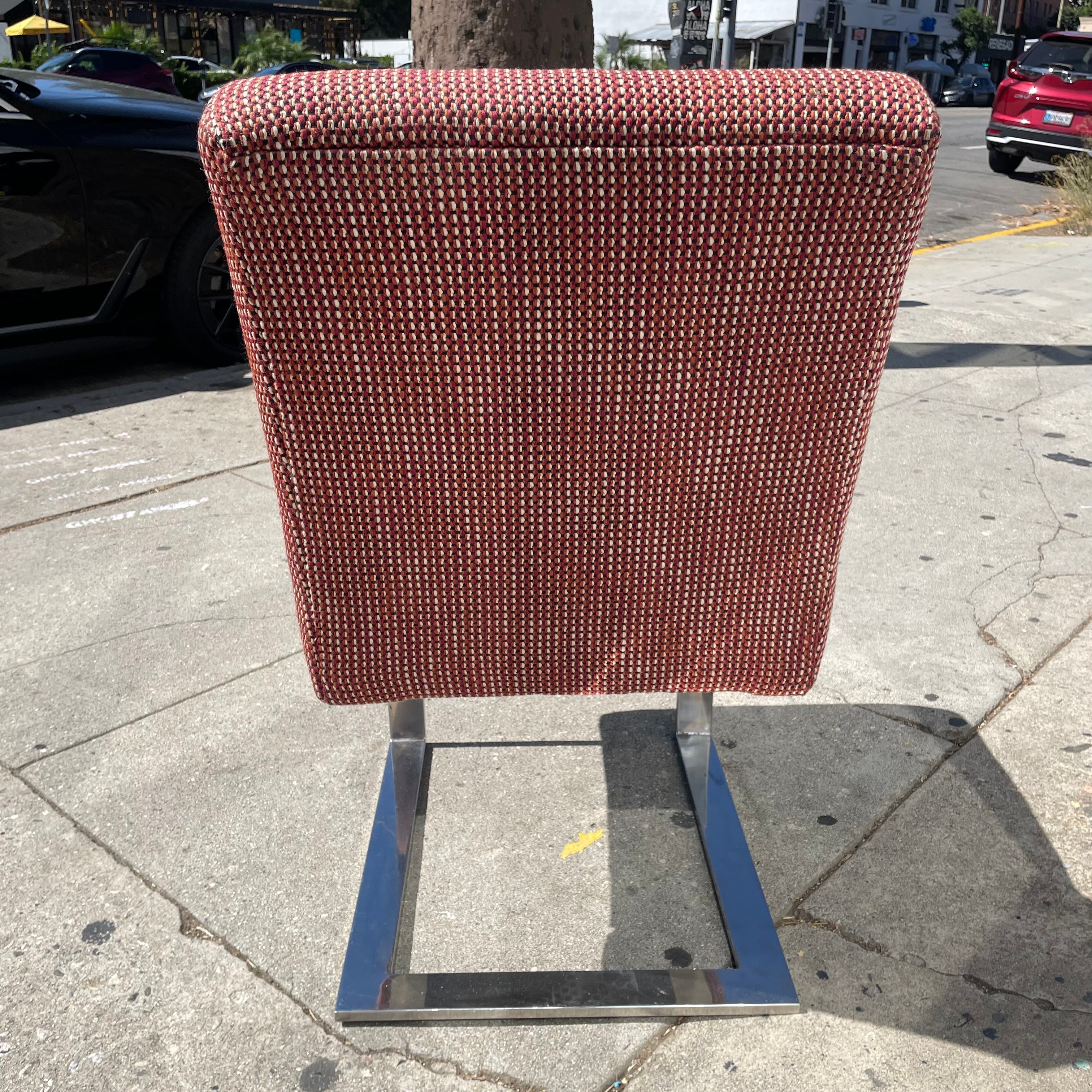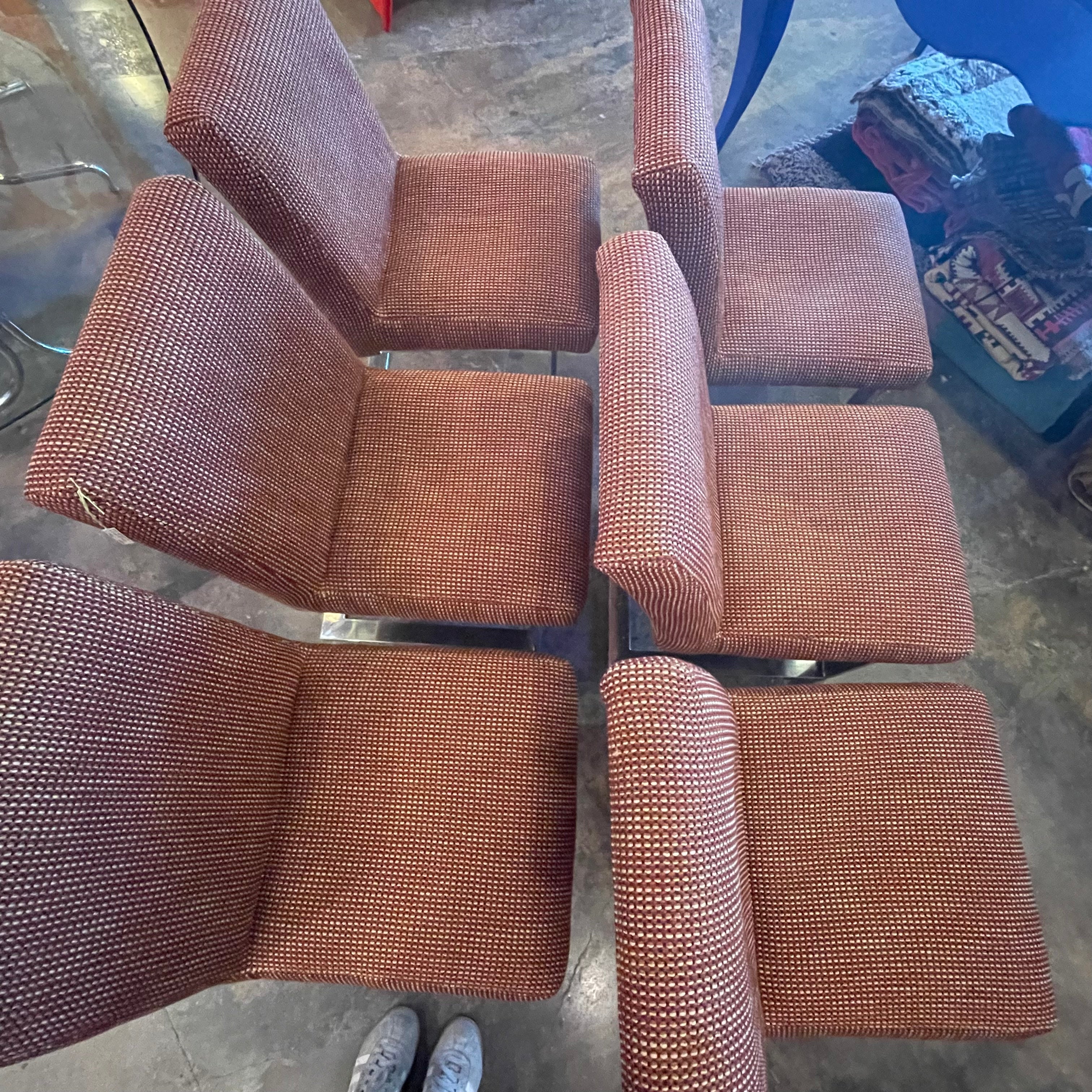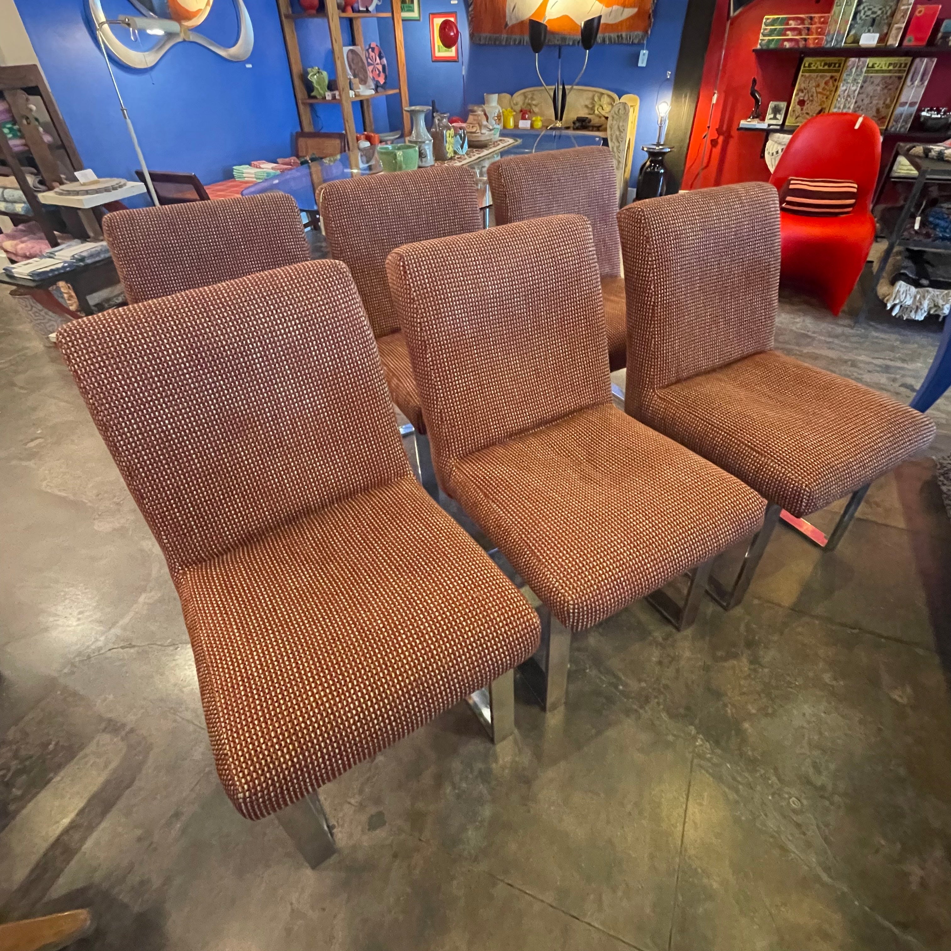 Gorgeous set of 6 upholstered dining chairs in original red/brown/black and white abstract wool tweed fabric with chrome cantilevered bases. Very comfortable and supportive backs, in excellent condition for their age. Designed by Paul Evans for Directional Furniture // Made in the USA circa 1977