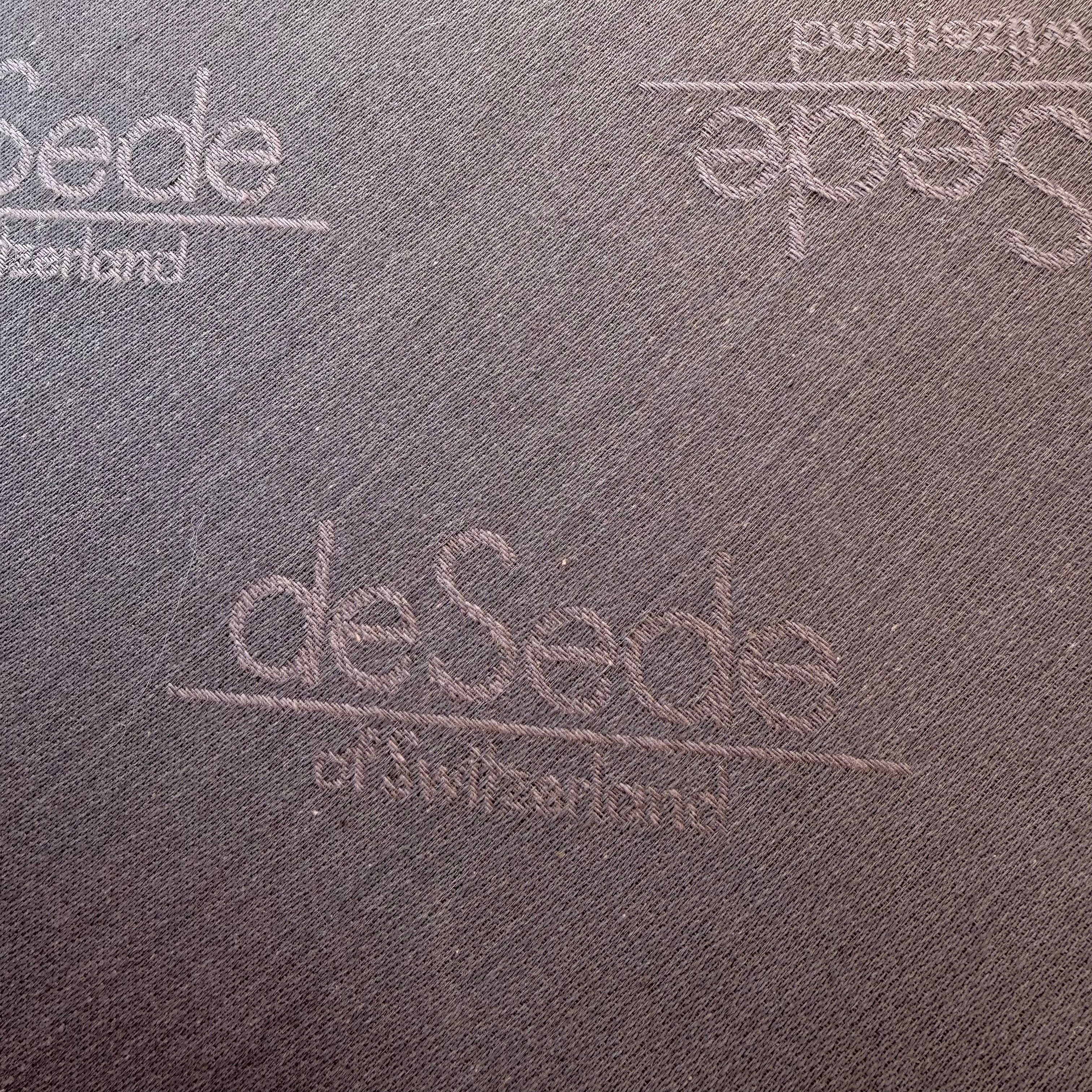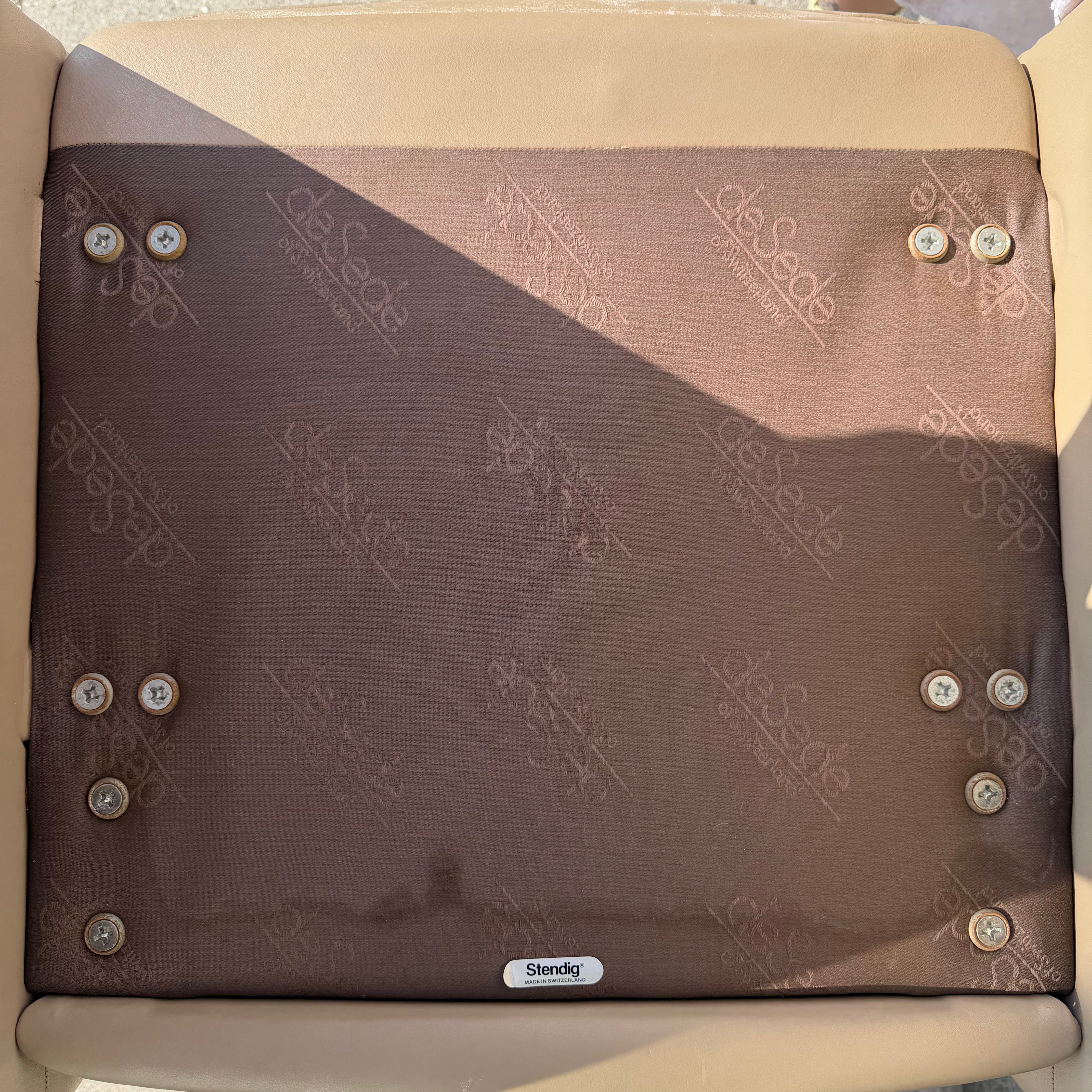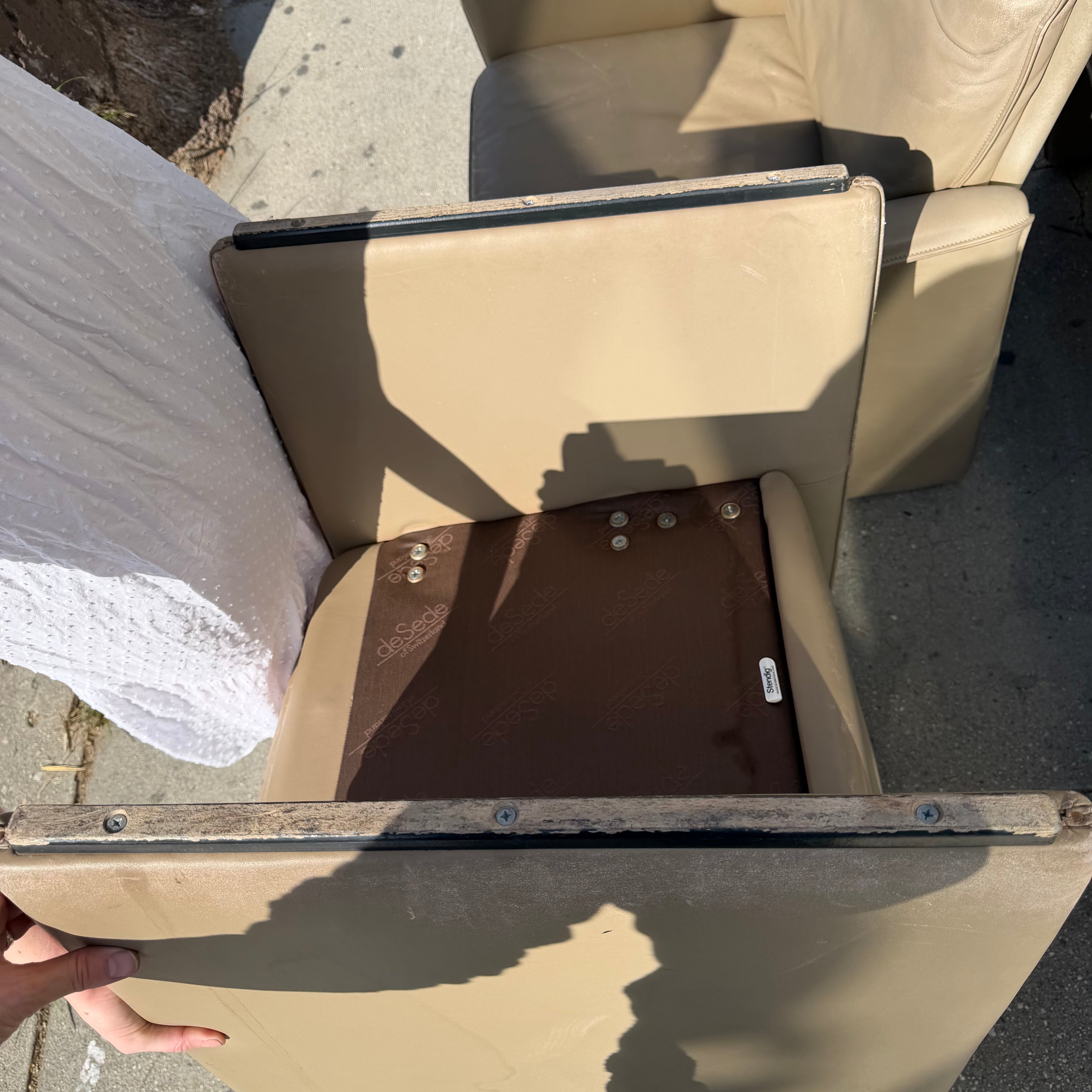 Set of 6 natural leather dining chairs in beige by the famous Swiss company De Sede. Slight curve on the armrests. These mid-century chairs are comfortable, sturdy and in decent condition for their age.