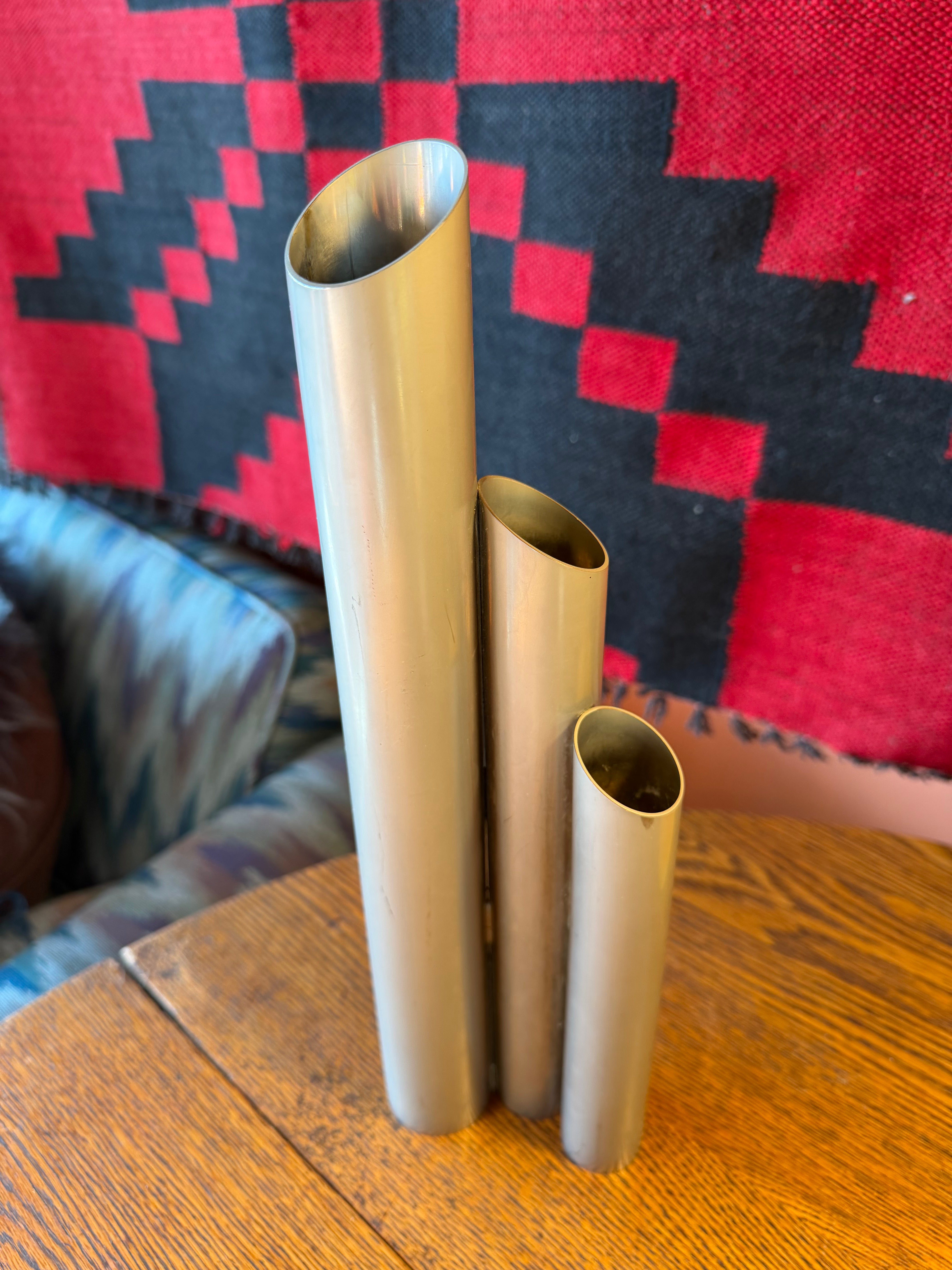 Italian made post-modern vase with 3 conjoined steel tubes of varying heights for stems.