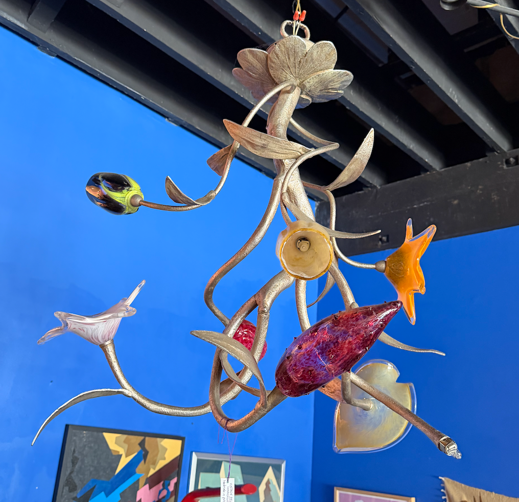 Hand carved bronze + glass flower chandelier by Bela Iguazu, a portuguese lighting legend, for Elk Lighting, originally 7k.