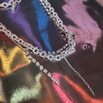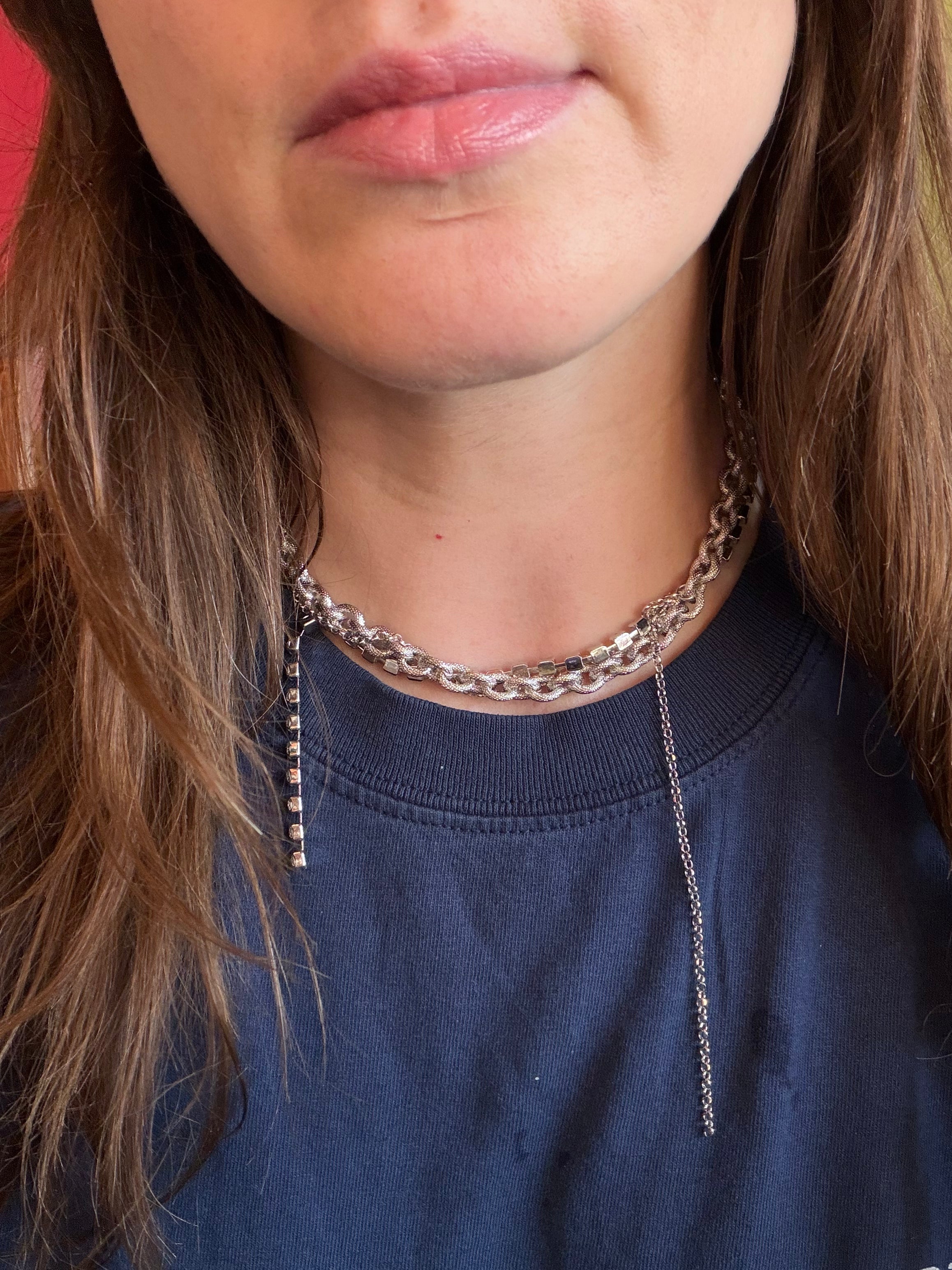 Assymmetrical crystal + palladium necklace by French designer, Justine Clenquet.