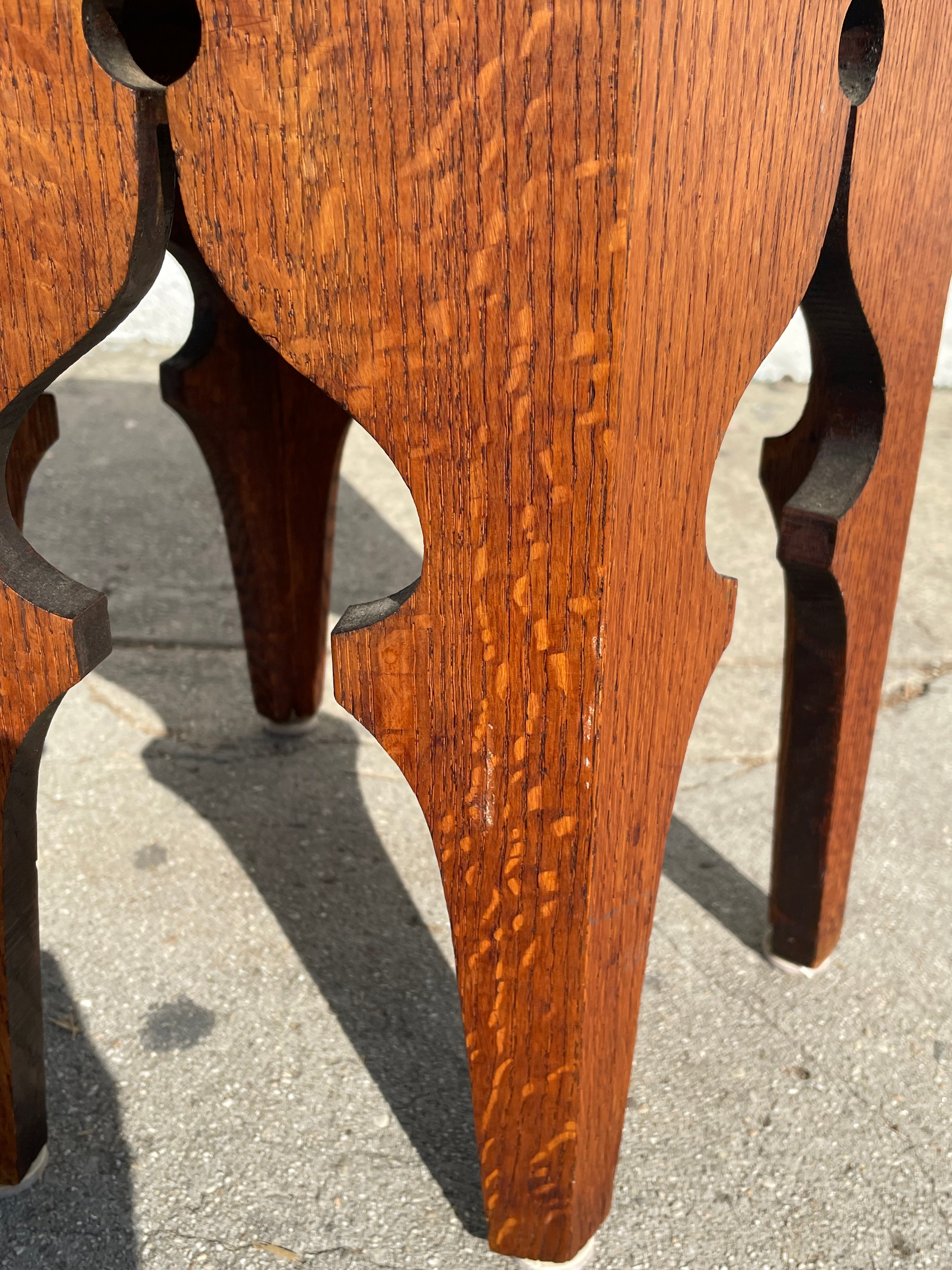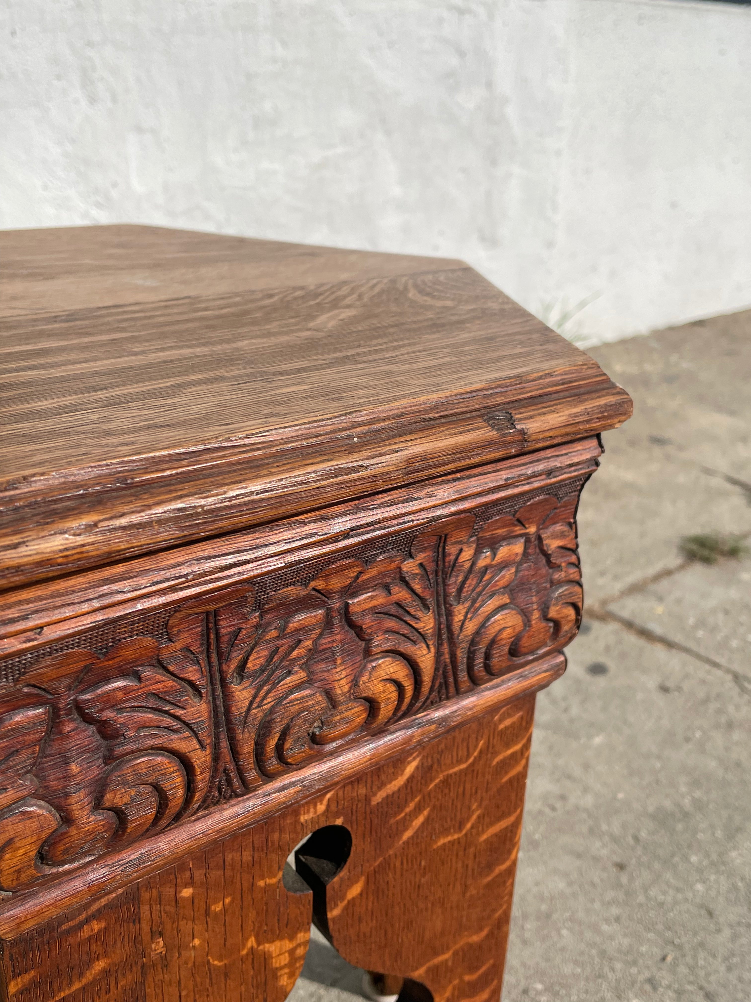 Mid-century Moroccan side table. Solid oak with hexagon shape and decorative design carved into the sides.