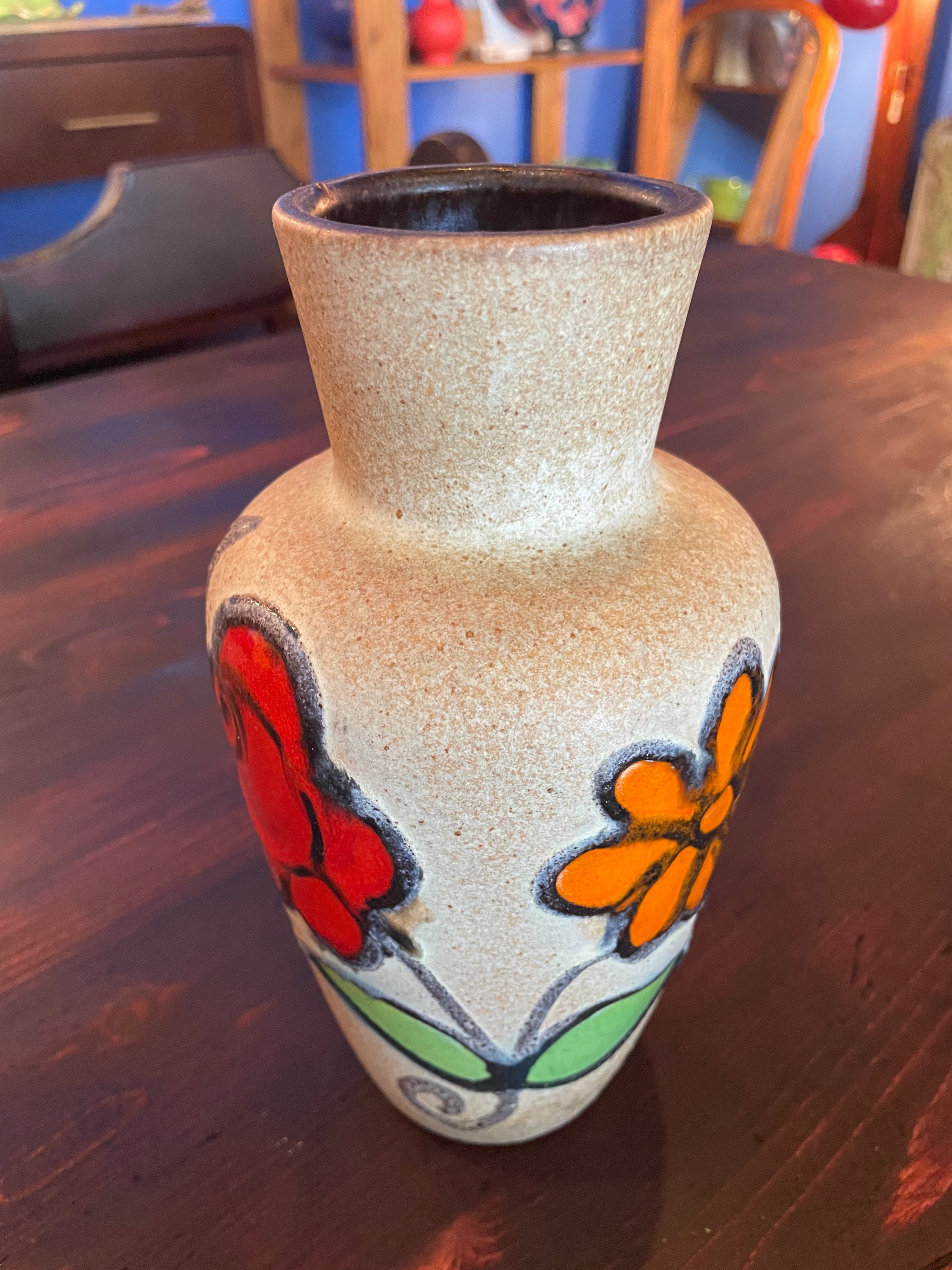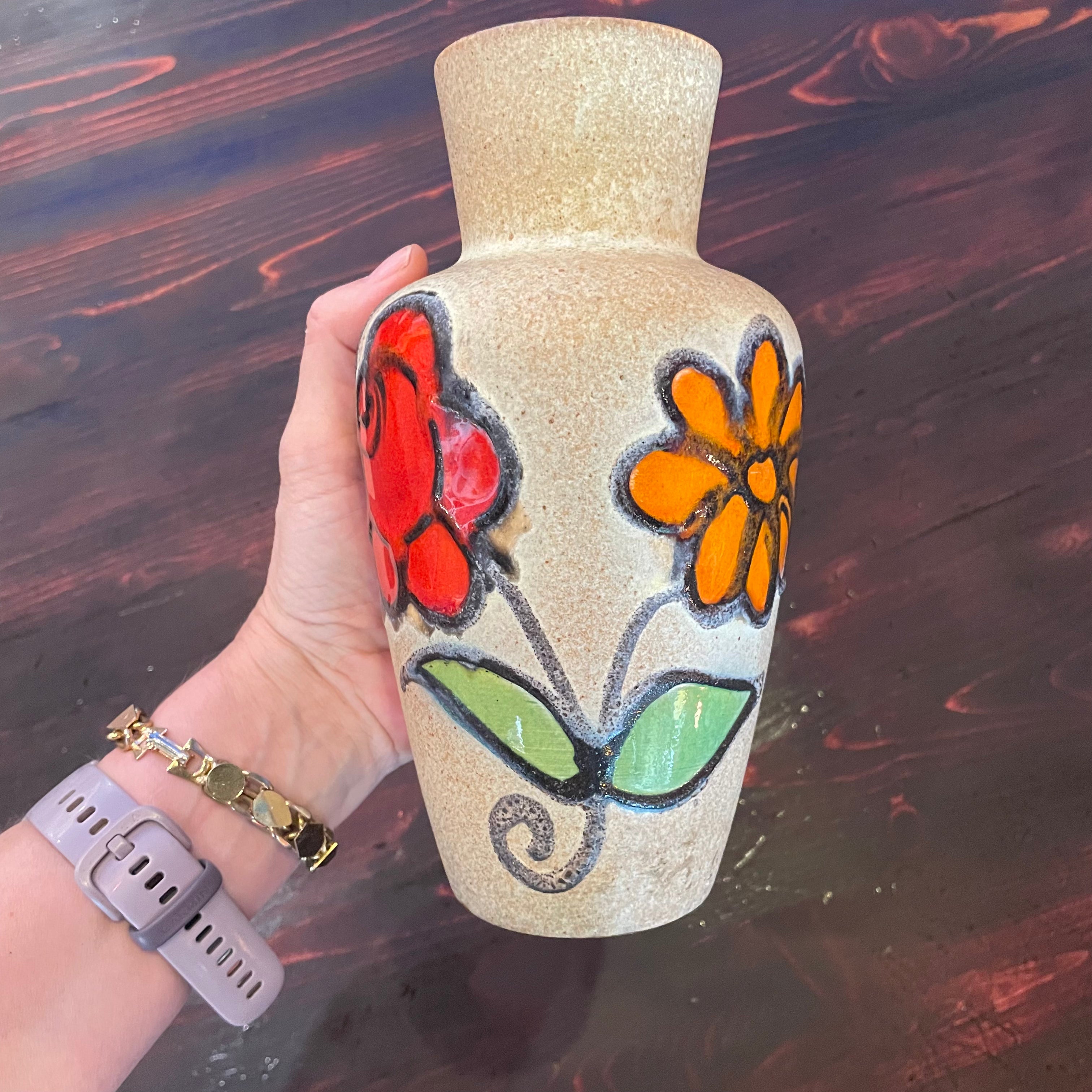 Charming MCM floral ceramic vase, 1950's-60's West German + marked on underside...a rare and special hand painted piece.