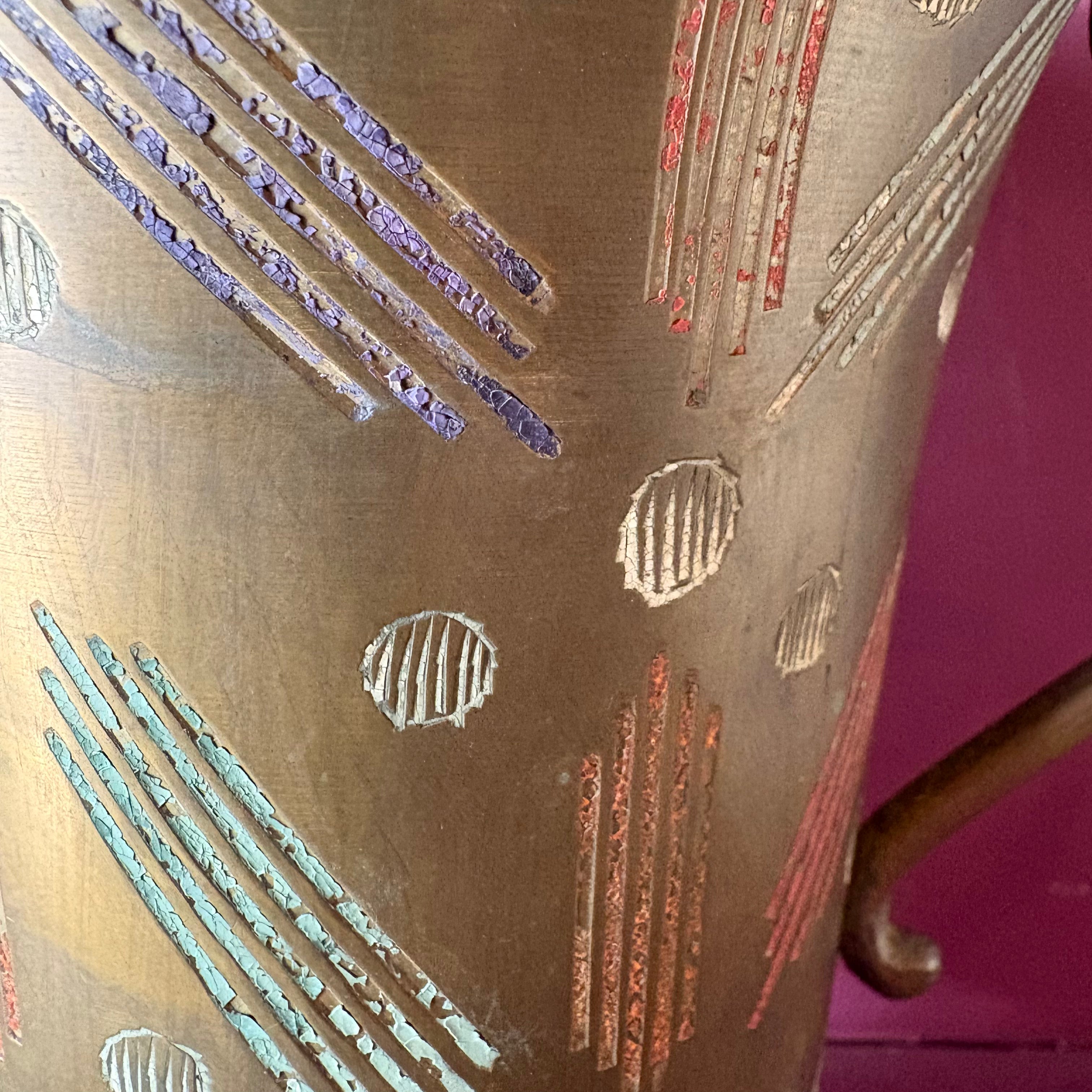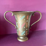 1960's brass vase with colorful painted etchings around body. Eye-catching atomic design makes it a great addition to any space needing some interest and warmth.