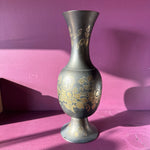 Vintage Indian brass vase featuring a graceful flared silhouette with hand-etched floral motifs and a softly aged patina. Adds warmth and artisanal character to any shelf, mantel, or tabletop!