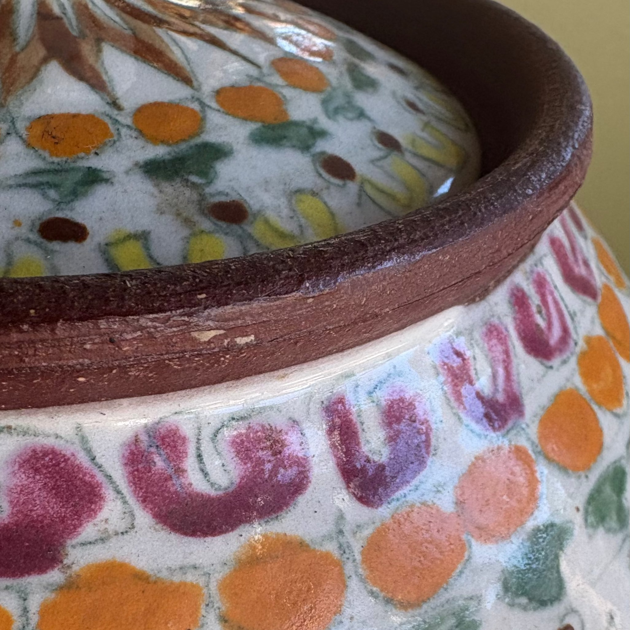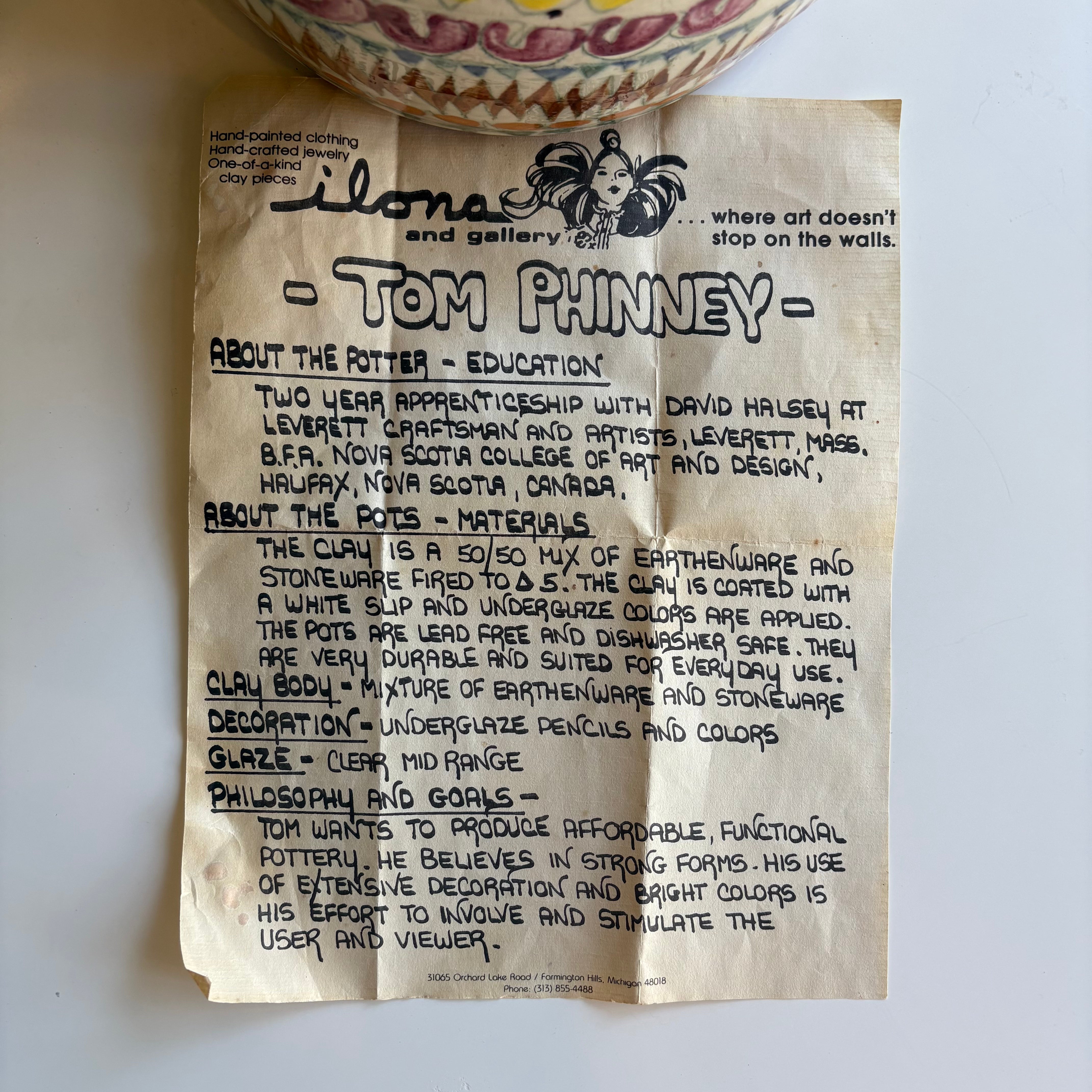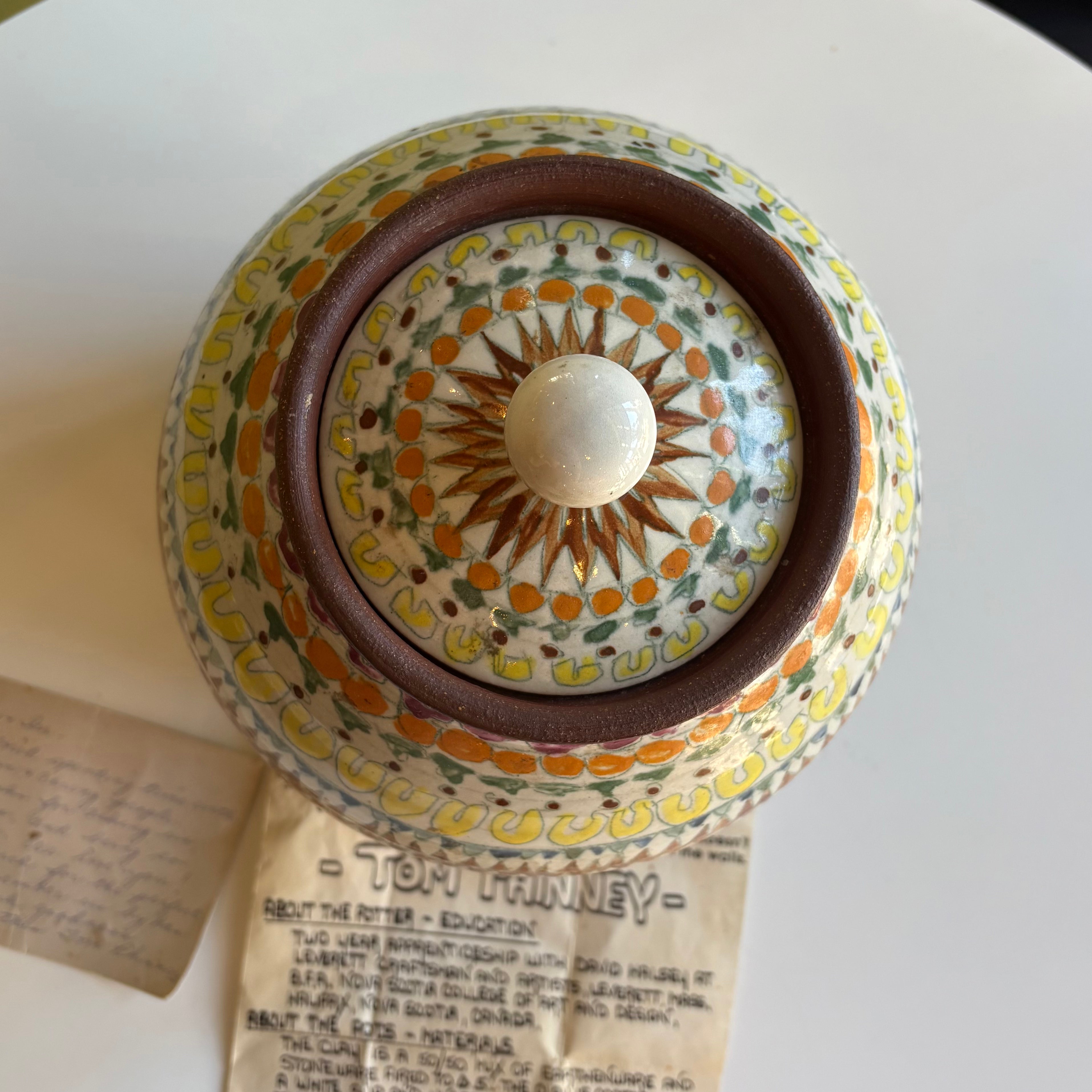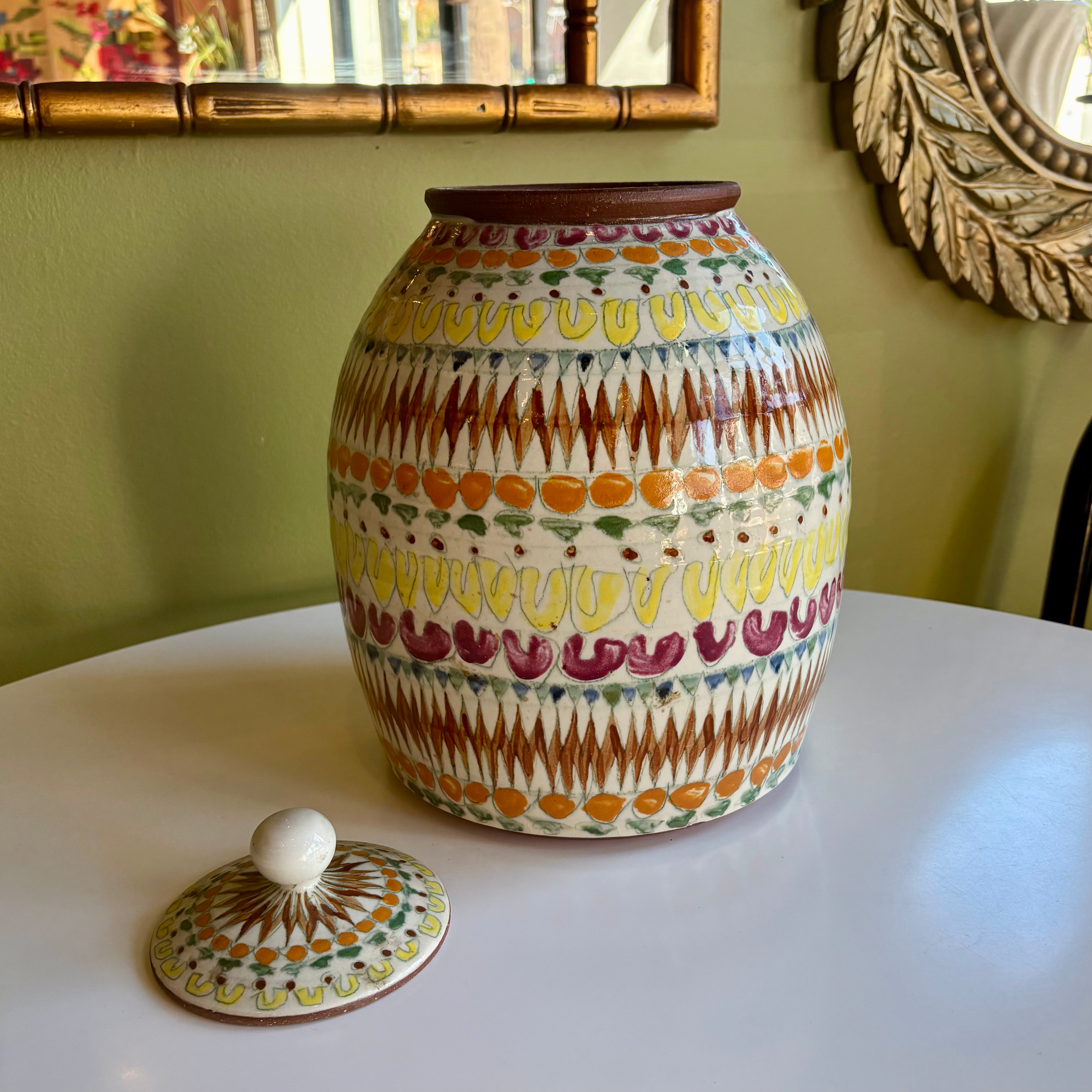 Mid-century pottery jar with abstract colorful hand-painted design made by Tom Phinney, renowned Ohio ceramic artist.