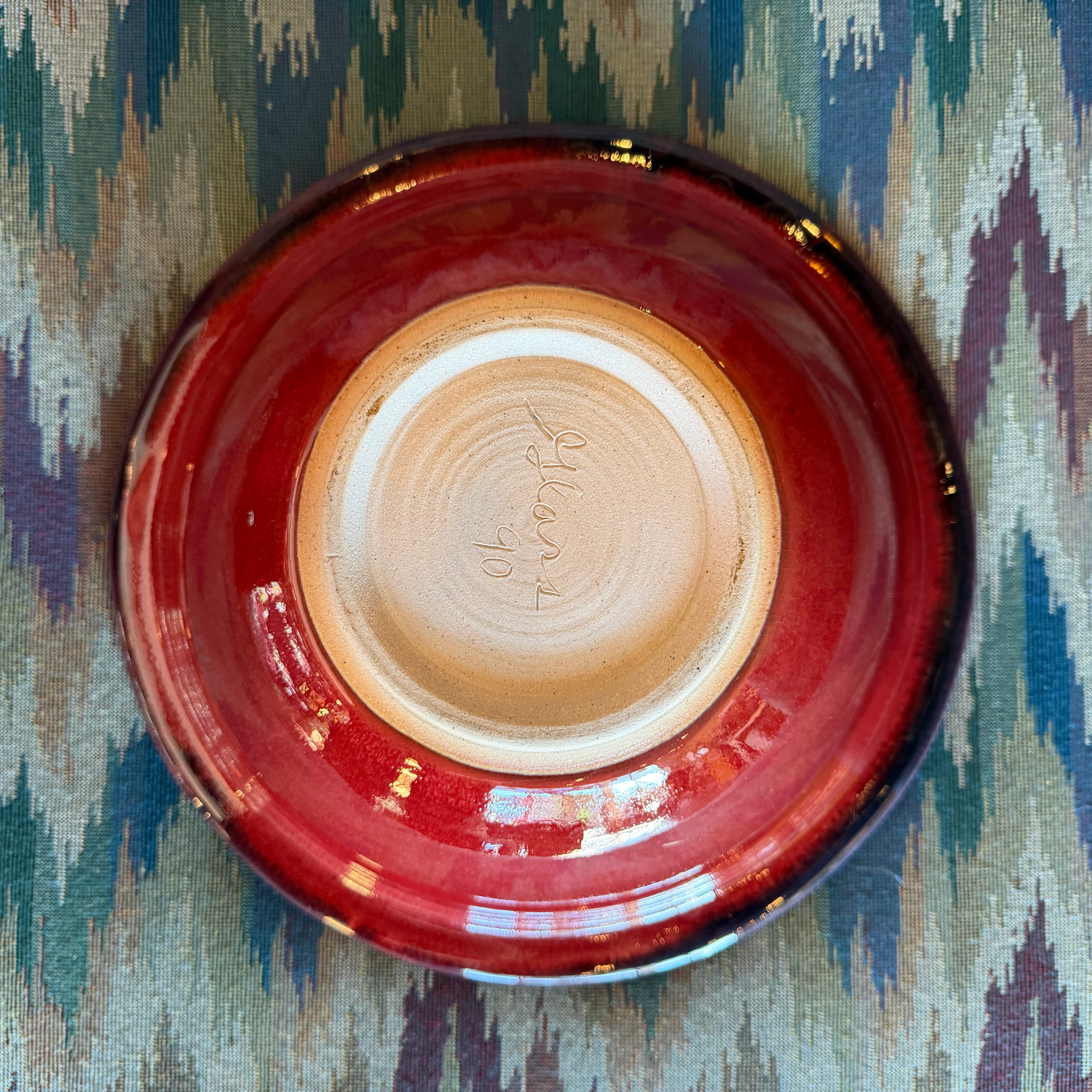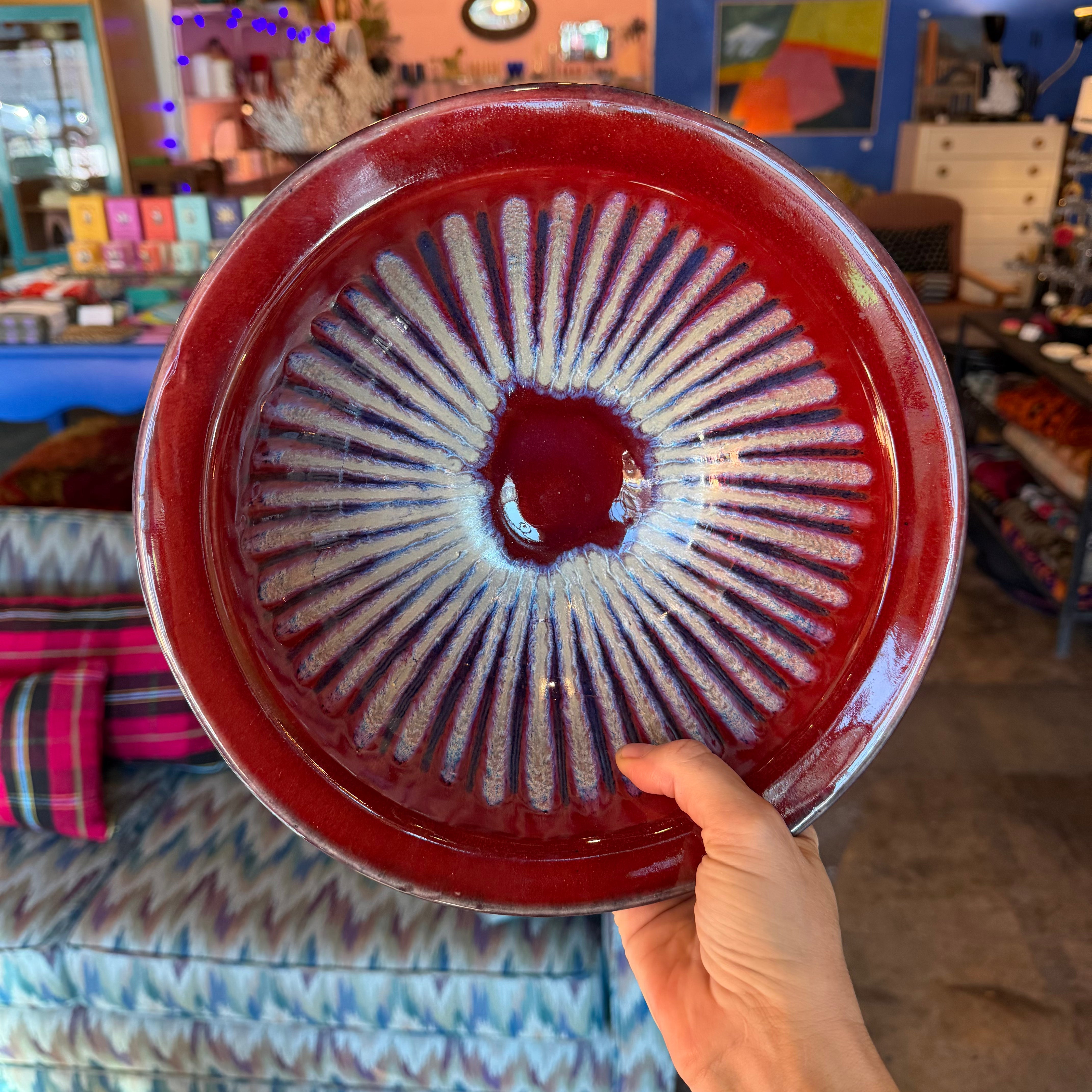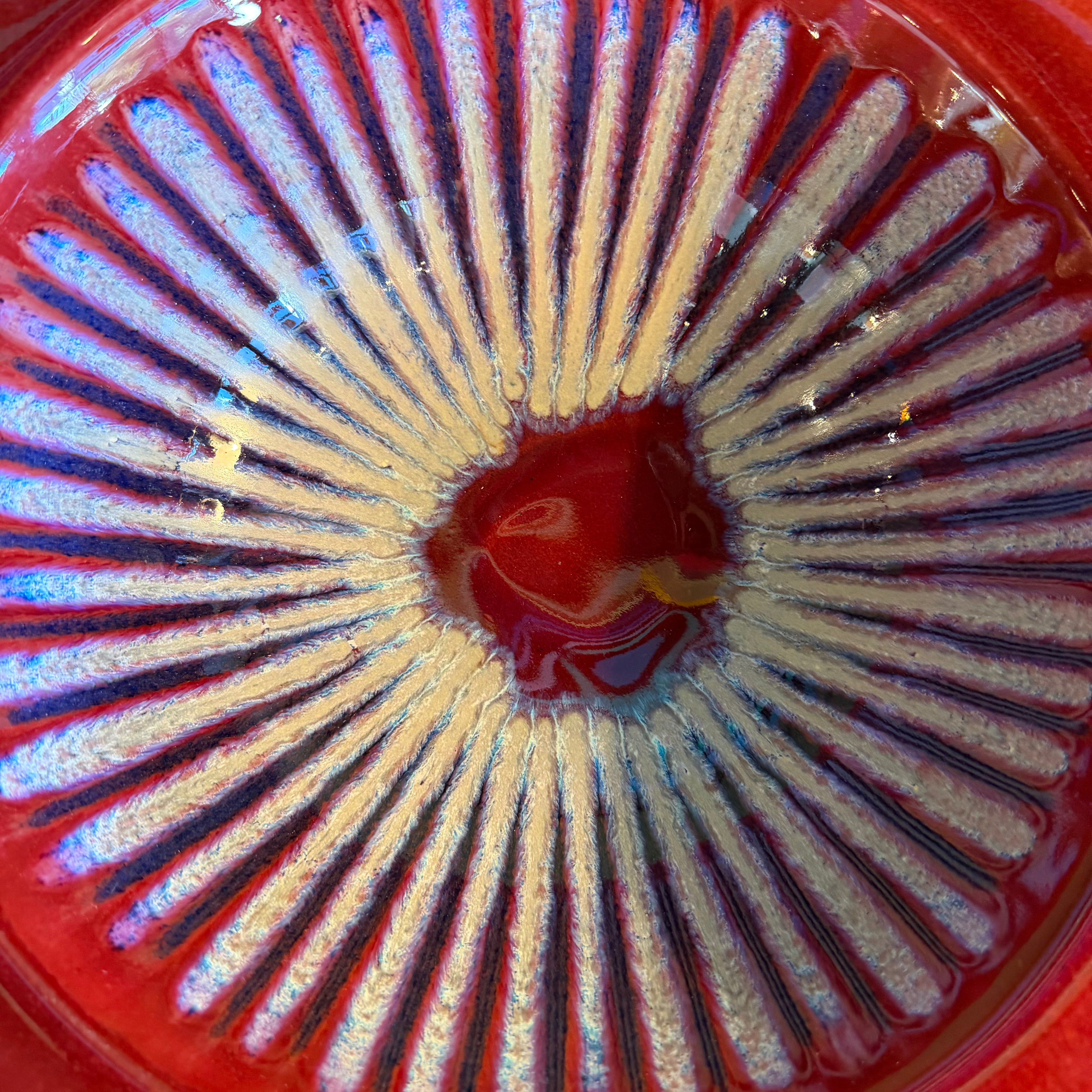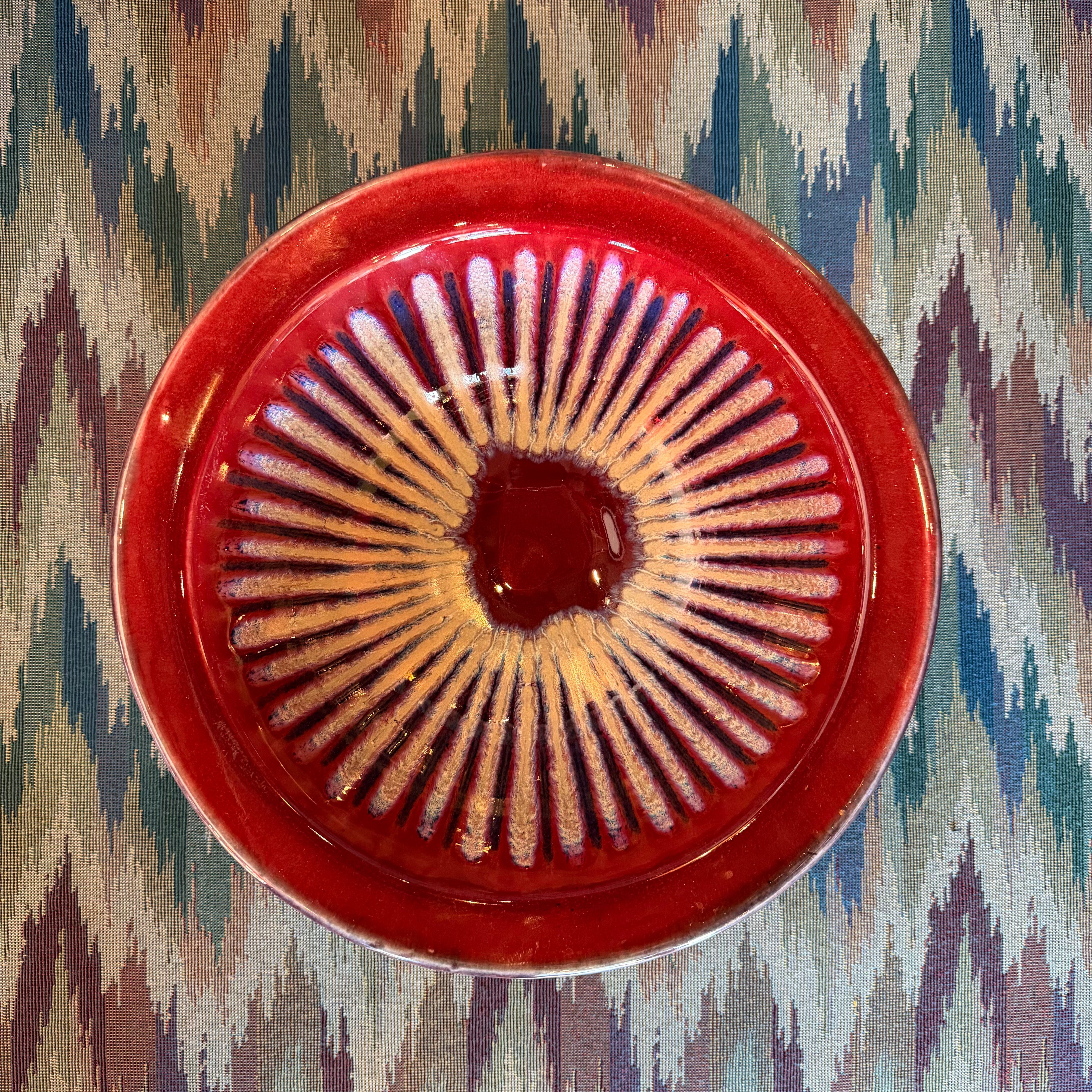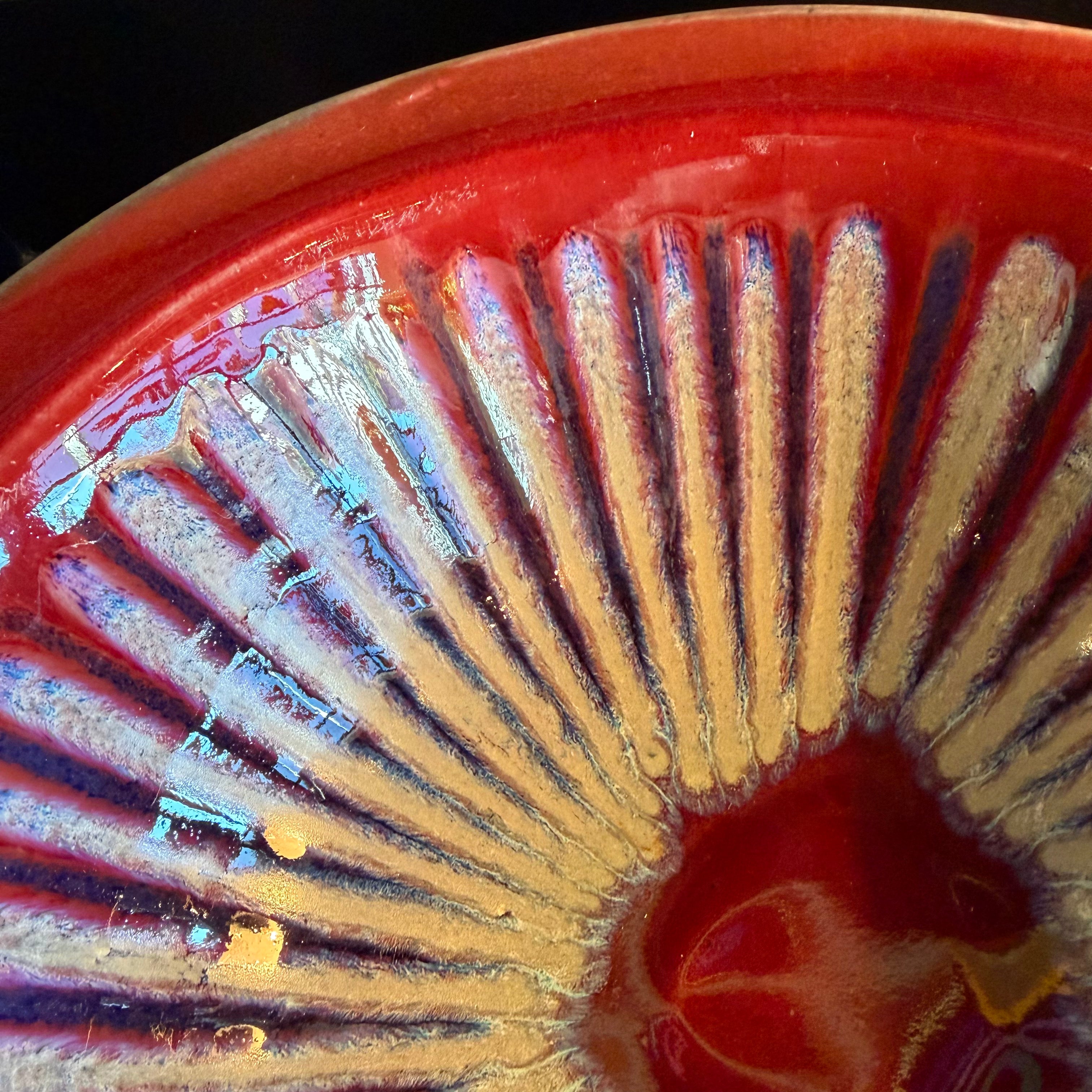 Large scale bowl in red with purple, blue + white stripe glaze details. Maker's mark + date on underside. Nice size for a serving or fruit bowl + makes a wonderful centerpiece :)
