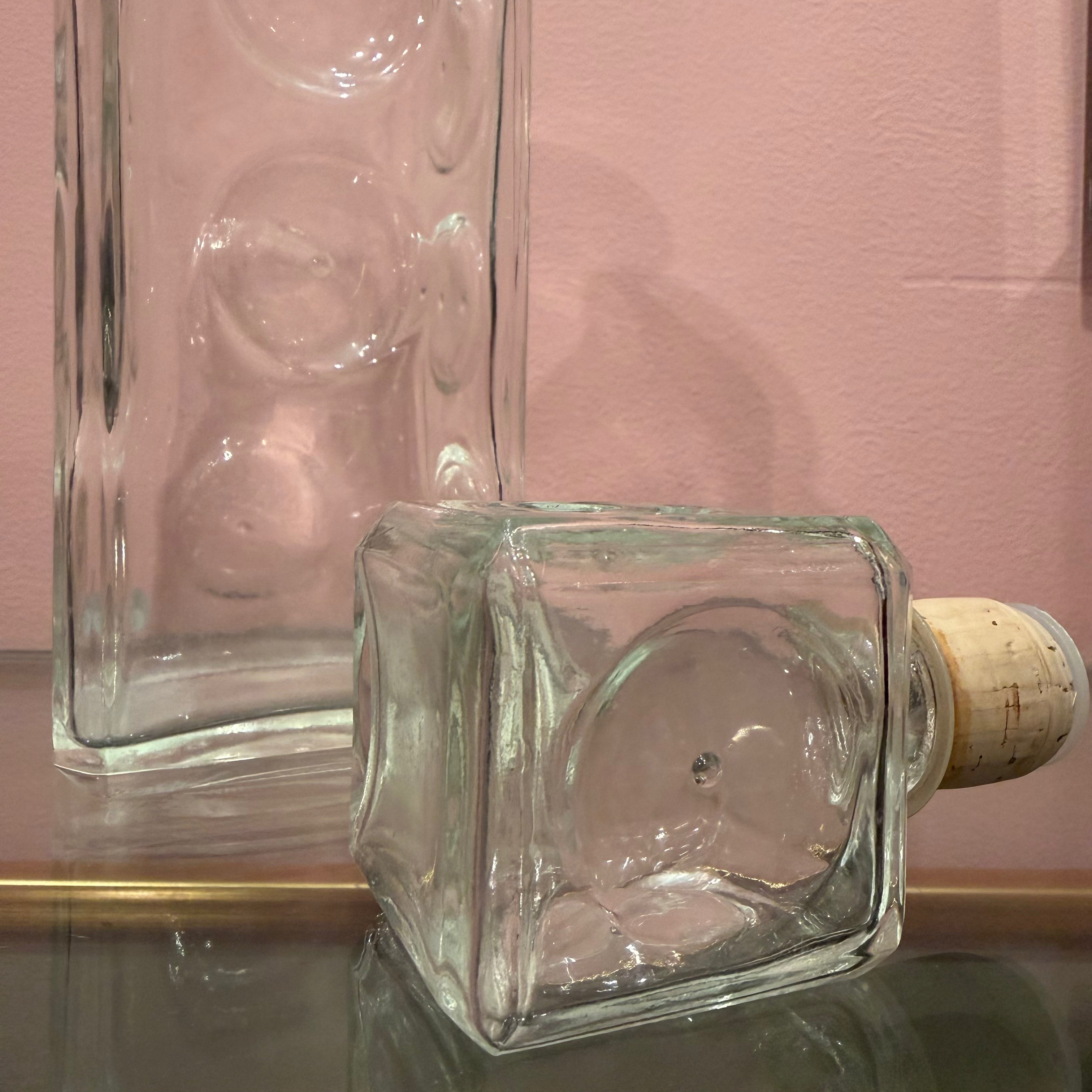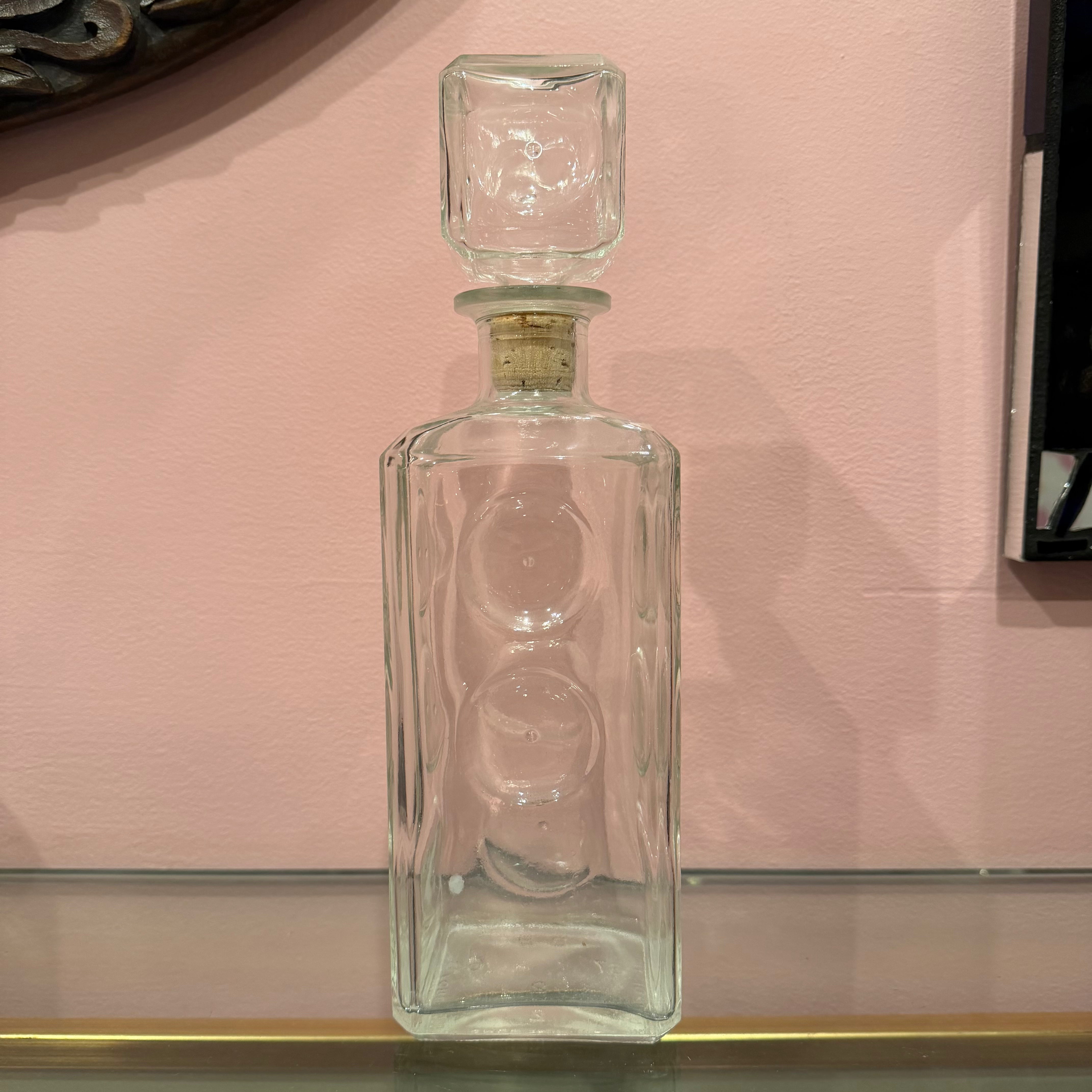 Mid-century glass decanter with circular inset details. Cork stopper is super tight and strong, in contrast to many from a similar period. A great addition to any bar setup!