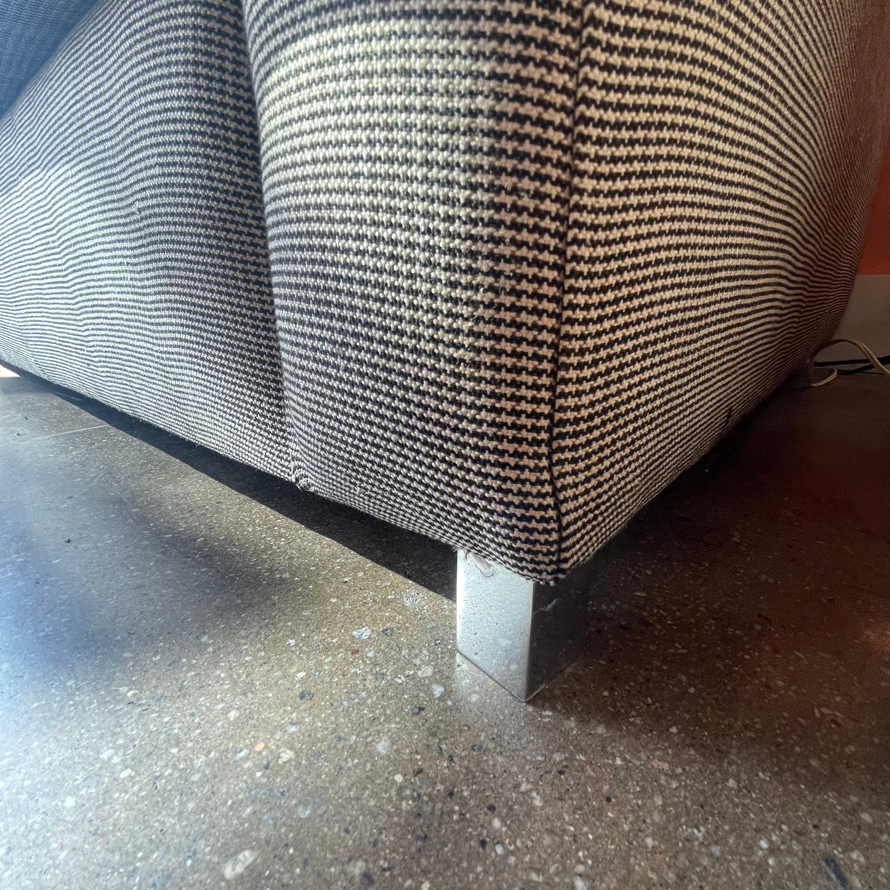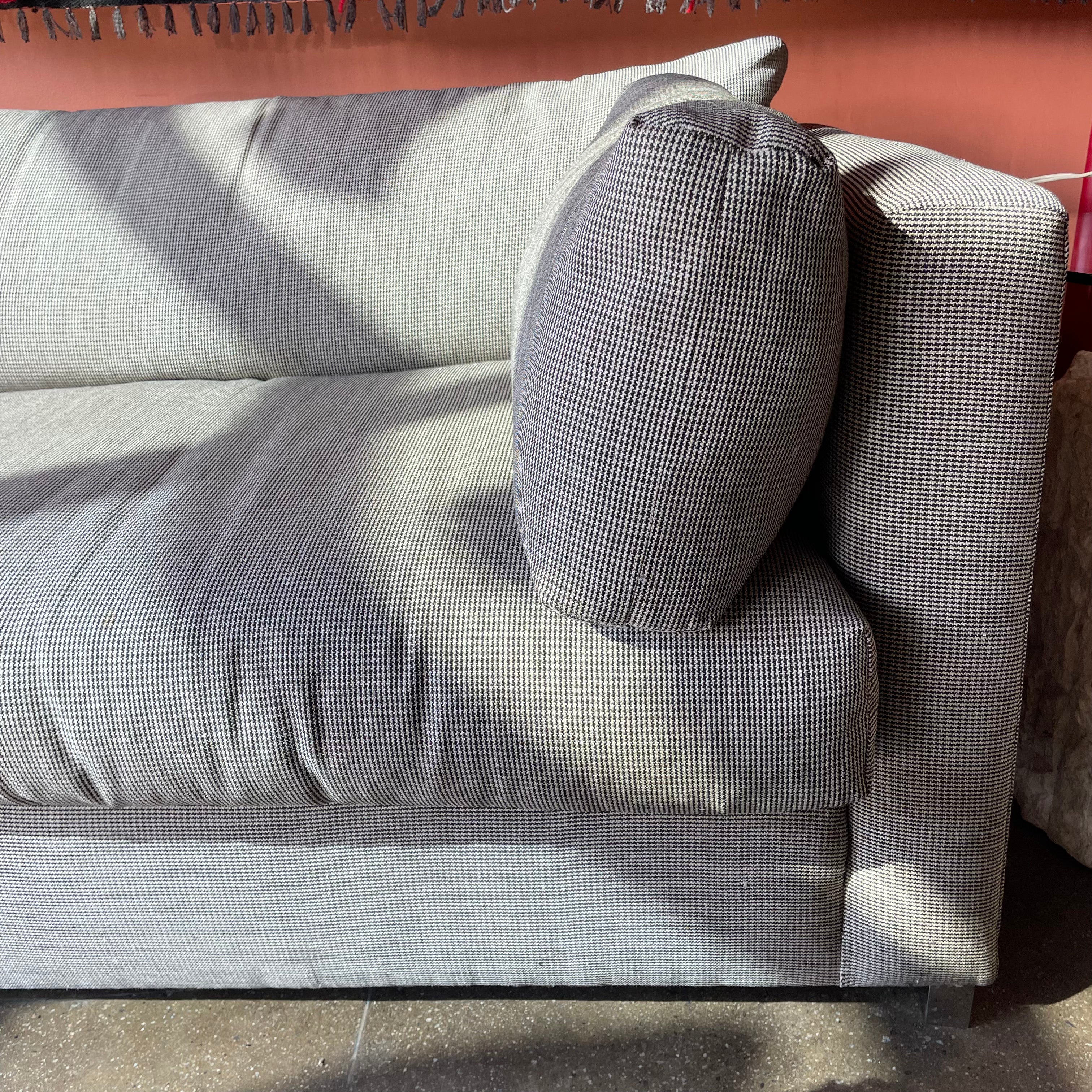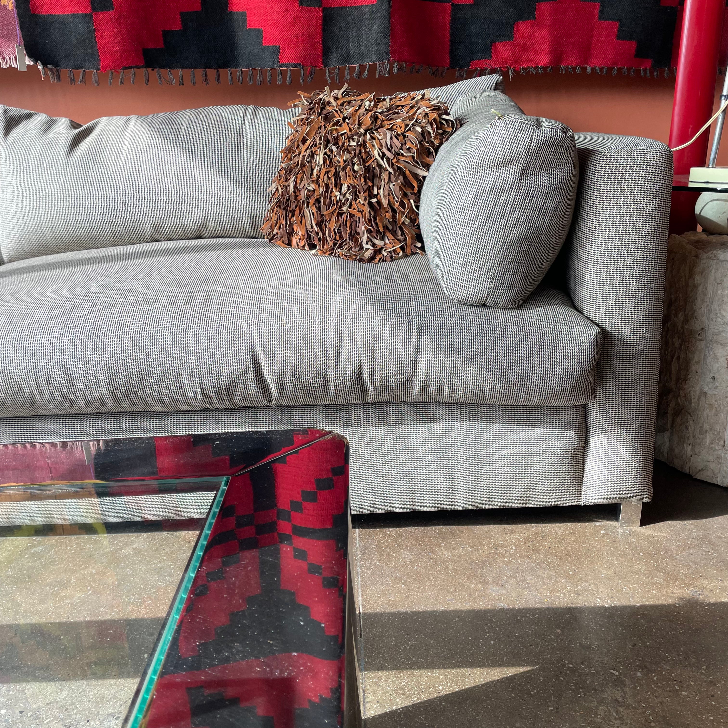 Super cozy vintage sofa with Houndstooth silk blend fabric and metallic legs. Cushion covers have hidden zippers on back/bottom.