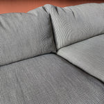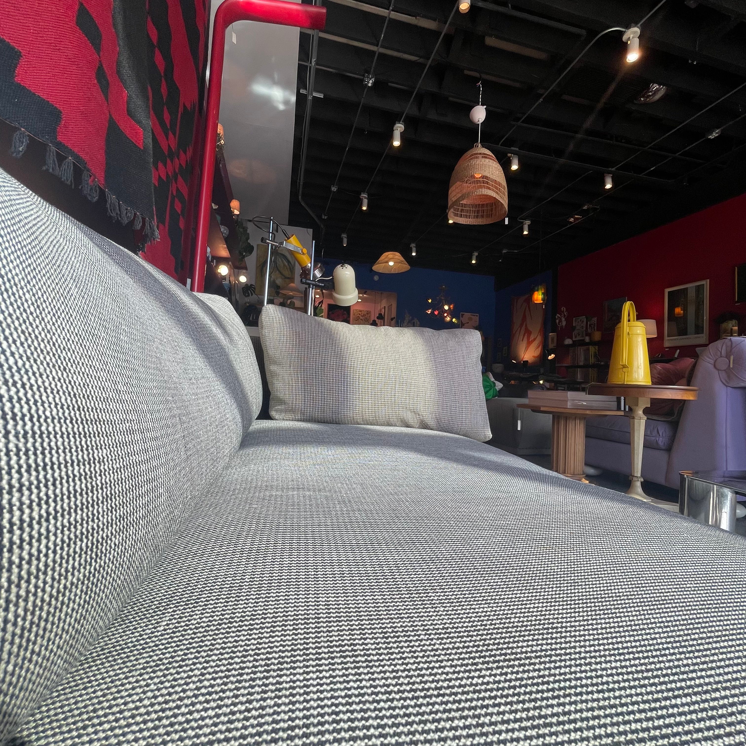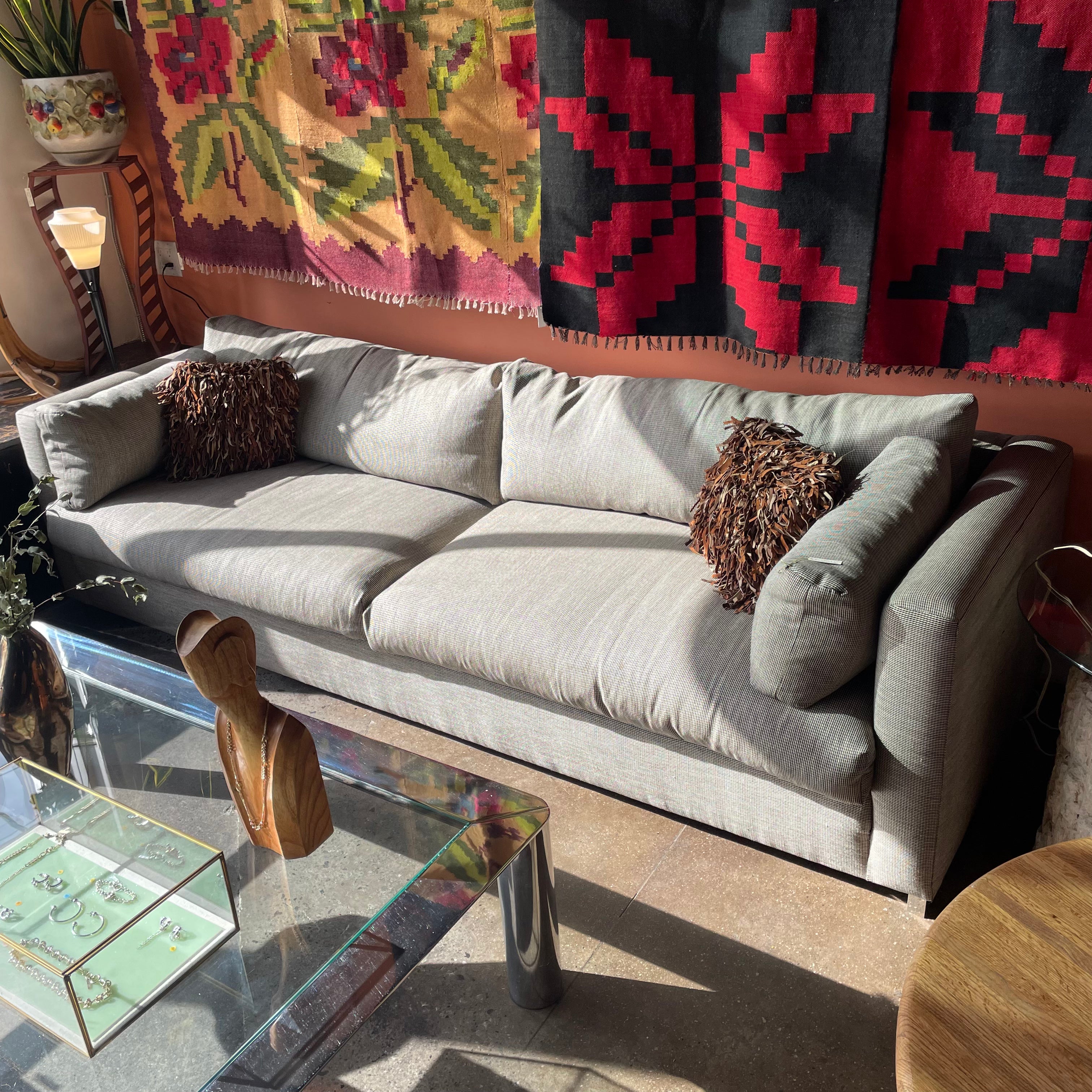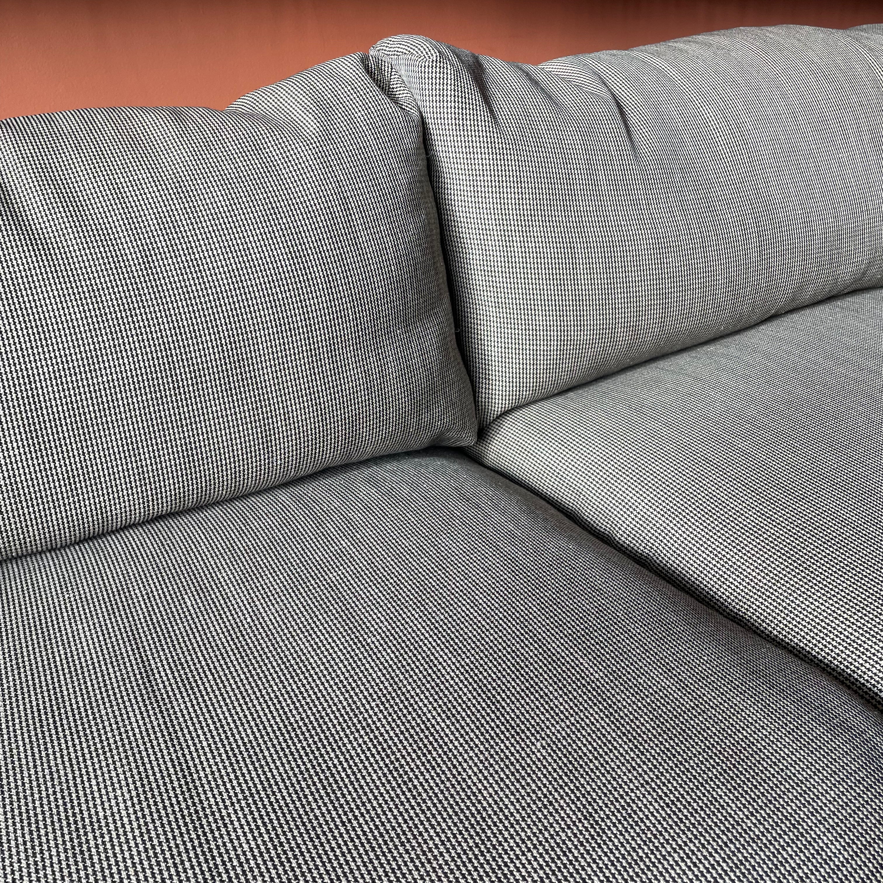Super cozy vintage sofa with Houndstooth silk blend fabric and metallic legs. Cushion covers have hidden zippers on back/bottom.
