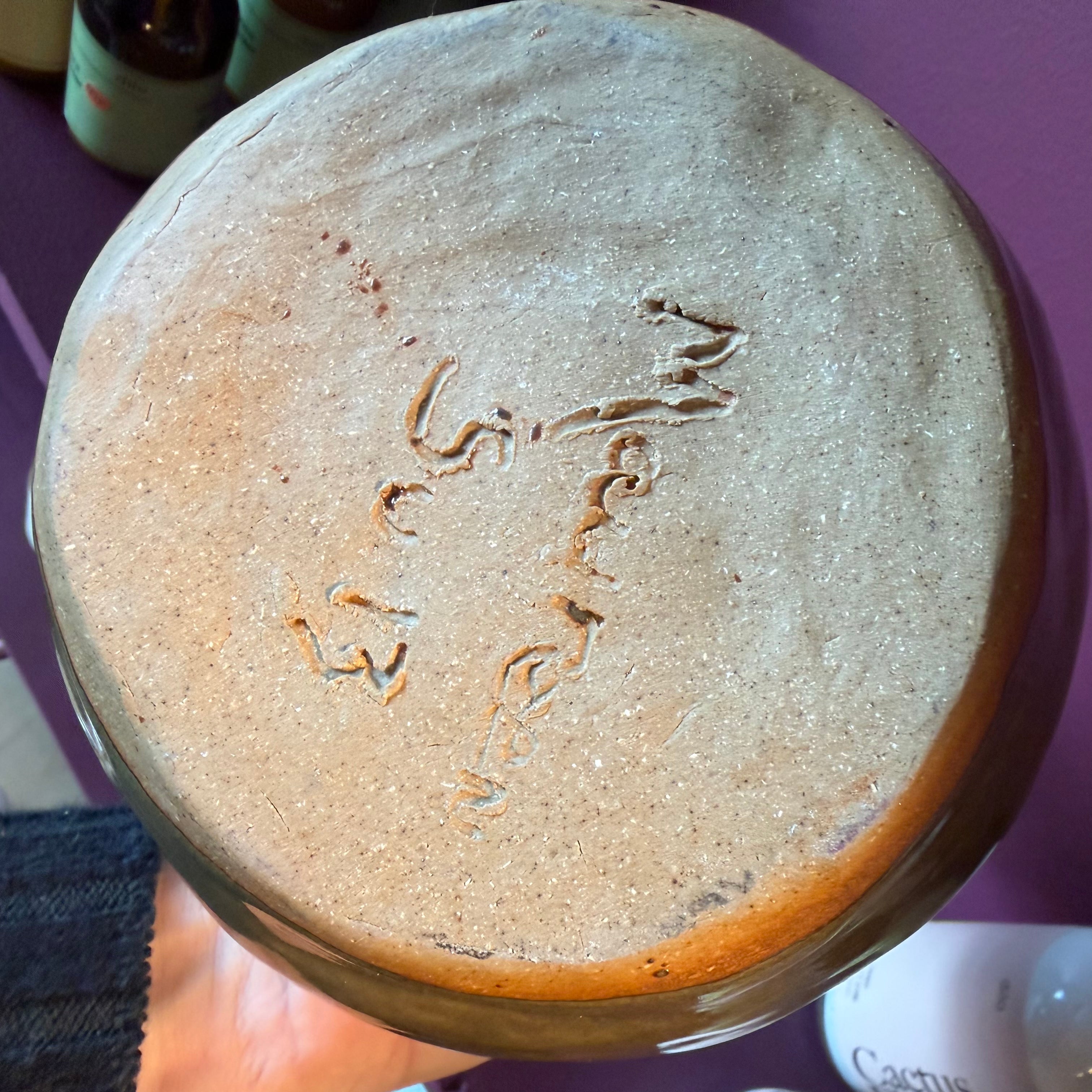 Clear glazed pottery vase with wraparound swirl detail, signed on underside. very heavy and sturdy!