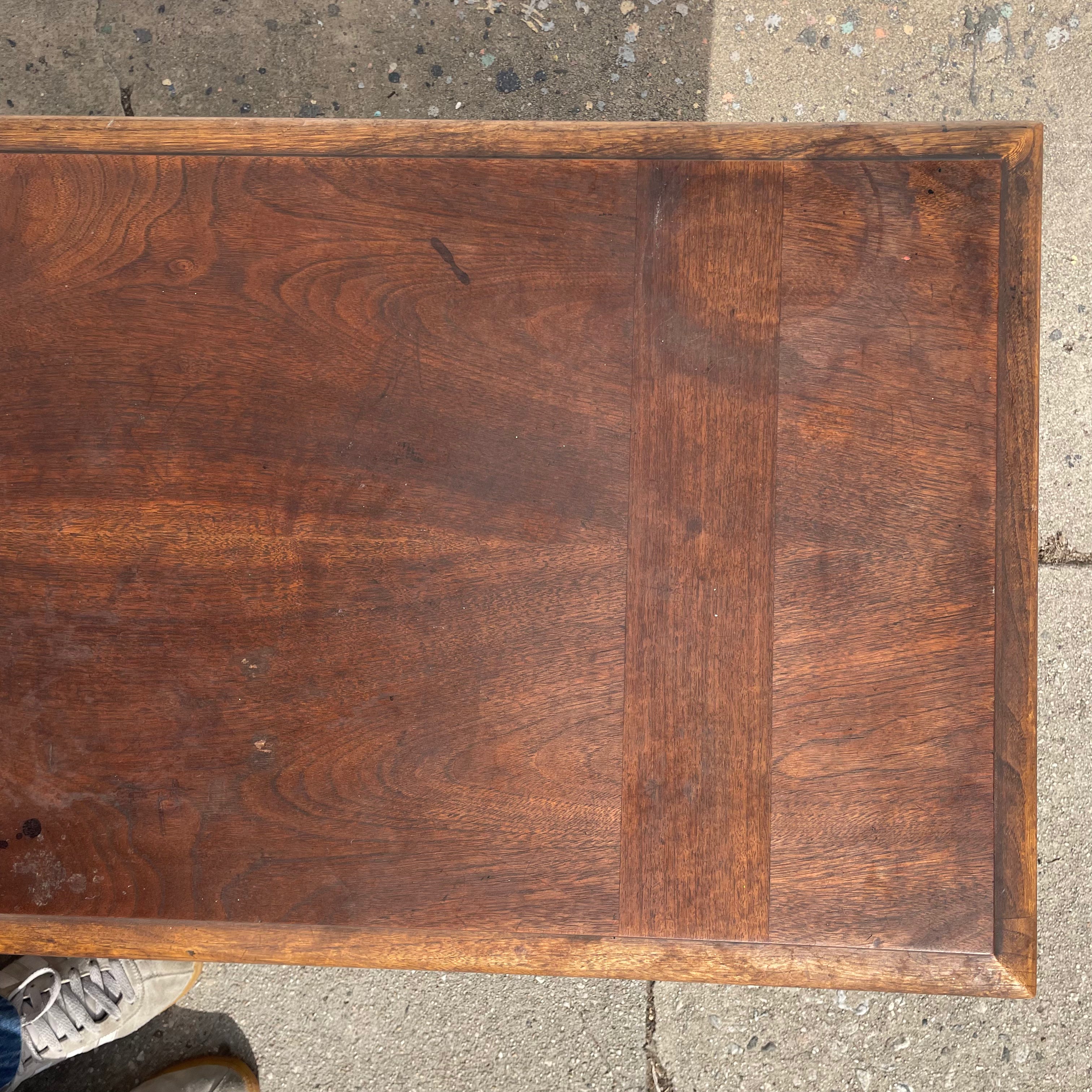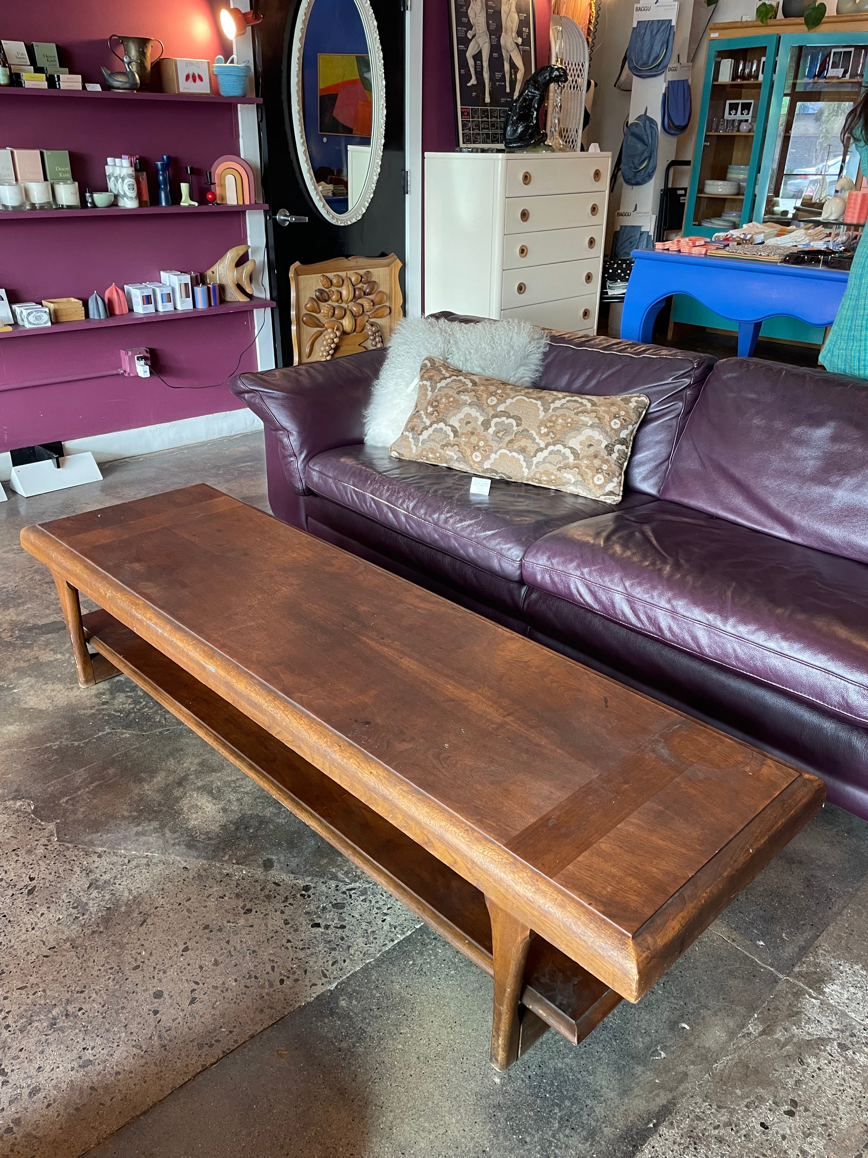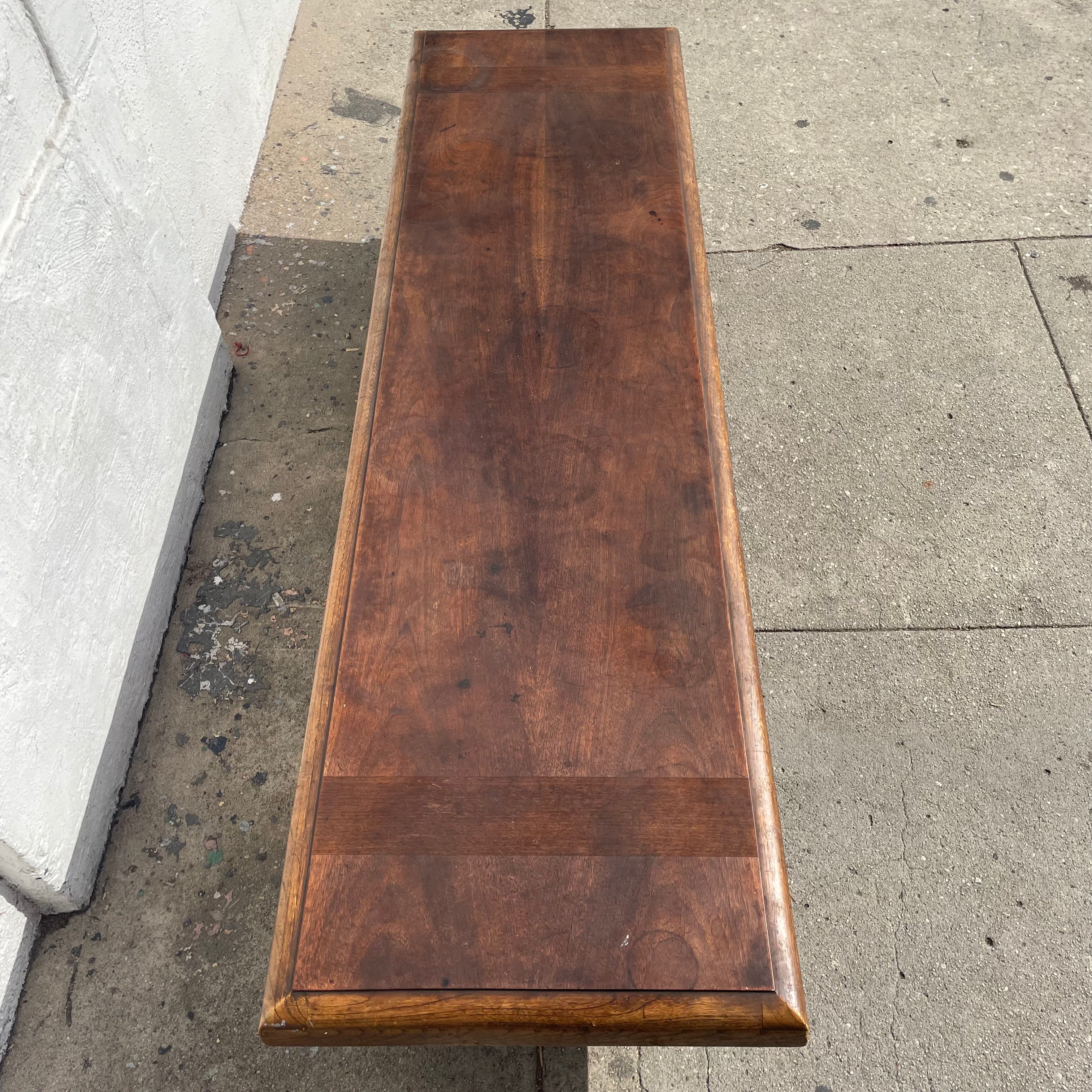 Solid walnut coffee table with shelf by Lane Furniture. Makers mark on underside. Very heavy and sturdy....doubles as a bench with added cushion.