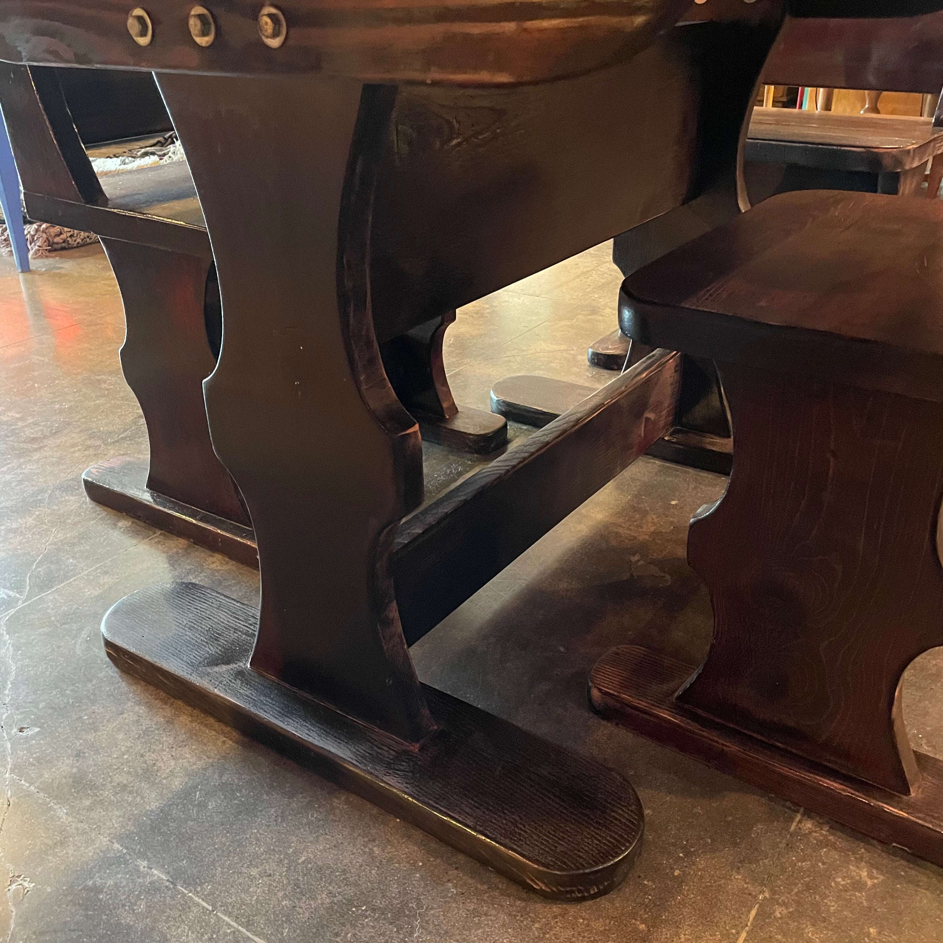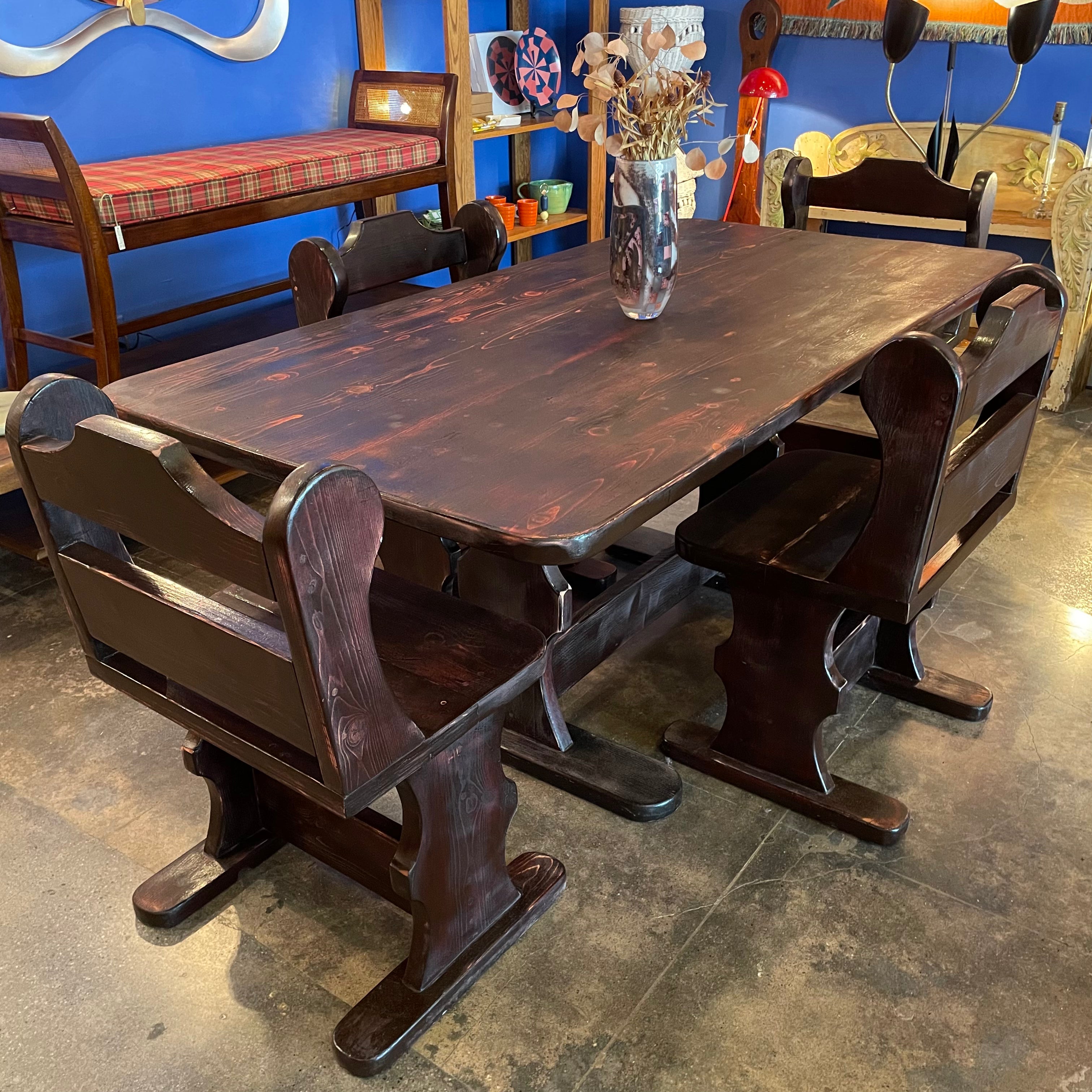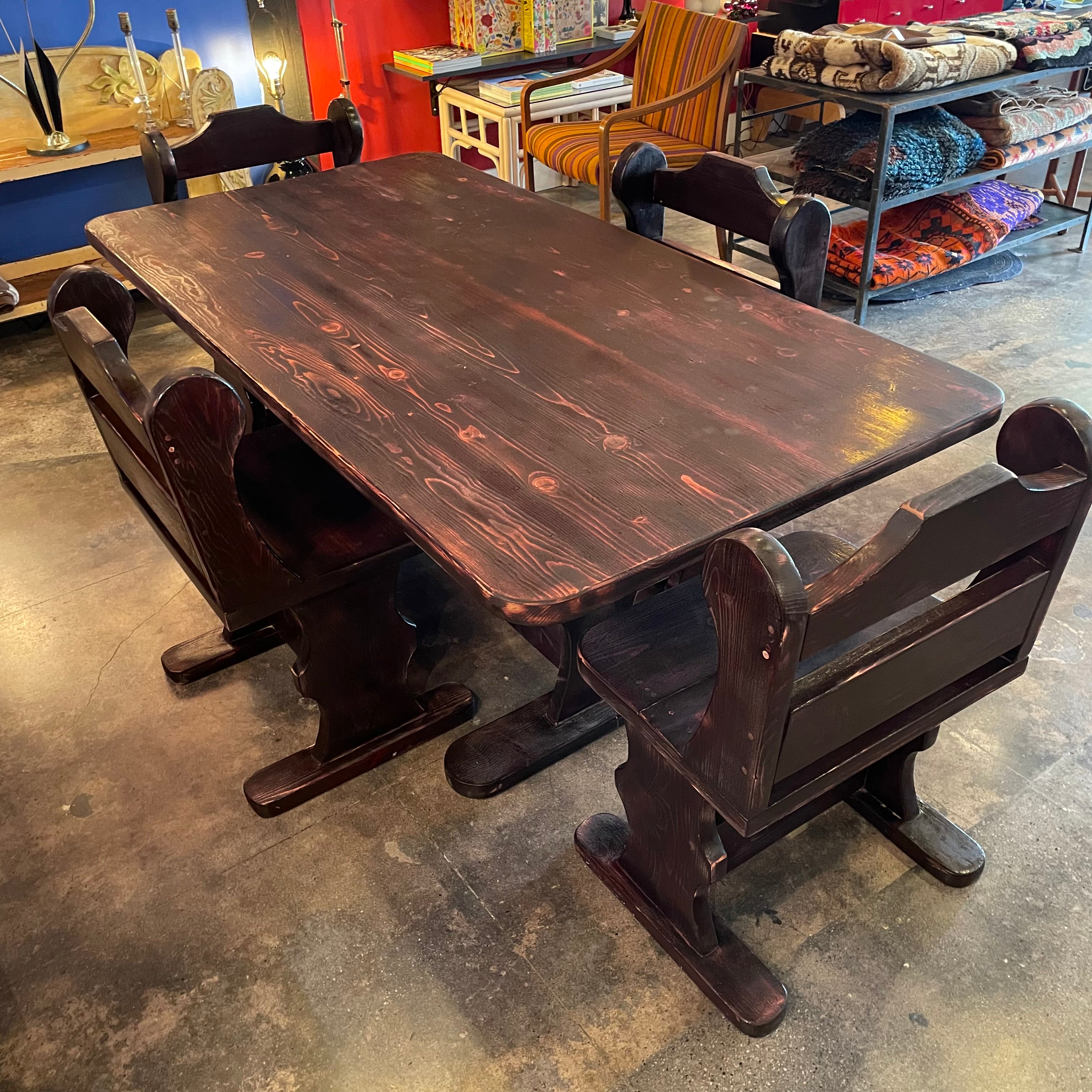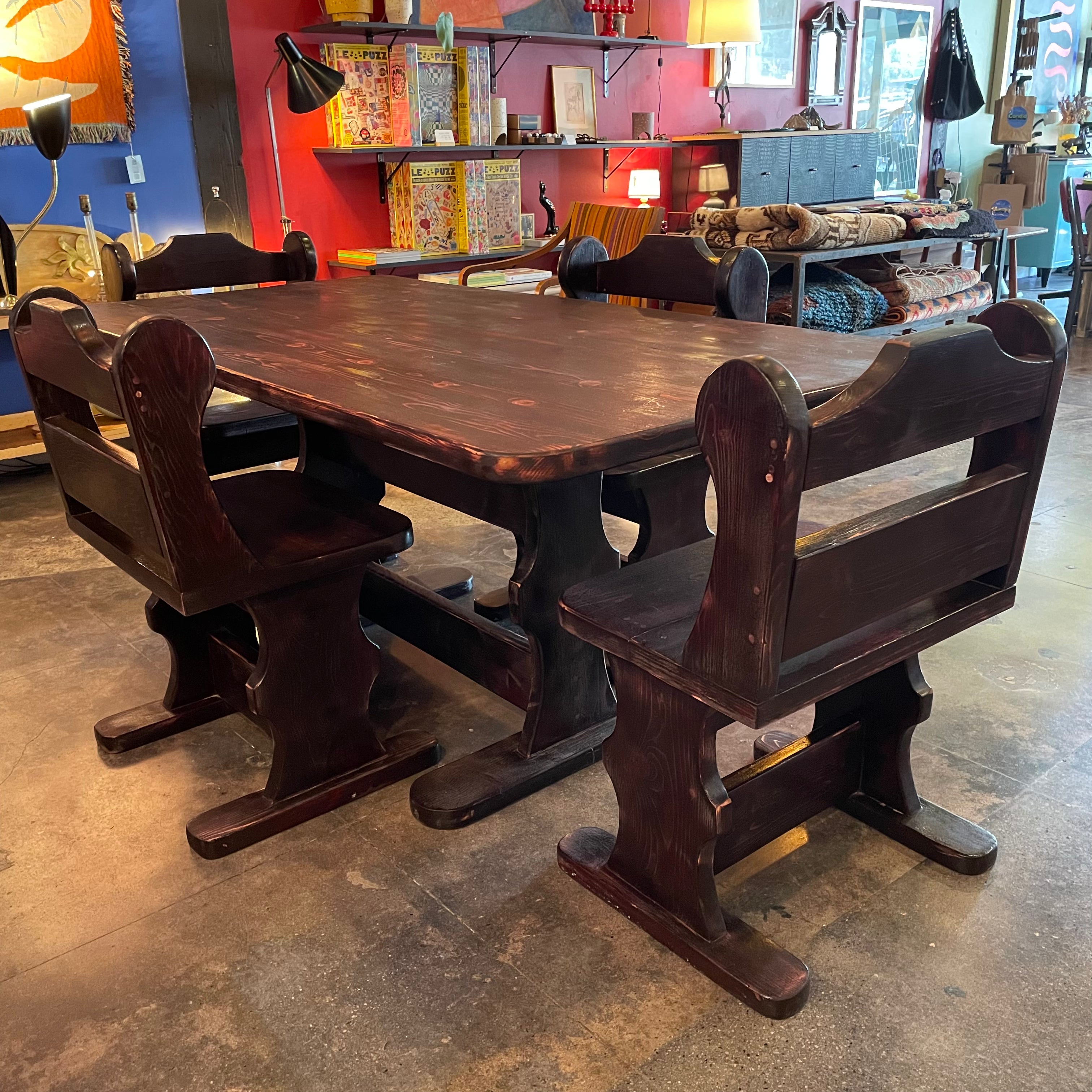 Rich aged, heavyweight, hand-made, knotty pine brutalist dining set. Table and four chairs made of heavy pine boards. The pine wood grain has a rustic feel, but works with midcentury modern or eclectic styles.